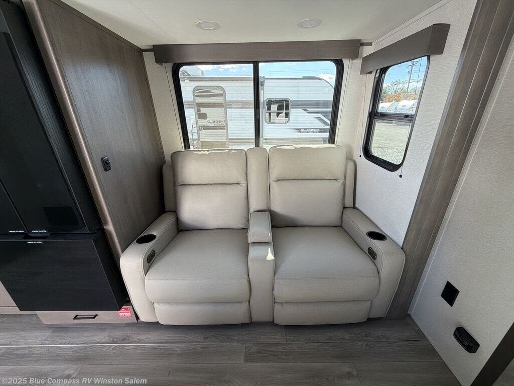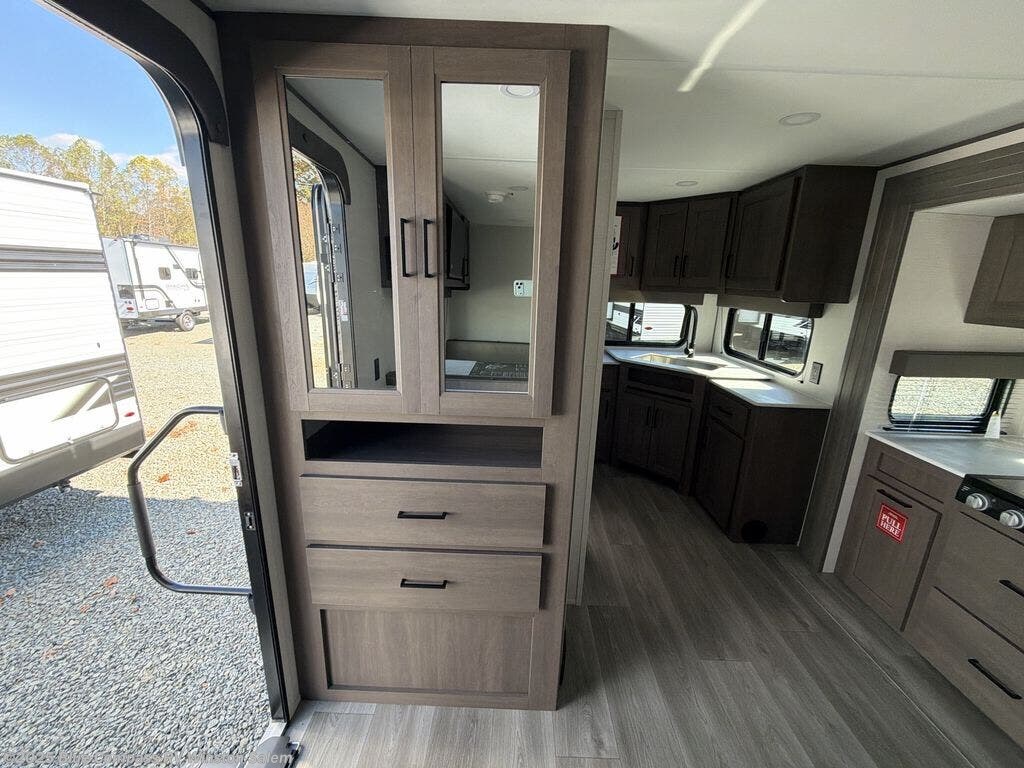 It will be so easy to enjoy camping trips in this travel trailer for five to six! The main living area is made spacious by the large slide out, and here you'll find the 60" sleeper sofa and the kitchen appliances. A booth dinette across the room provides a place to dine and play board games, or you can head outdoors to sit under the 17' power awning with LED lights. The queen bed in the front private bedroom will have you feeling right at home, and the TV prep here gives you the option to watch movies in bed. This model also includes a rear corner kitchen with ample counter space and a large sink, and you'll find the full bath in the other rear corner!