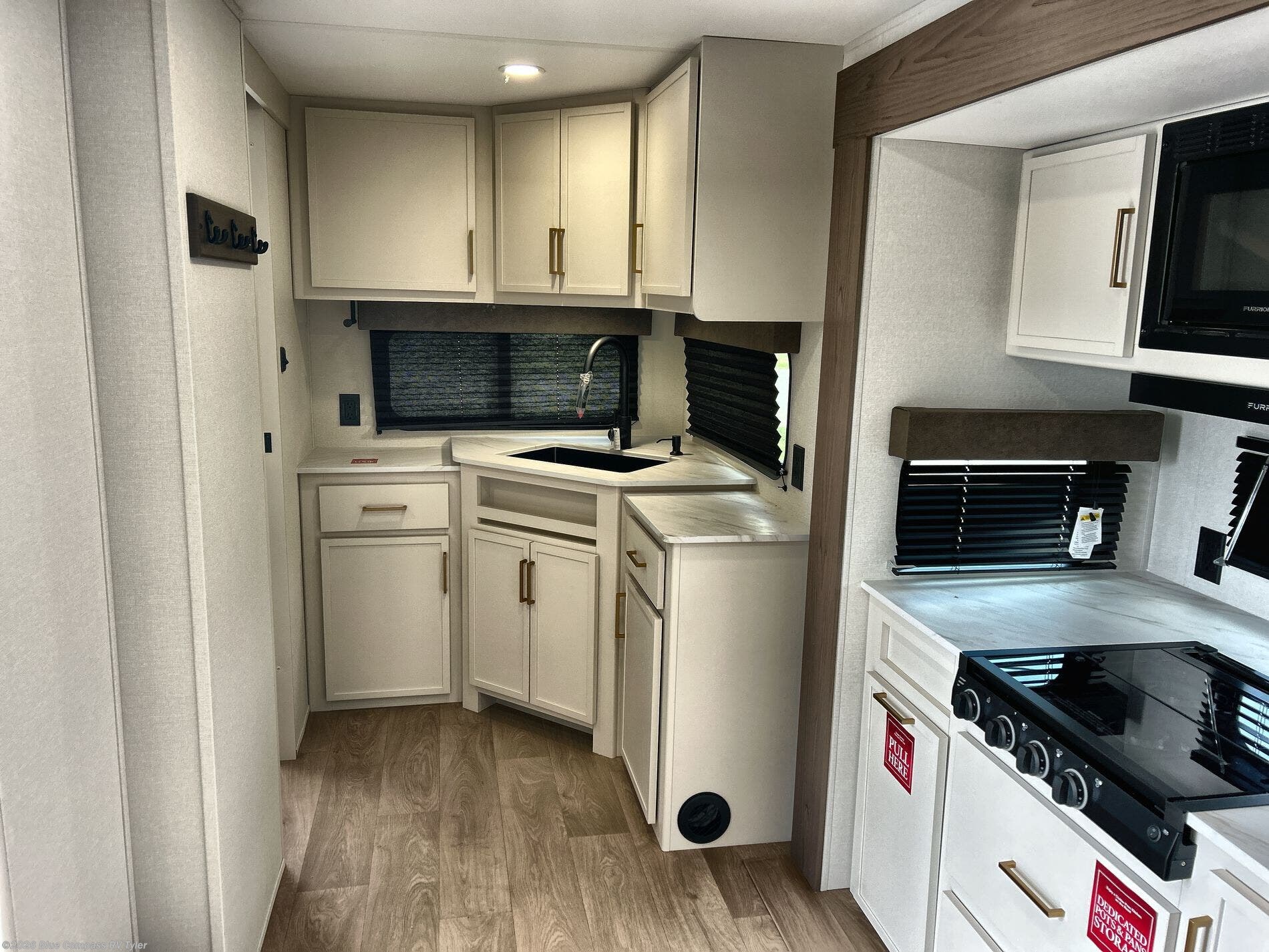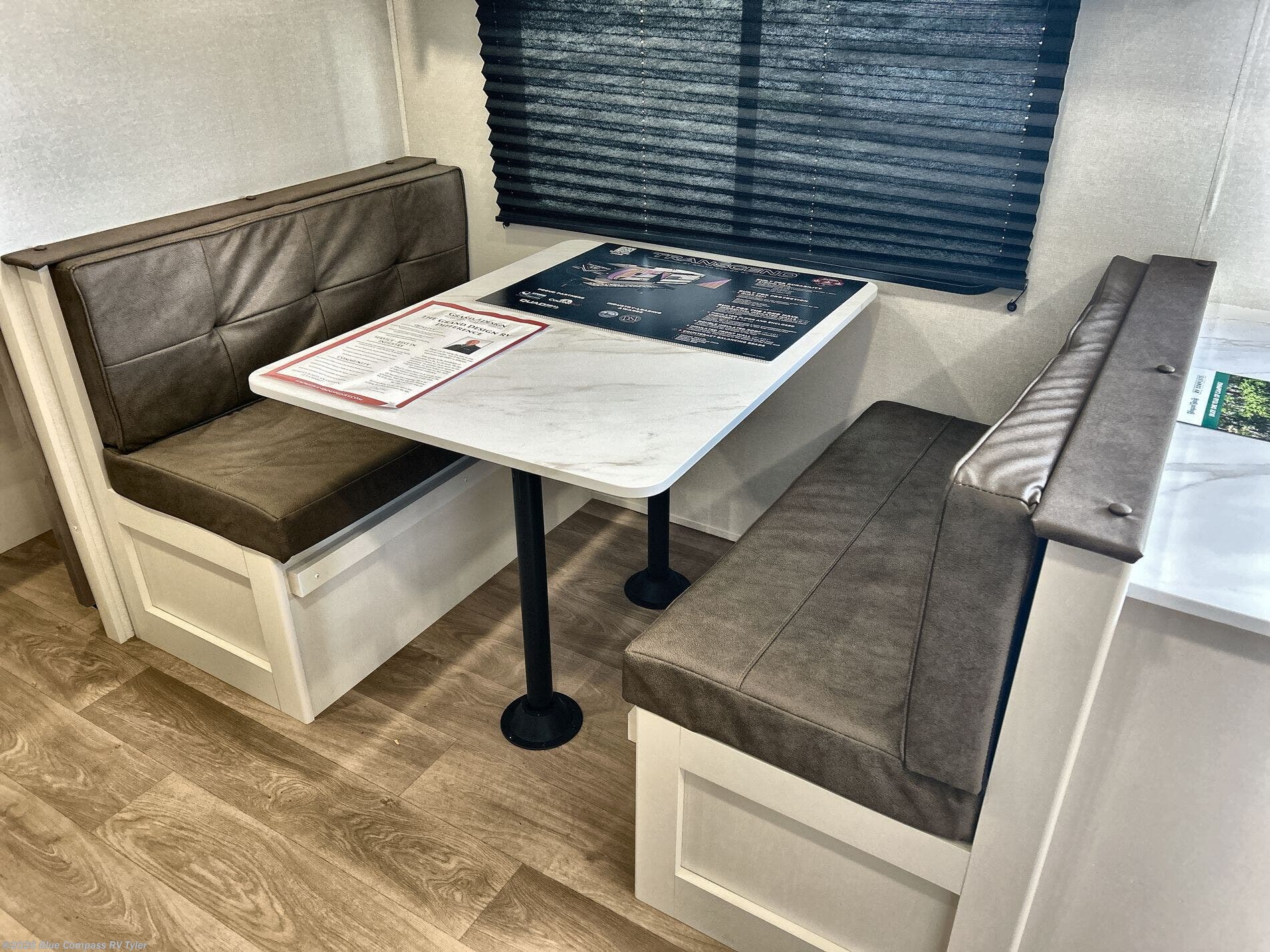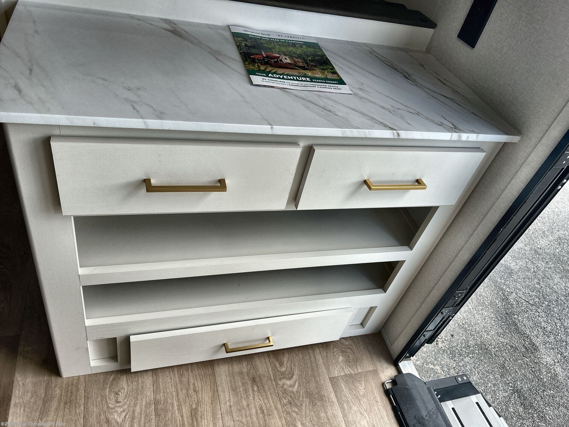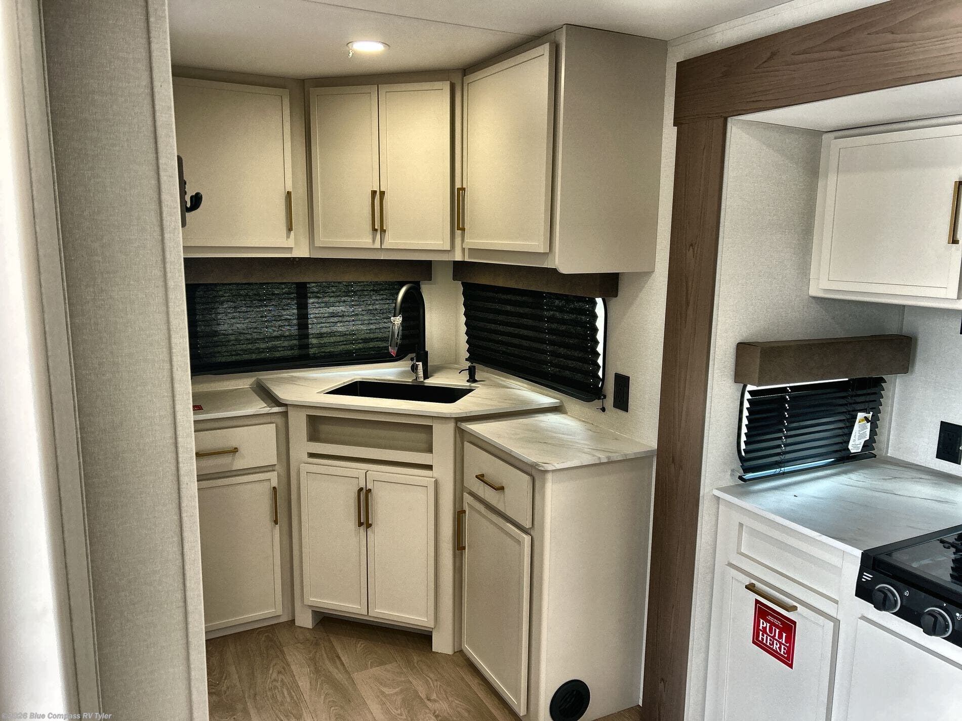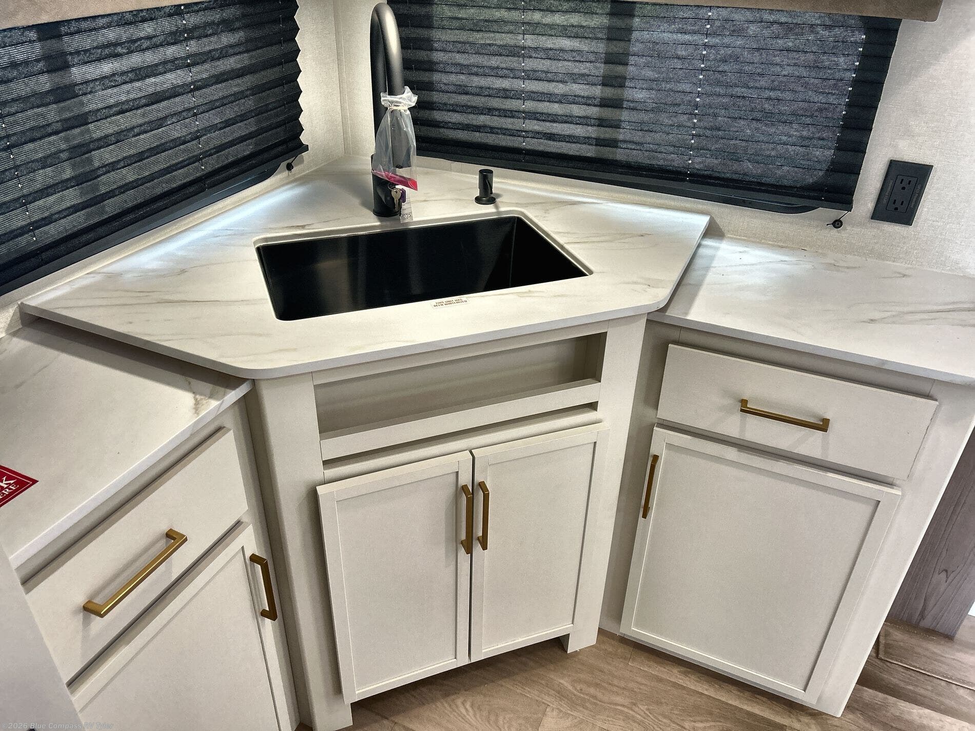 It will be so easy to enjoy camping trips in this travel trailer for five to six! The main living area is made spacious by the large slide out, and here you'll find the 60" sleeper sofa and the kitchen appliances. A booth dinette across the room provides a place to dine and play board games, or you can head outdoors to sit under the 17' power awning with LED lights. The queen bed in the front private bedroom will have you feeling right at home, and the TV prep here gives you the option to watch movies in bed. This model also includes a rear corner kitchen with ample counter space and a large sink, and you'll find the full bath in the other rear corner!