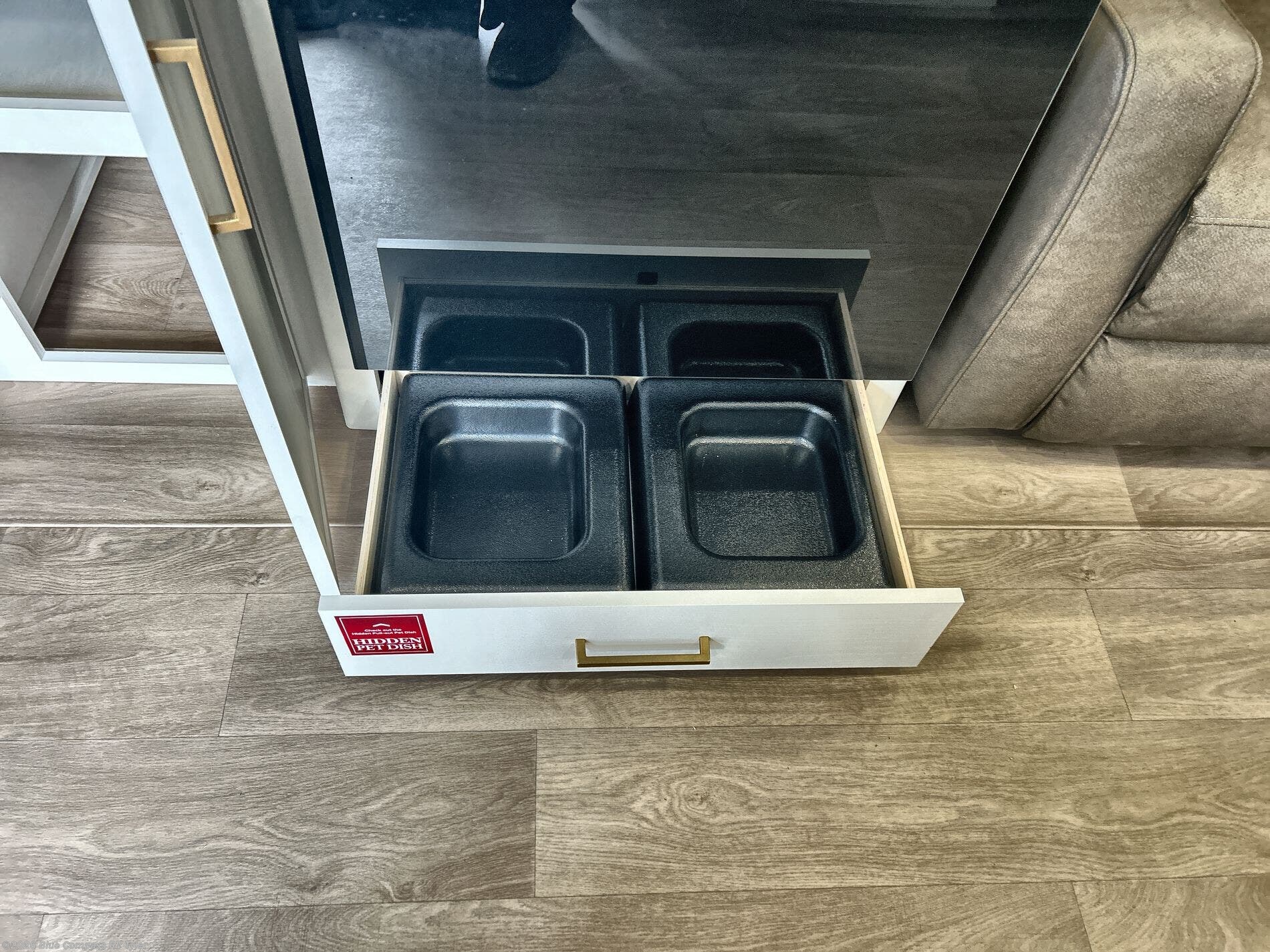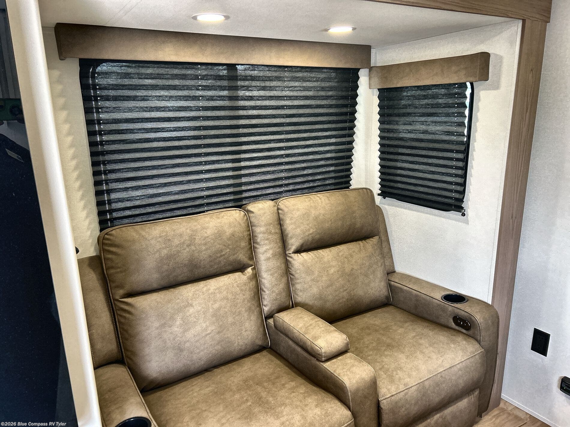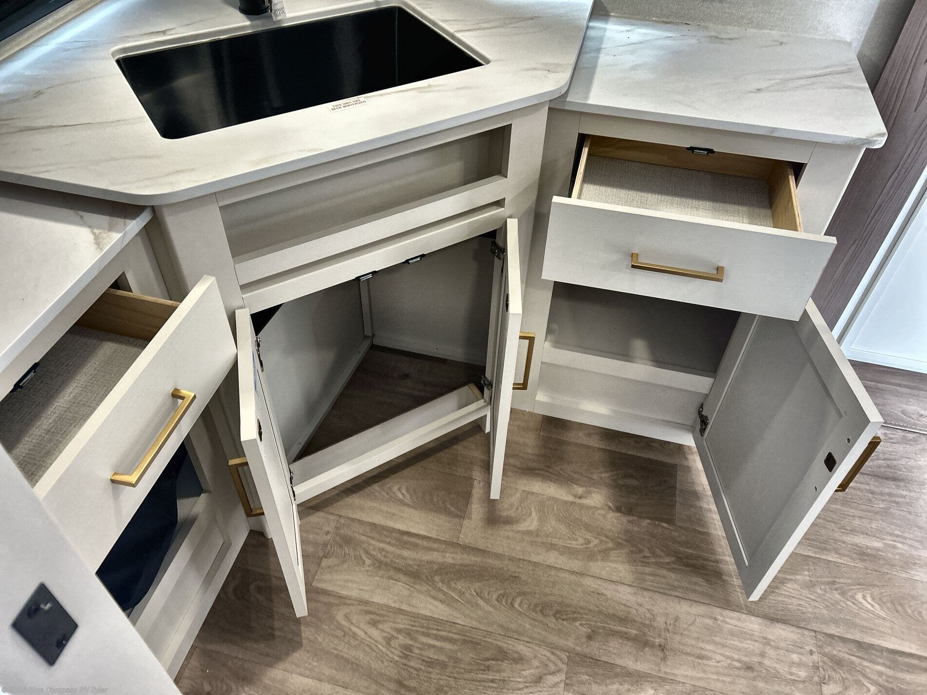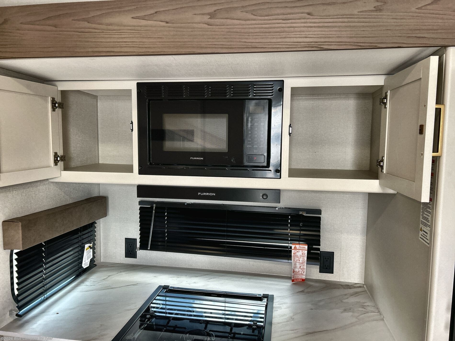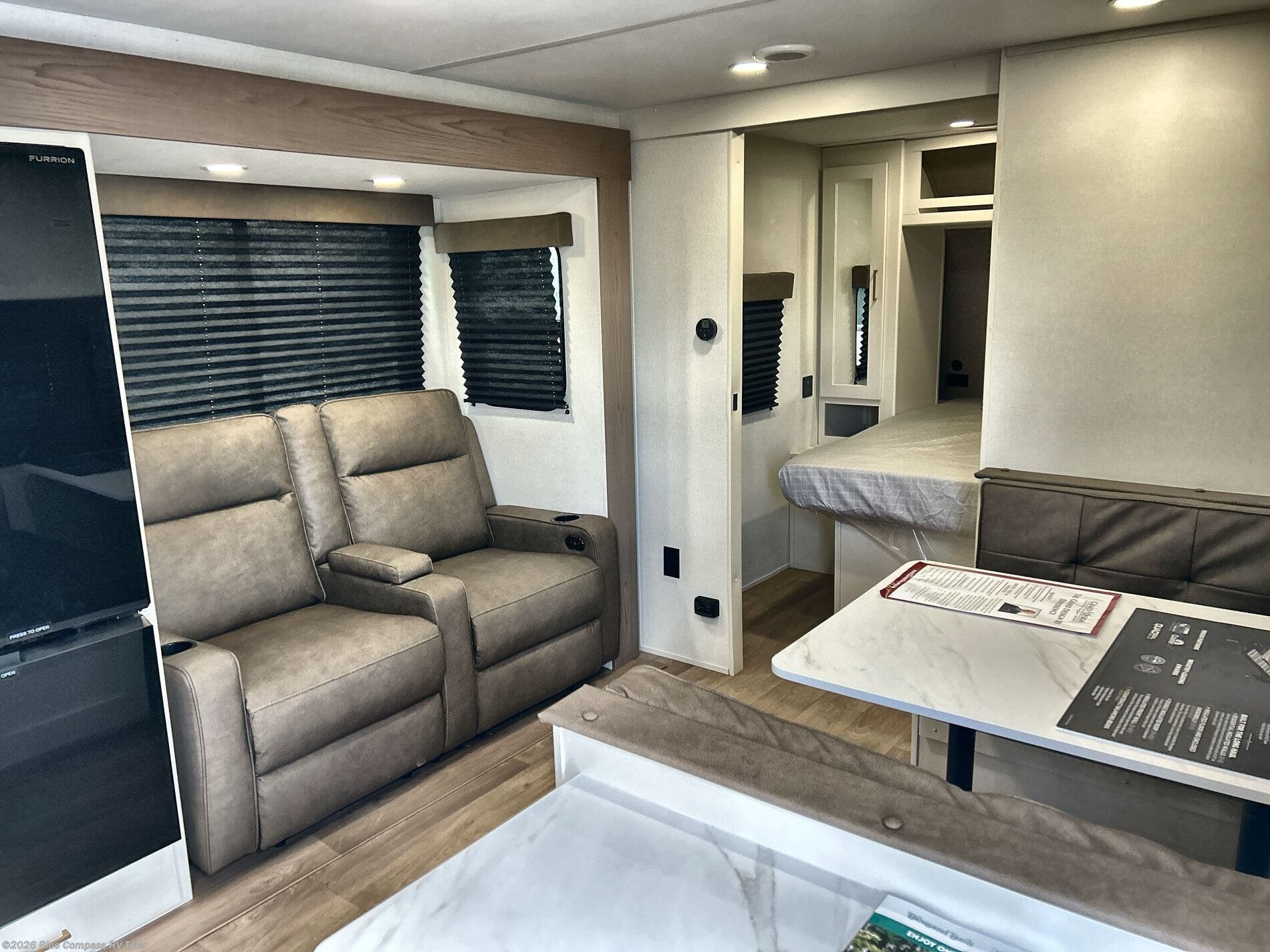 It will be so easy to enjoy camping trips in this travel trailer for five to six! The main living area is made spacious by the large slide out, and here you'll find the 60" sleeper sofa and the kitchen appliances. A booth dinette across the room provides a place to dine and play board games, or you can head outdoors to sit under the 17' power awning with LED lights. The queen bed in the front private bedroom will have you feeling right at home, and the TV prep here gives you the option to watch movies in bed. This model also includes a rear corner kitchen with ample counter space and a large sink, and you'll find the full bath in the other rear corner!