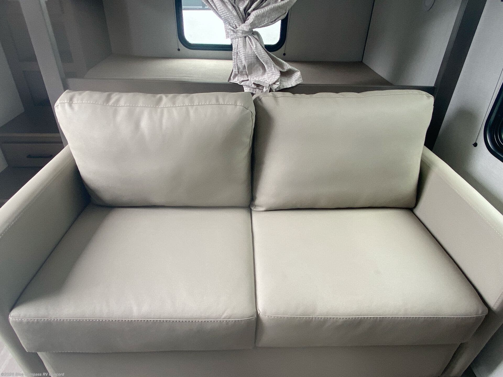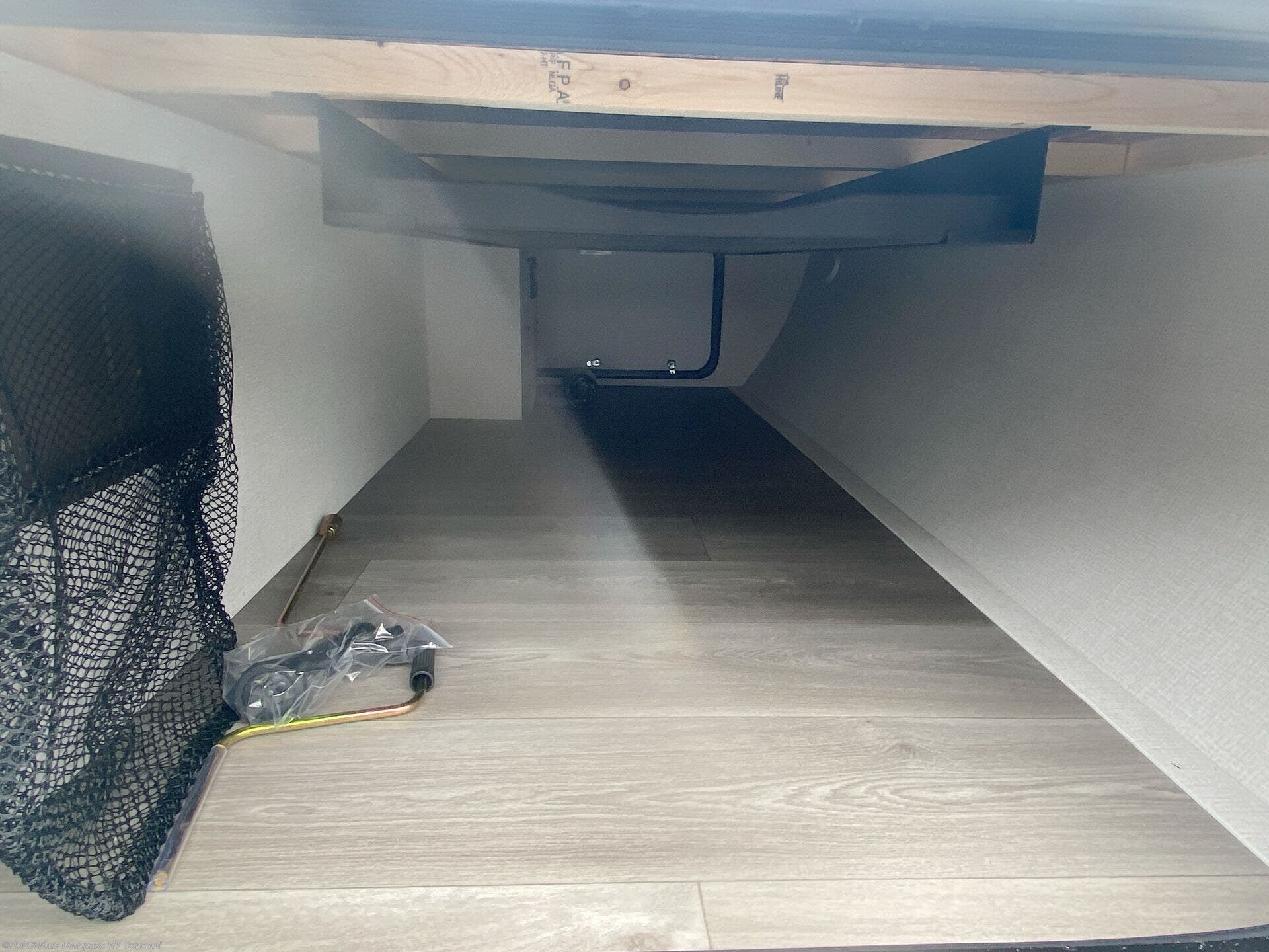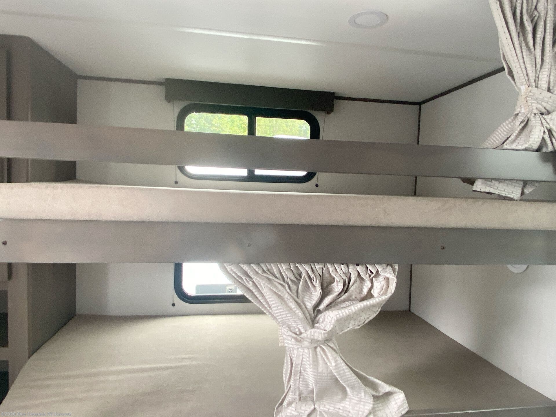 Trips to the lake are made comfortable in this triple slide out fifth wheel. Once you arrive at the campground, set up the two power awnings with LED lights, and there is an exterior TV for the big game. Head inside to relax on the theater seats directly across from the TV and fireplace, or play a game at the roll-top dinette. The chef of your group will love this kitchen with its residential refrigerator, kitchen island, and pantry, plus additional storage for canned goods or paper products. The full bath will allow you to stay clean throughout your trip, and you'll find a residential style backsplash in the bath, plus a walk-in shower. Nothing says luxury like your own king bed slide out in the front bedroom, a large front closet with hamper and drawers for wrinkle-free clothes, and a flip-up dresser featuring a 32" TV!
