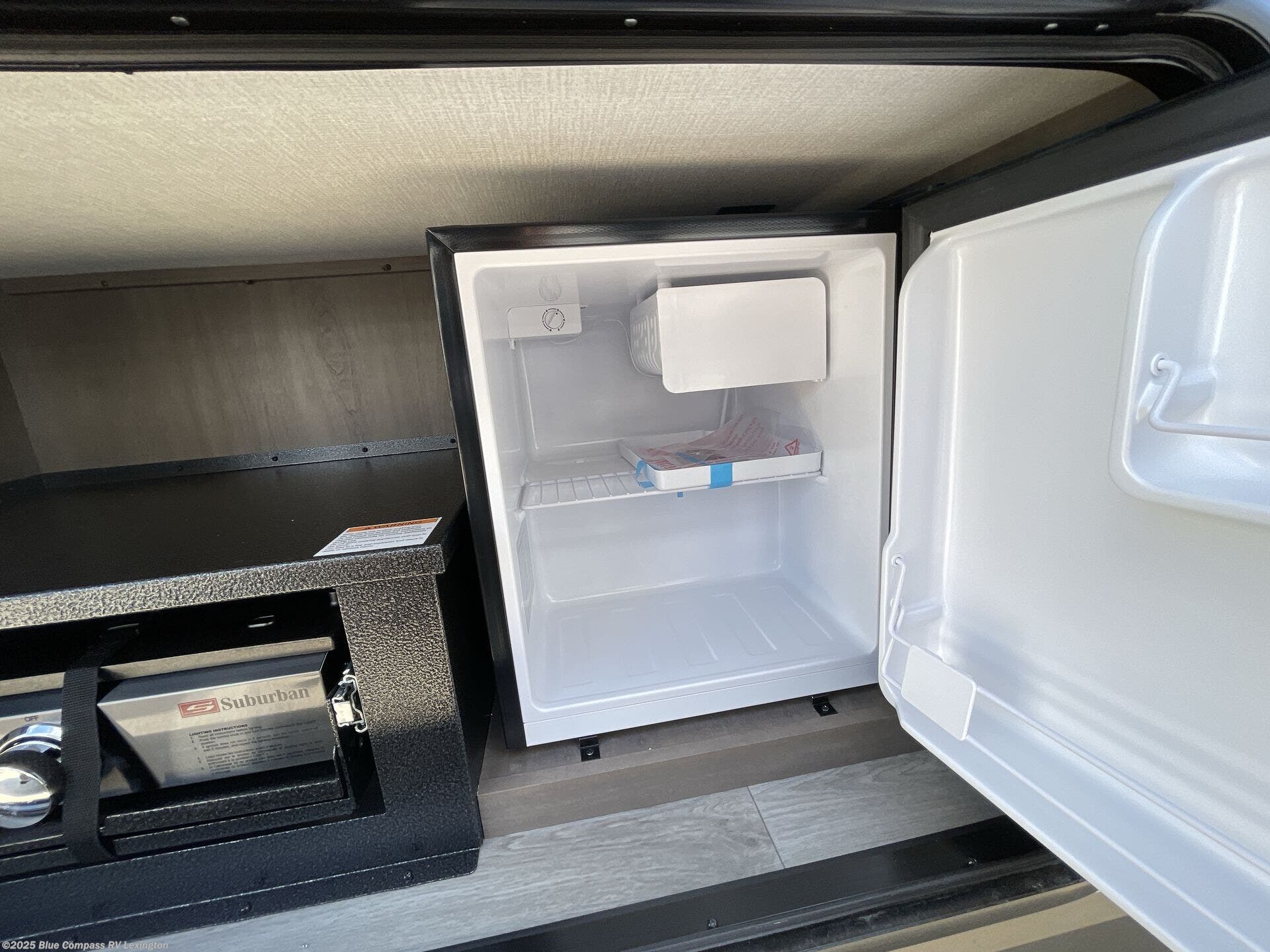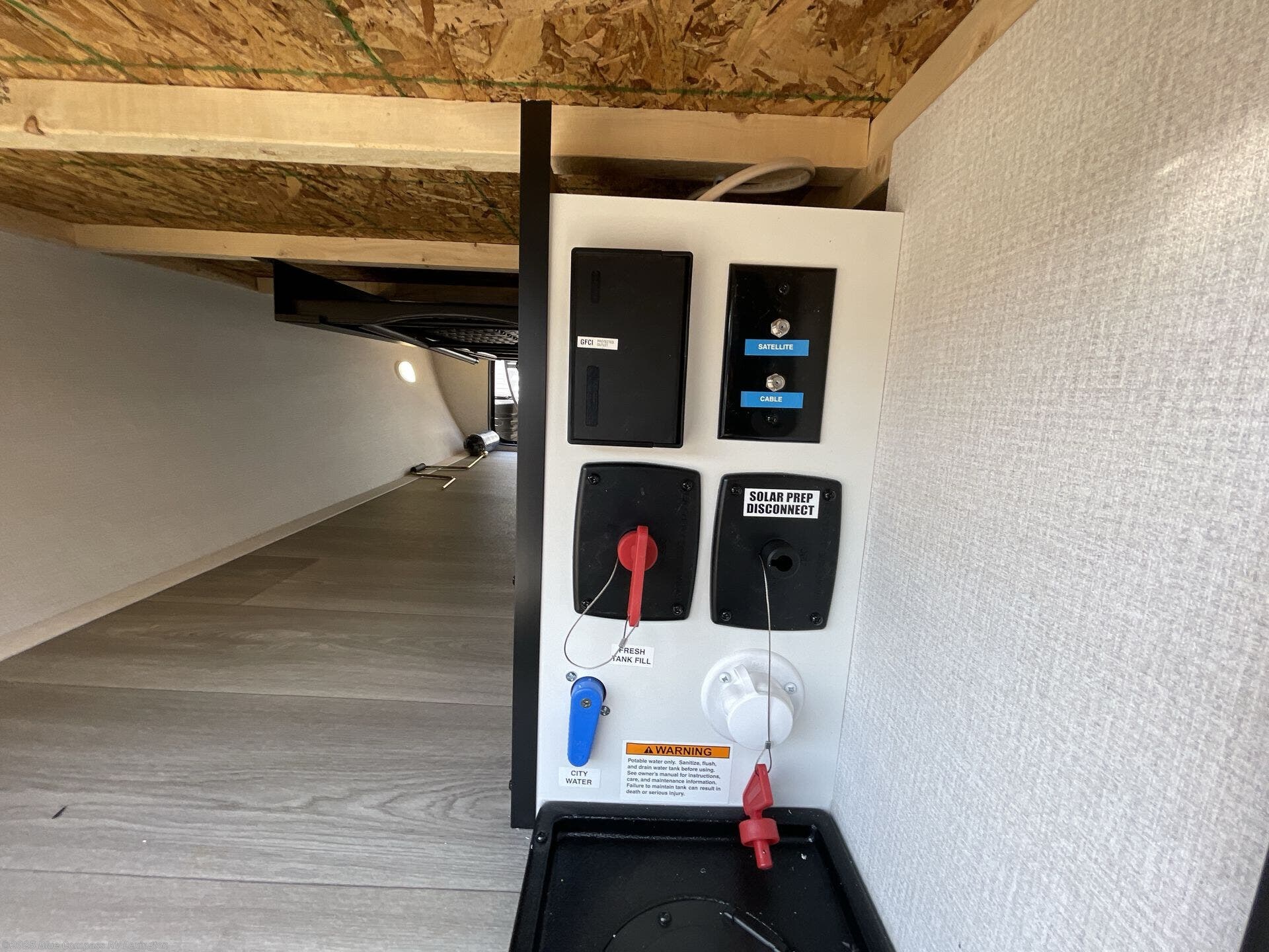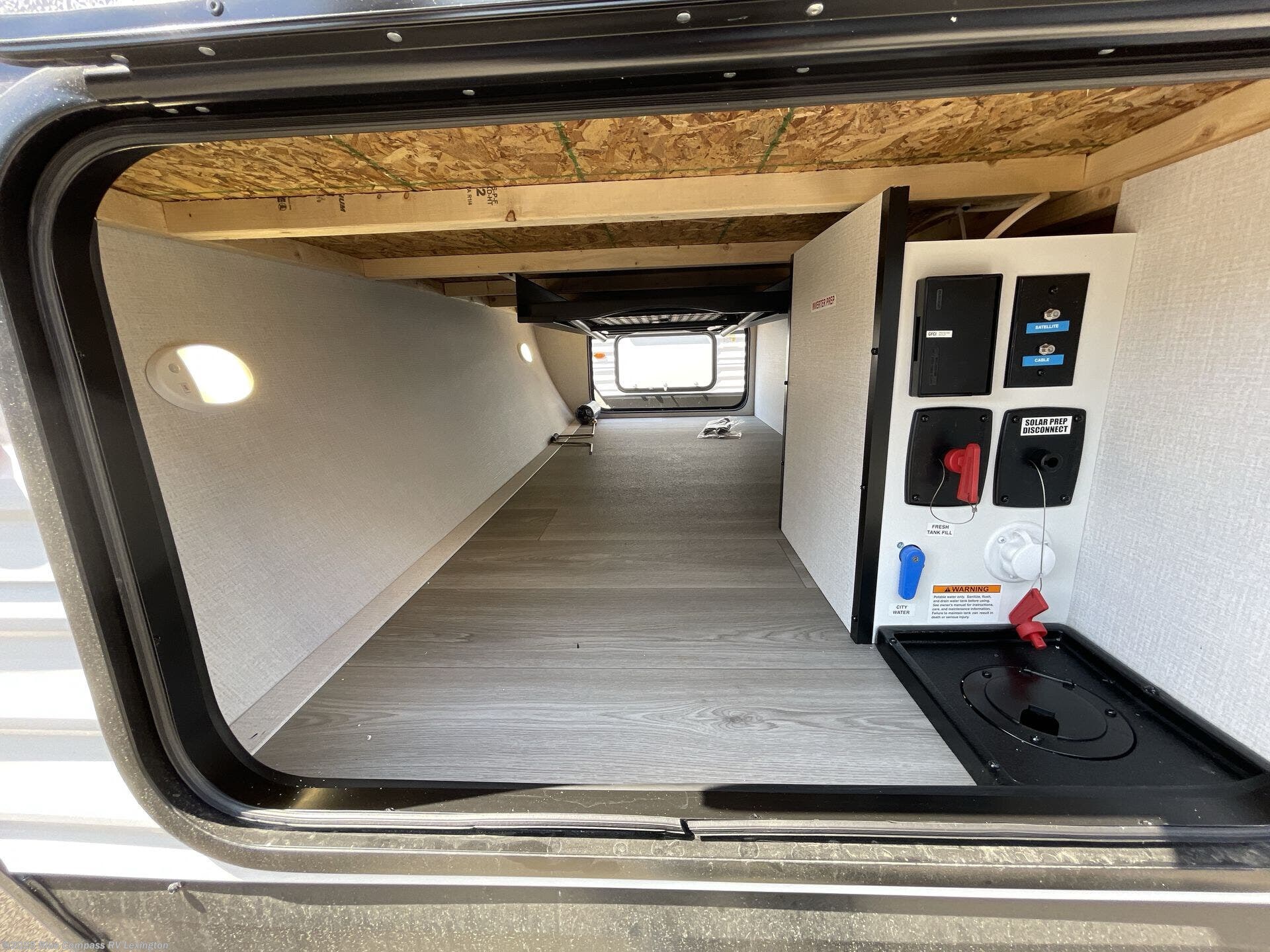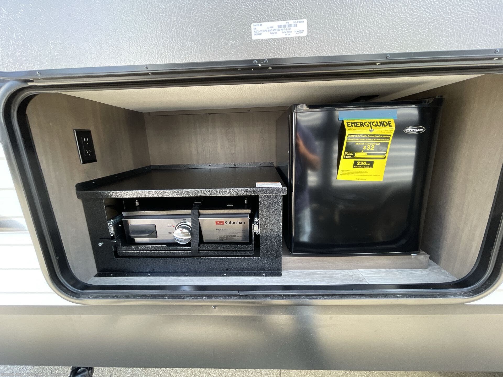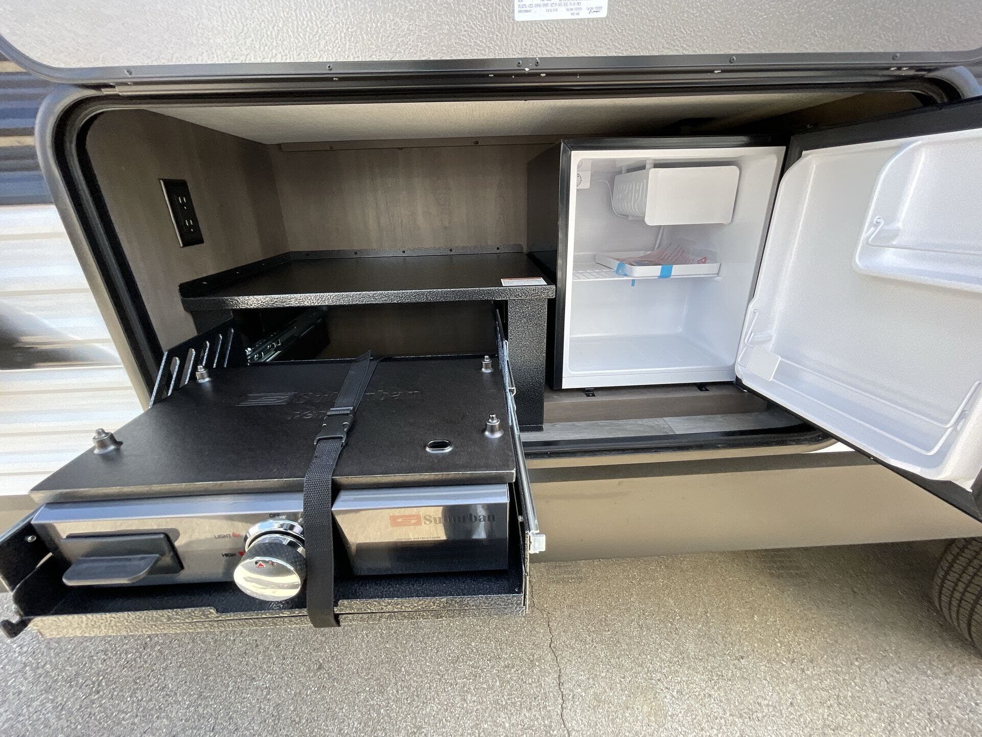 Camping with your larger family or when you want to take along a few extra friends is easy with this trailer. This unit sleeps nine with the double-size bunks in the rear corner, the 60" roll over sofa, and the queen bed in the front semi-private bedroom. The booth dinette can also be used to sleep a guest or two little ones at night once converted. Prepare your meals on the three-burner cooktop indoors, or out on the two-burner cooktop at the outside kitchen! You'll also find a handy exterior spray port and an outdoor refrigerator for cold drinks! It will be so easy to fill the dog's food bowl with the added pet dish under the refrigerator, and the full bath in this model means you don't have to use the camp's facilities. Having a 17' awning outside along with a large unobstructed pass-through compartment allows you extended living outdoors and plenty of space for all of your gear!