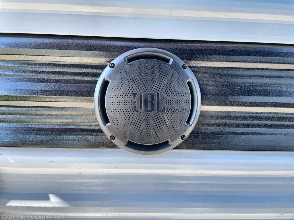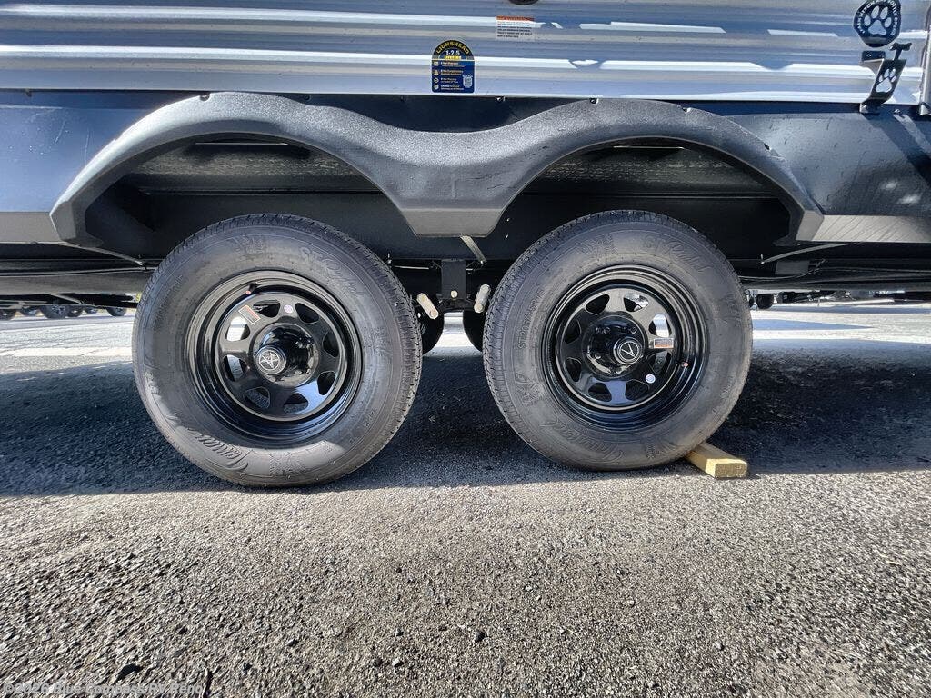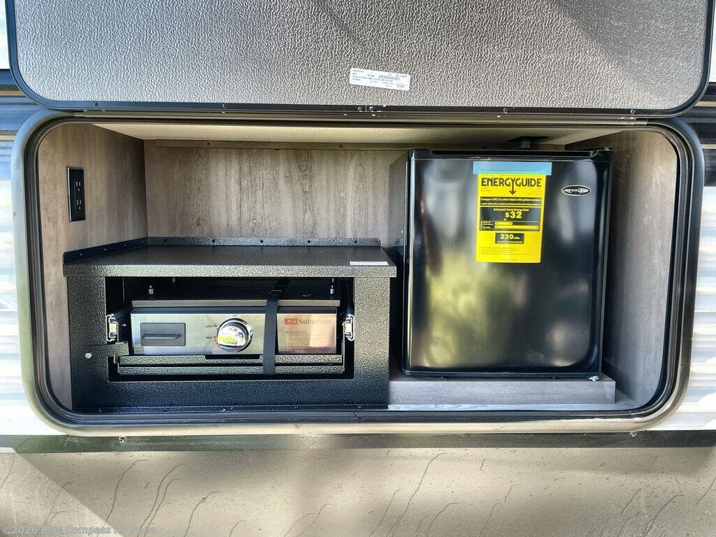 Camping with your larger family or when you want to take along a few extra friends is easy with this trailer. This unit sleeps nine with the double-size bunks in the rear corner, the 60" roll over sofa, and the queen bed in the front semi-private bedroom. The booth dinette can also be used to sleep a guest or two little ones at night once converted. Prepare your meals on the three-burner cooktop indoors, or out on the two-burner cooktop at the outside kitchen! You'll also find a handy exterior spray port and an outdoor refrigerator for cold drinks! It will be so easy to fill the dog's food bowl with the added pet dish under the refrigerator, and the full bath in this model means you don't have to use the camp's facilities. Having a 17' awning outside along with a large unobstructed pass-through compartment allows you extended living outdoors and plenty of space for all of your gear!