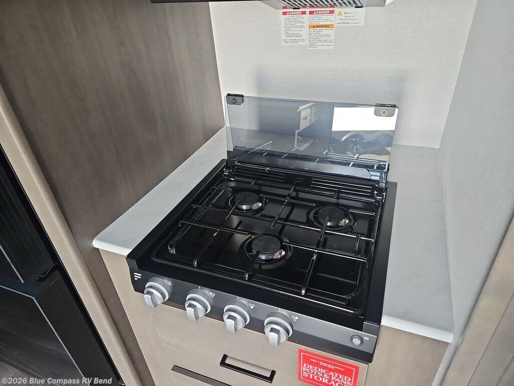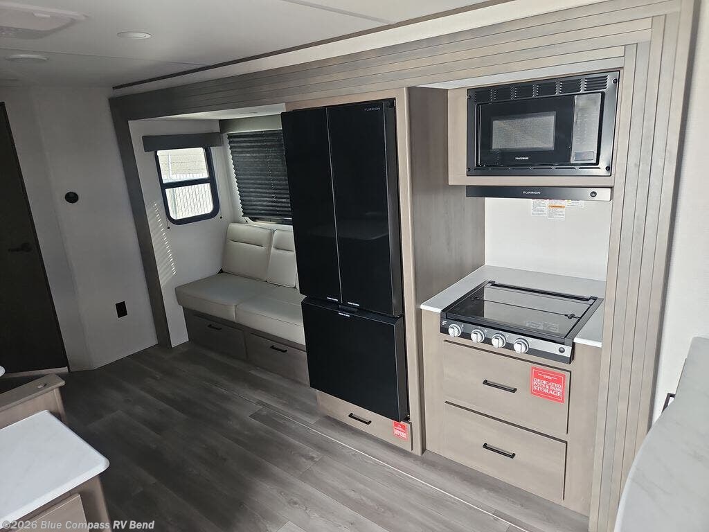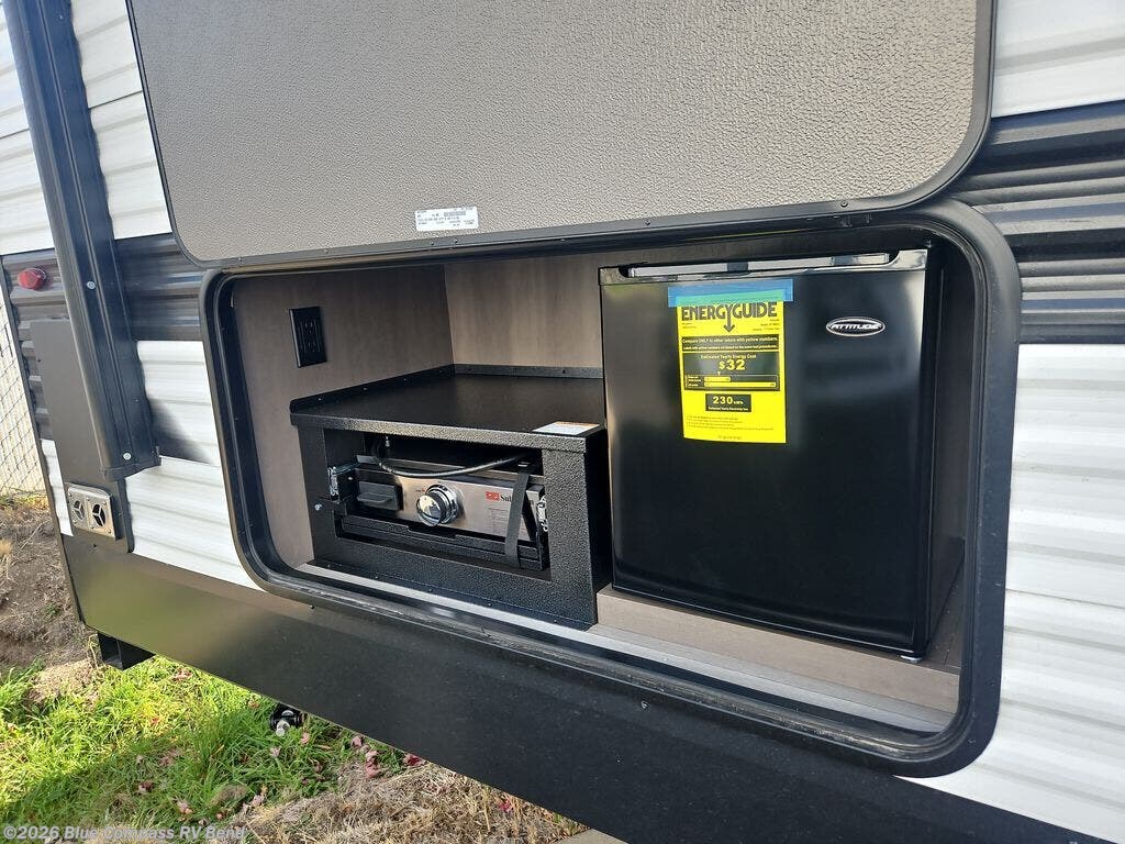 Camping with your larger family or when you want to take along a few extra friends is easy with this trailer. This unit sleeps nine with the double-size bunks in the rear corner, the 60" roll over sofa, and the queen bed in the front semi-private bedroom. The booth dinette can also be used to sleep a guest or two little ones at night once converted. Prepare your meals on the three-burner cooktop indoors, or out on the two-burner cooktop at the outside kitchen! You'll also find a handy exterior spray port and an outdoor refrigerator for cold drinks! It will be so easy to fill the dog's food bowl with the added pet dish under the refrigerator, and the full bath in this model means you don't have to use the camp's facilities. Having a 17' awning outside along with a large unobstructed pass-through compartment allows you extended living outdoors and plenty of space for all of your gear!