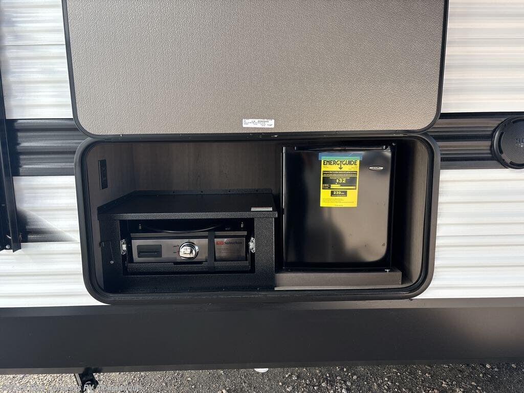 Camping with your larger family or when you want to take along a few extra friends is easy with this trailer. This unit sleeps nine with the double-size bunks in the rear corner, the 60" roll over sofa, and the queen bed in the front semi-private bedroom. The booth dinette can also be used to sleep a guest or two little ones at night once converted. Prepare your meals on the three-burner cooktop indoors, or out on the two-burner cooktop at the outside kitchen! You'll also find a handy exterior spray port and an outdoor refrigerator for cold drinks! It will be so easy to fill the dog's food bowl with the added pet dish under the refrigerator, and the full bath in this model means you don't have to use the camp's facilities. Having a 17' awning outside along with a large unobstructed pass-through compartment allows you extended living outdoors and plenty of space for all of your gear!