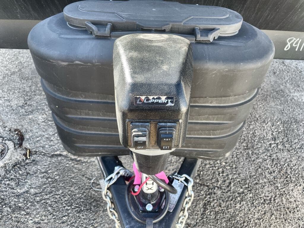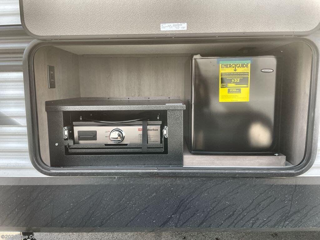 Camping with your larger family or when you want to take along a few extra friends is easy with this trailer. This unit sleeps nine with the double-size bunks in the rear corner, the 60" roll over sofa, and the queen bed in the front semi-private bedroom. The booth dinette can also be used to sleep a guest or two little ones at night once converted. Prepare your meals on the three-burner cooktop indoors, or out on the two-burner cooktop at the outside kitchen! You'll also find a handy exterior spray port and an outdoor refrigerator for cold drinks! It will be so easy to fill the dog's food bowl with the added pet dish under the refrigerator, and the full bath in this model means you don't have to use the camp's facilities. Having a 17' awning outside along with a large unobstructed pass-through compartment allows you extended living outdoors and plenty of space for all of your gear!