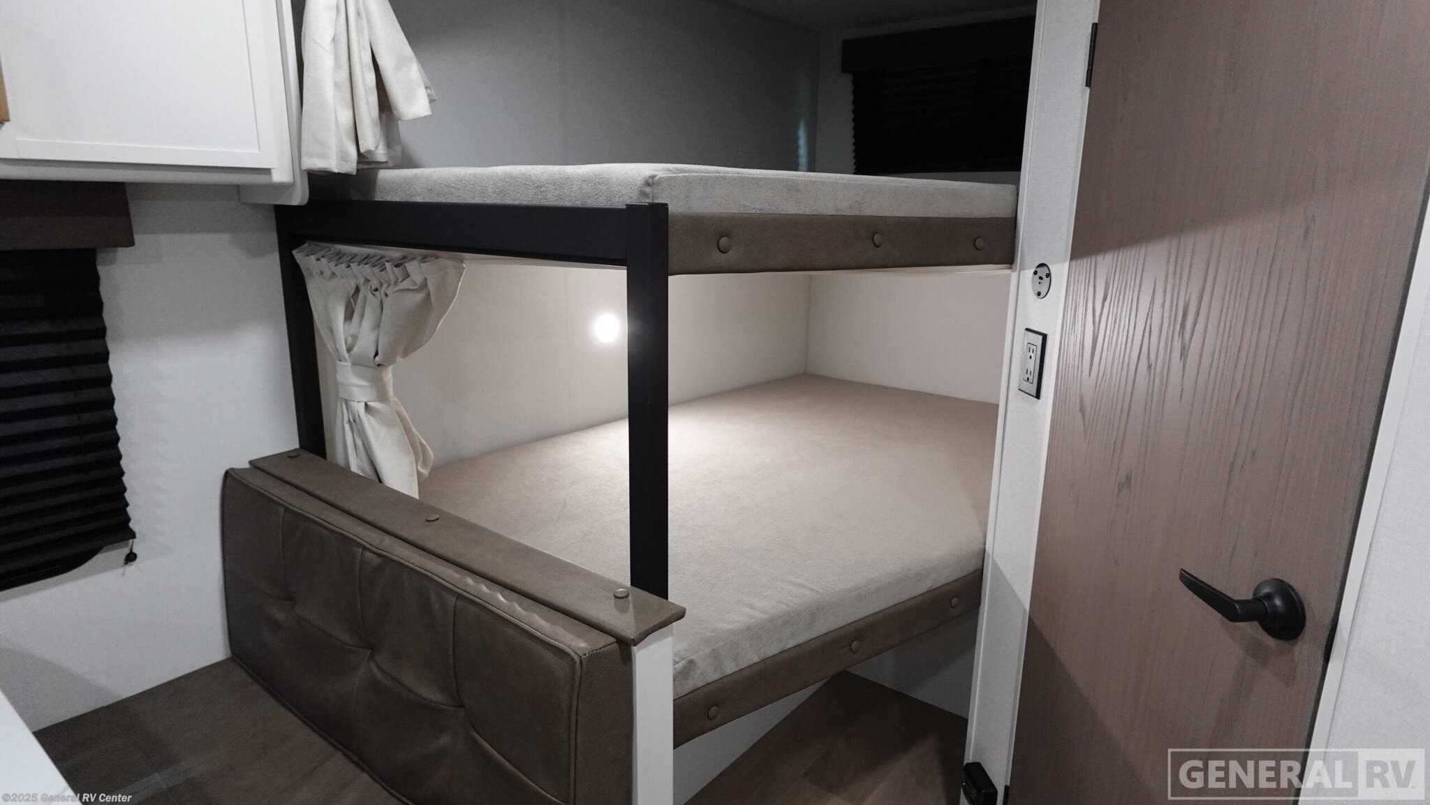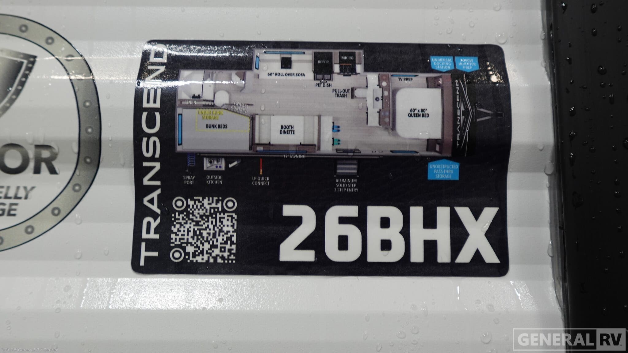 Discover the 2026 Grand Design Transcend Xplor 26BHX, a travel trailer that effortlessly combines style, comfort, and functionality for your adventures. With a length of just over 30 feet, this RV is designed to accommodate up to 10 sleepers, making it perfect for family trips or gatherings with friends. The front bedroom features a cozy queen bed, ensuring restful nights, while the bunkhouse at the rear provides additional sleeping space with double beds. The versatile convertible seating options, including a booth dinette and a 60" roll-over sofa, offer both relaxation and extra sleeping capacity. The center kitchen is equipped with a full-size electric refrigerator and a three-burner cooktop, making meal preparation a breeze. Enjoy the convenience of the outside kitchen for alfresco dining under the 17-foot powered retractable awning. The thoughtfully designed floorplan includes a rear bath with a shower curtain, ensuring privacy and comfort. With ample storage options, including under-bunk storage and unobstructed pass-thru storage, you'll have plenty of room for all your gear. Plus, the 2000W inverter prep and universal docking station enhance your camping experience with modern conveniences. Whether you're exploring the countryside or setting up at a favorite campsite, the Transcend Xplor 26BHX is your ideal home on wheels. For more details or to experience this RV firsthand, visit your nearest General RV Dealership.