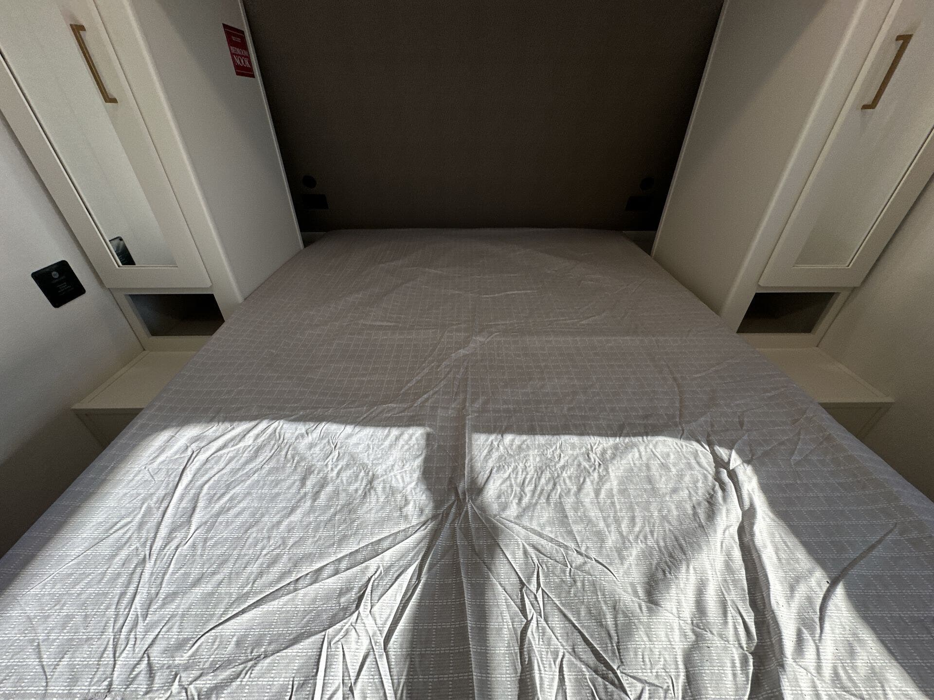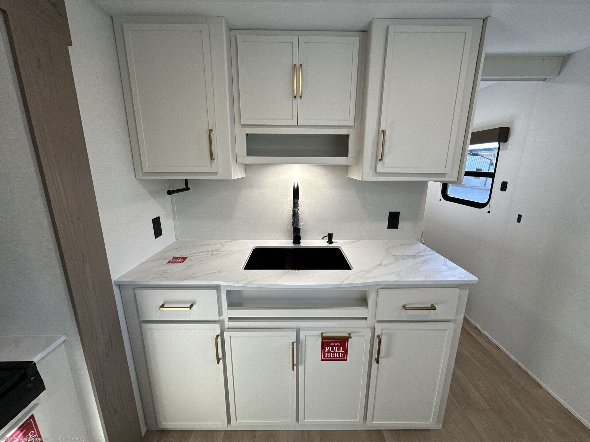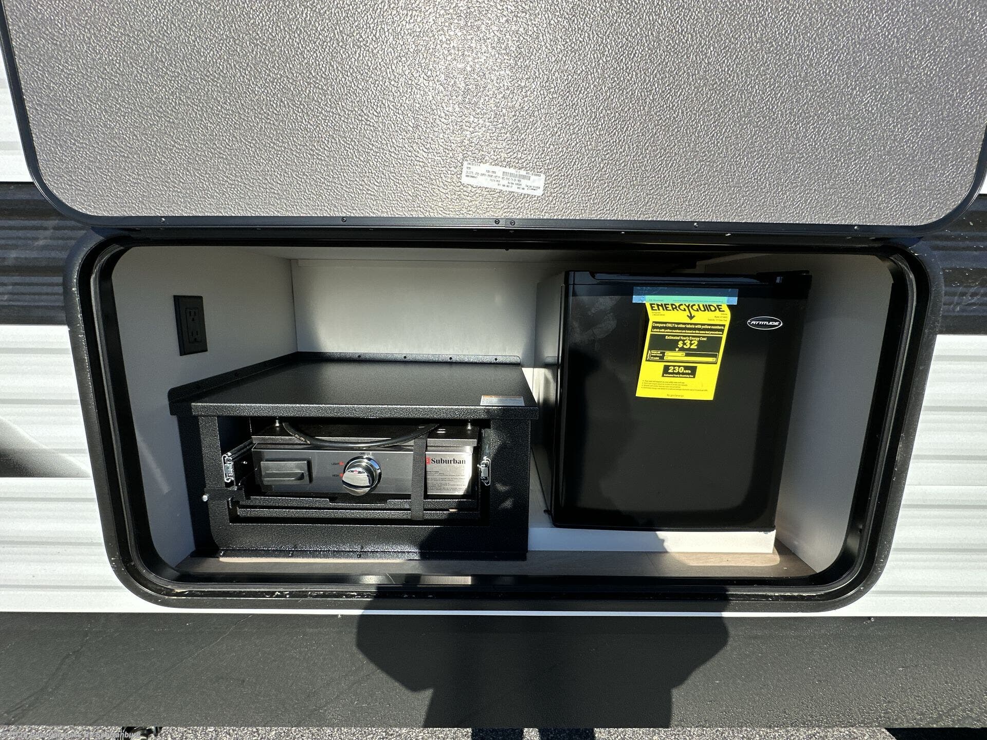 Camping with your larger family or when you want to take along a few extra friends is easy with this trailer. This unit sleeps nine with the double-size bunks in the rear corner, the 60" roll over sofa, and the queen bed in the front semi-private bedroom. The booth dinette can also be used to sleep a guest or two little ones at night once converted. Prepare your meals on the three-burner cooktop indoors, or out on the two-burner cooktop at the outside kitchen! You'll also find a handy exterior spray port and an outdoor refrigerator for cold drinks! It will be so easy to fill the dog's food bowl with the added pet dish under the refrigerator, and the full bath in this model means you don't have to use the camp's facilities. Having a 17' awning outside along with a large unobstructed pass-through compartment allows you extended living outdoors and plenty of space for all of your gear!