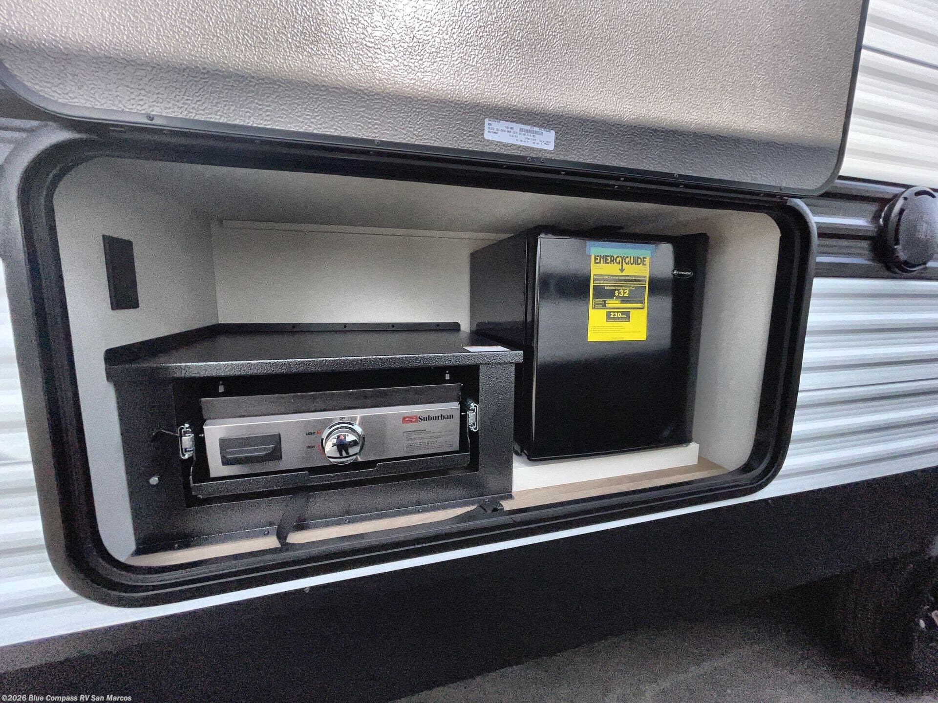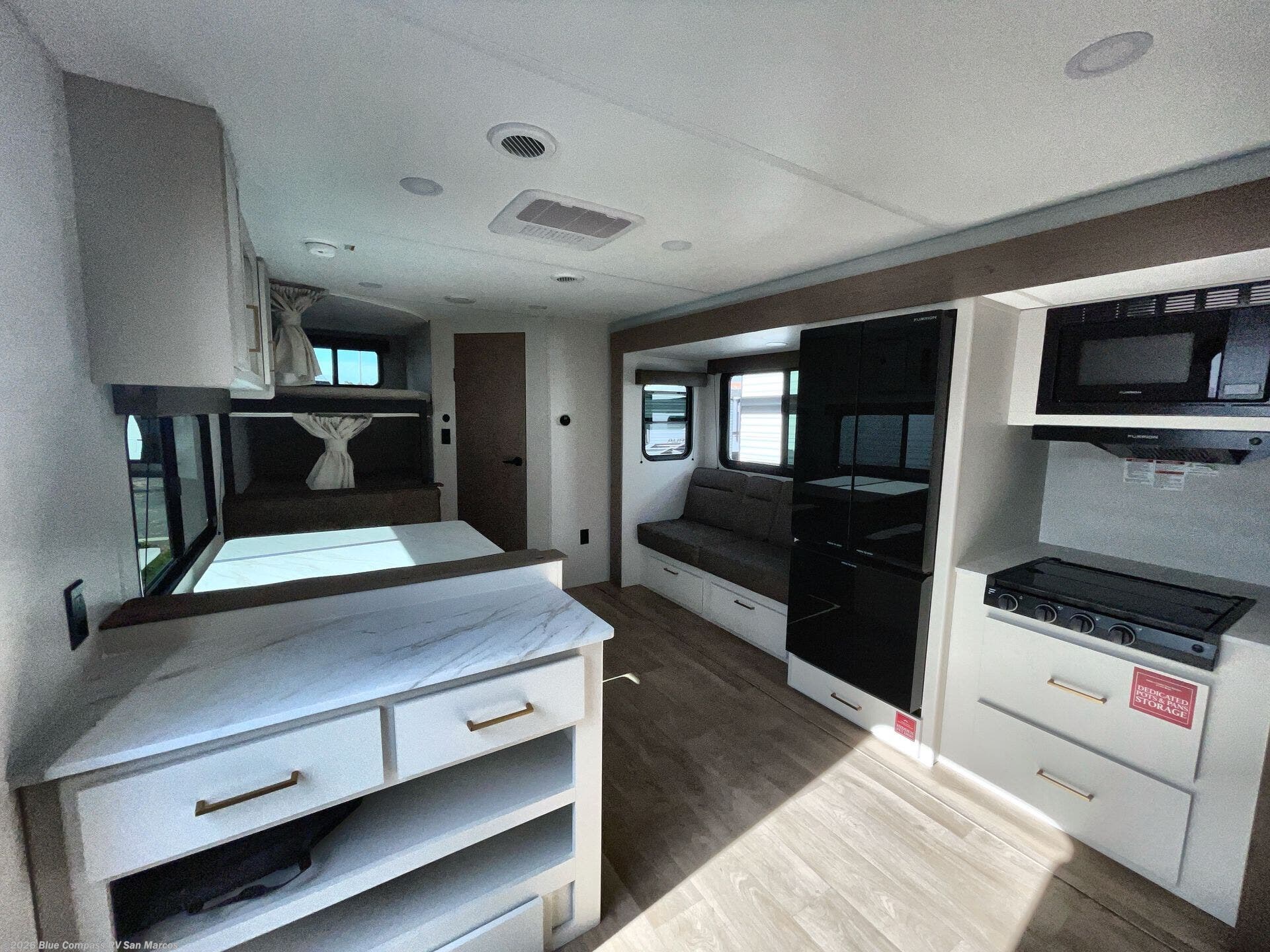 Camping with your larger family or when you want to take along a few extra friends is easy with this trailer. This unit sleeps nine with the double-size bunks in the rear corner, the 60" roll over sofa, and the queen bed in the front semi-private bedroom. The booth dinette can also be used to sleep a guest or two little ones at night once converted. Prepare your meals on the three-burner cooktop indoors, or out on the two-burner cooktop at the outside kitchen! You'll also find a handy exterior spray port and an outdoor refrigerator for cold drinks! It will be so easy to fill the dog's food bowl with the added pet dish under the refrigerator, and the full bath in this model means you don't have to use the camp's facilities. Having a 17' awning outside along with a large unobstructed pass-through compartment allows you extended living outdoors and plenty of space for all of your gear!