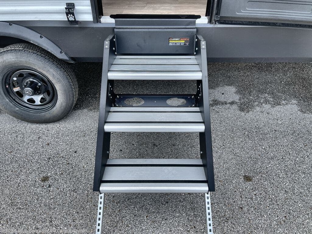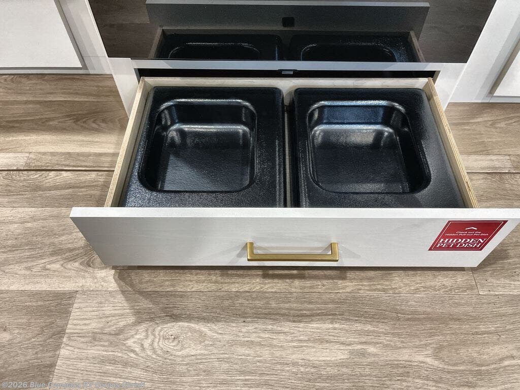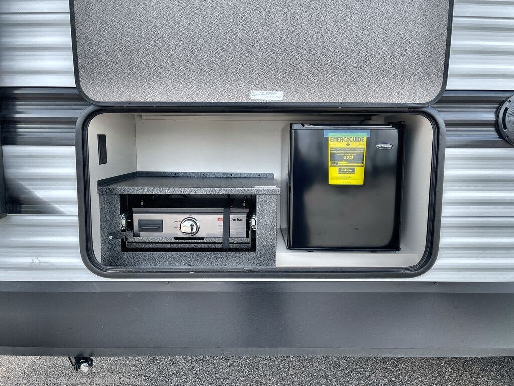 Camping with your larger family or when you want to take along a few extra friends is easy with this trailer. This unit sleeps nine with the double-size bunks in the rear corner, the 60" roll over sofa, and the queen bed in the front semi-private bedroom. The booth dinette can also be used to sleep a guest or two little ones at night once converted. Prepare your meals on the three-burner cooktop indoors, or out on the two-burner cooktop at the outside kitchen! You'll also find a handy exterior spray port and an outdoor refrigerator for cold drinks! It will be so easy to fill the dog's food bowl with the added pet dish under the refrigerator, and the full bath in this model means you don't have to use the camp's facilities. Having a 17' awning outside along with a large unobstructed pass-through compartment allows you extended living outdoors and plenty of space for all of your gear!
