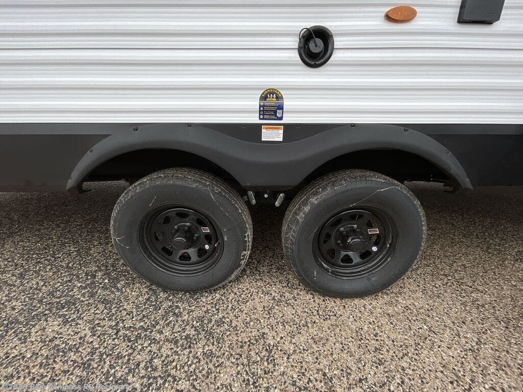 Camping with your larger family or when you want to take along a few extra friends is easy with this trailer. This unit sleeps nine with the double-size bunks in the rear corner, the 60" roll over sofa, and the queen bed in the front semi-private bedroom. The booth dinette can also be used to sleep a guest or two little ones at night once converted. Prepare your meals on the three-burner cooktop indoors, or out on the two-burner cooktop at the outside kitchen! You'll also find a handy exterior spray port and an outdoor refrigerator for cold drinks! It will be so easy to fill the dog's food bowl with the added pet dish under the refrigerator, and the full bath in this model means you don't have to use the camp's facilities. Having a 17' awning outside along with a large unobstructed pass-through compartment allows you extended living outdoors and plenty of space for all of your gear!