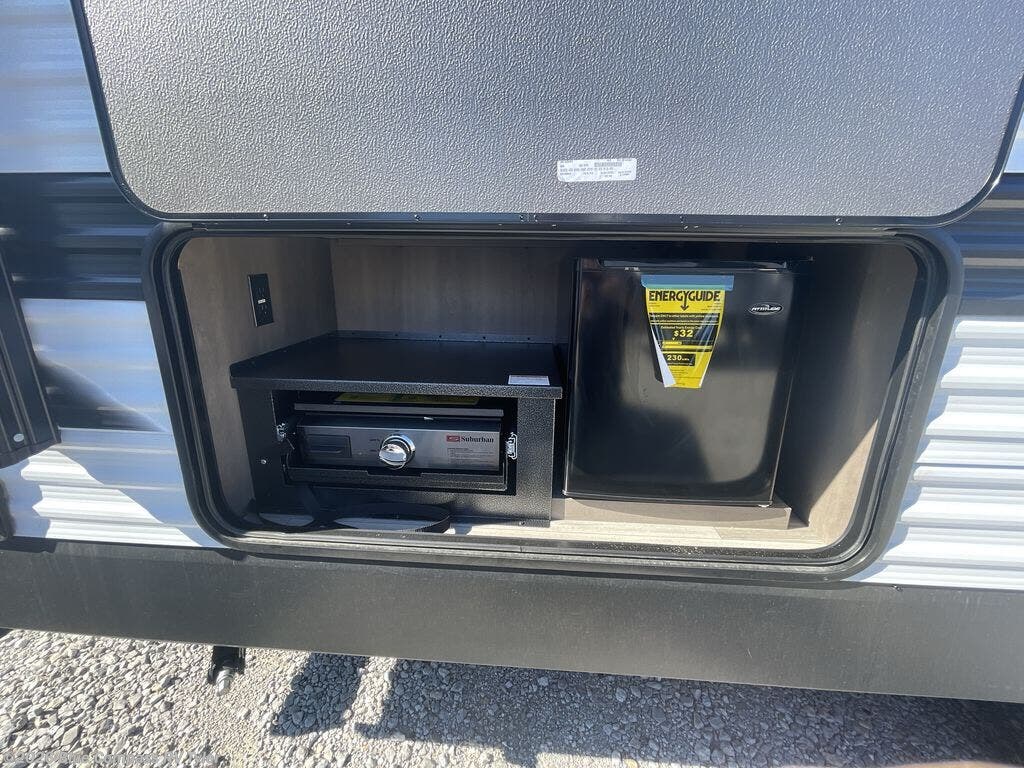 Camping with your larger family or when you want to take along a few extra friends is easy with this trailer. This unit sleeps nine with the double-size bunks in the rear corner, the 60" roll over sofa, and the queen bed in the front semi-private bedroom. The booth dinette can also be used to sleep a guest or two little ones at night once converted. Prepare your meals on the three-burner cooktop indoors, or out on the two-burner cooktop at the outside kitchen! You'll also find a handy exterior spray port and an outdoor refrigerator for cold drinks! It will be so easy to fill the dog's food bowl with the added pet dish under the refrigerator, and the full bath in this model means you don't have to use the camp's facilities. Having a 17' awning outside along with a large unobstructed pass-through compartment allows you extended living outdoors and plenty of space for all of your gear!