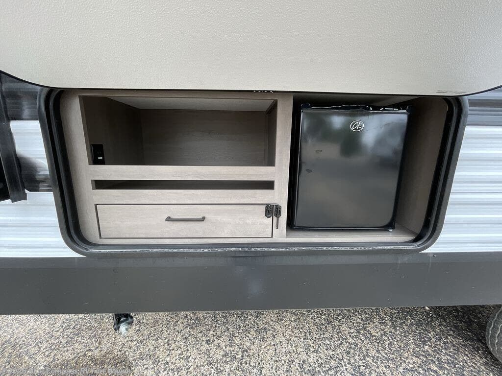Camping with your larger family or when you want to take along a few extra friends is easy with this trailer. This unit sleeps nine with the double-size bunks in the rear corner, the 60" roll over sofa, and the queen bed in the front semi-private bedroom. The booth dinette can also be used to sleep a guest or two little ones at night once converted. Prepare your meals on the three-burner cooktop indoors, or out on the two-burner cooktop at the outside kitchen! You'll also find a handy exterior spray port and an outdoor refrigerator for cold drinks! It will be so easy to fill the dog's food bowl with the added pet dish under the refrigerator, and the full bath in this model means you don't have to use the camp's facilities. Having a 17' awning outside along with a large unobstructed pass-through compartment allows you extended living outdoors and plenty of space for all of your gear!