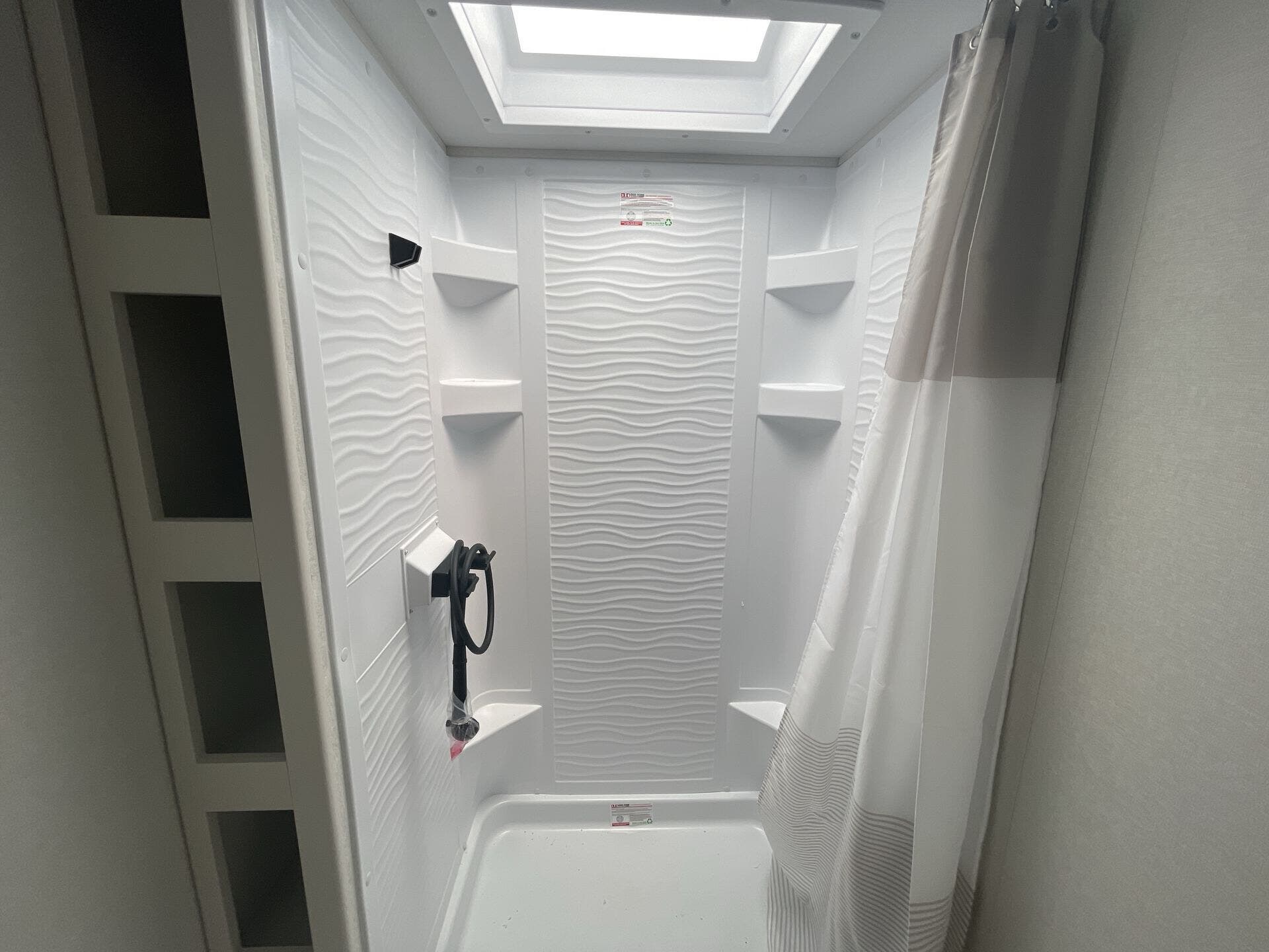 The kitchen is equipped for everyday meals on the road, featuring a microwave and a refrigerator. A dedicated shower and toilet keep morning routines convenient, while the living area keeps occupants entertained with a TV and TV antenna. An optional inverter and solar prep ensure you can stretch your camping experience beyond traditional hookups, and the backup camera assists with safe maneuvering into campsites.