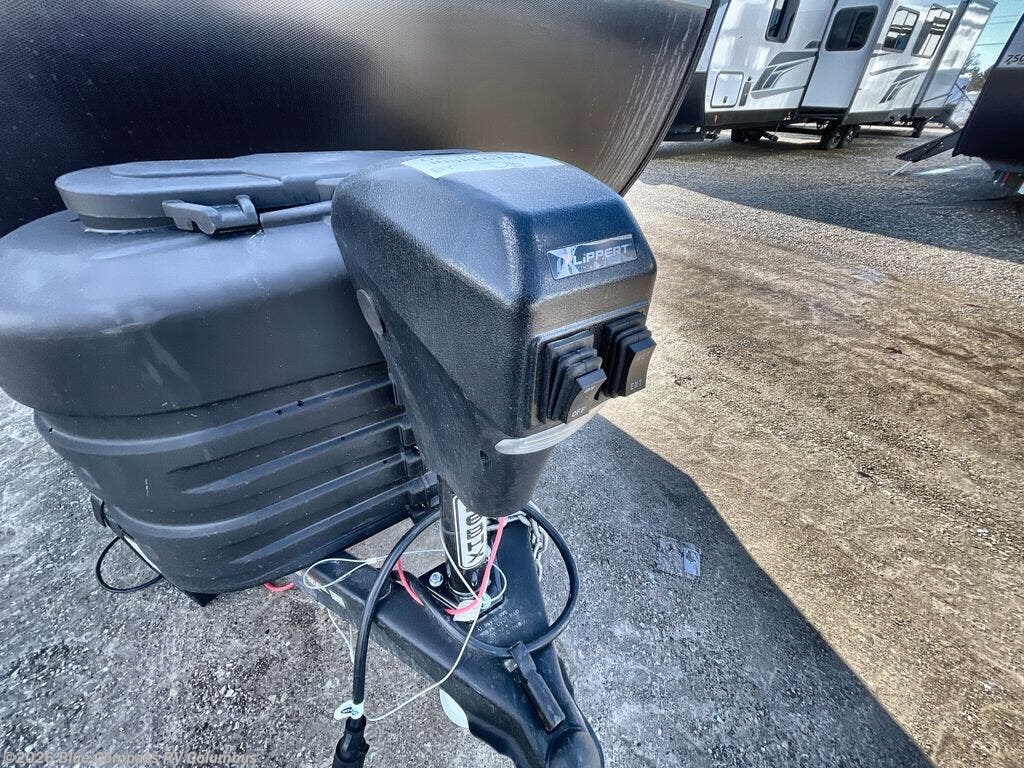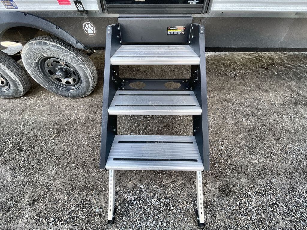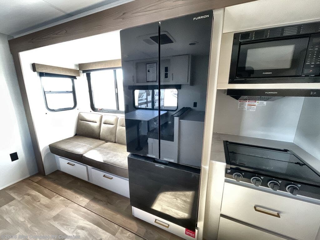 Camping with your larger family or when you want to take along a few extra friends is easy with this trailer. This unit sleeps nine with the double-size bunks in the rear corner, the 60" roll over sofa, and the queen bed in the front semi-private bedroom. The booth dinette can also be used to sleep a guest or two little ones at night once converted. Prepare your meals on the three-burner cooktop indoors, or out on the two-burner cooktop at the outside kitchen! You'll also find a handy exterior spray port and an outdoor refrigerator for cold drinks! It will be so easy to fill the dog's food bowl with the added pet dish under the refrigerator, and the full bath in this model means you don't have to use the camp's facilities. Having a 17' awning outside along with a large unobstructed pass-through compartment allows you extended living outdoors and plenty of space for all of your gear!