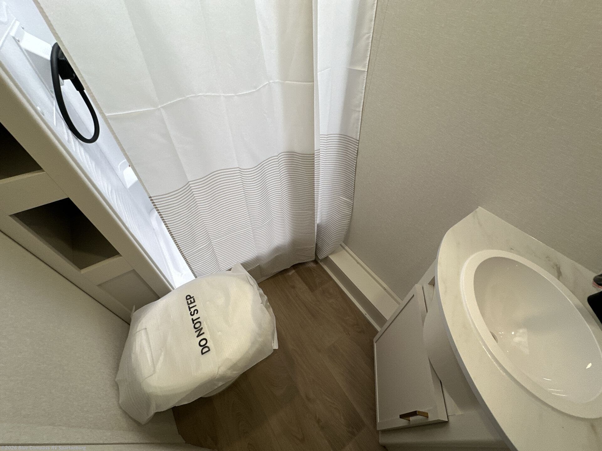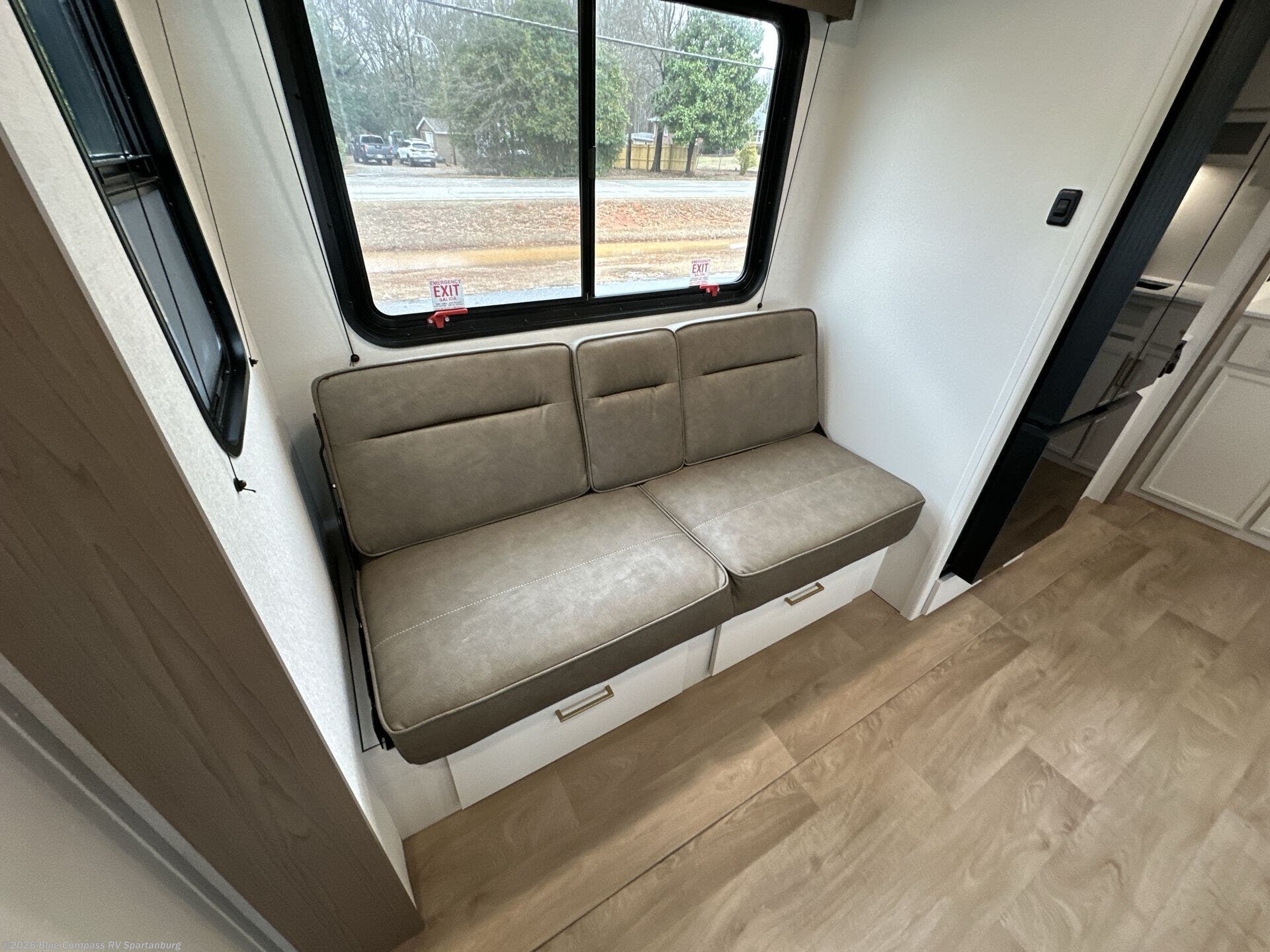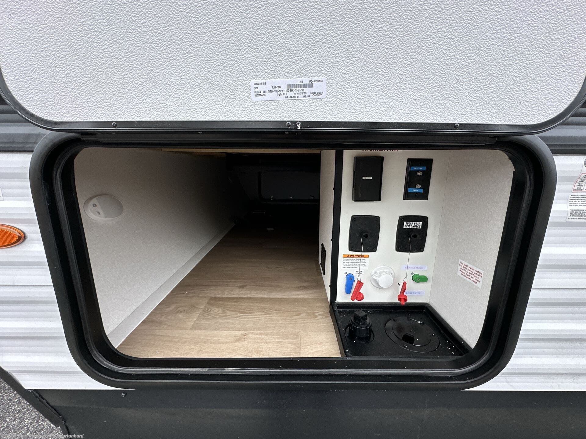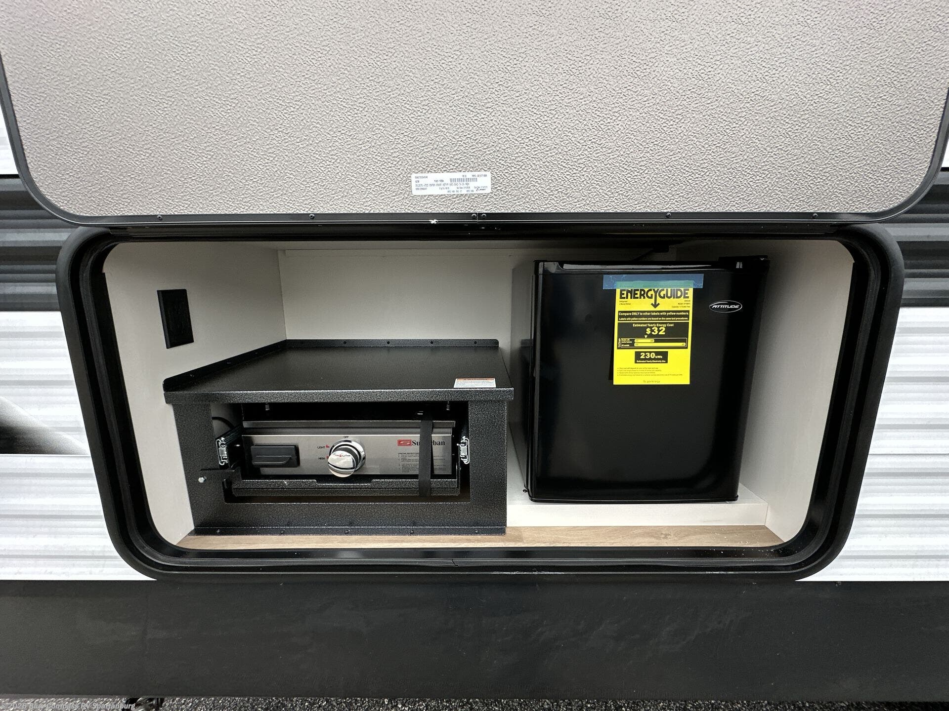 Camping with your larger family or when you want to take along a few extra friends is easy with this trailer. This unit sleeps nine with the double-size bunks in the rear corner, the 60" roll over sofa, and the queen bed in the front semi-private bedroom. The booth dinette can also be used to sleep a guest or two little ones at night once converted. Prepare your meals on the three-burner cooktop indoors, or out on the outside kitchen! You'll also find a handy exterior spray port and an outdoor refrigerator for cold drinks! It will be so easy to fill the dog's food bowl with the added pet dish under the refrigerator, and the full bath in this model means you don't have to use the camp's facilities. Having a 17' awning outside along with a large pass-through compartment allows you extended living outdoors and plenty of space for all of your gear!
