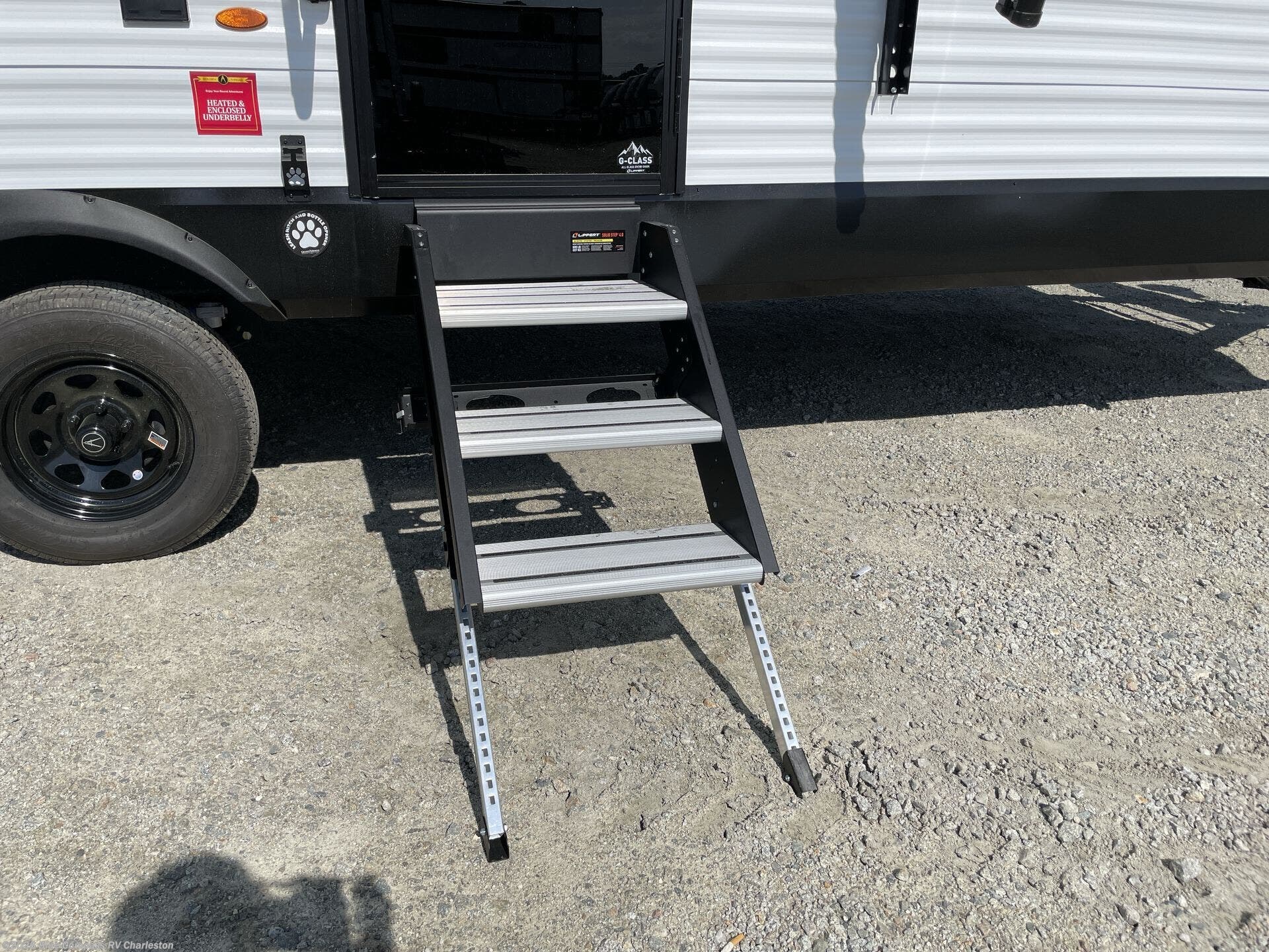 Camping with your larger family or when you want to take along a few extra friends is easy with this trailer. This unit sleeps nine with the double-size bunks in the rear corner, the 60" roll over sofa, and the queen bed in the front semi-private bedroom. The booth dinette can also be used to sleep a guest or two little ones at night once converted. Prepare your meals on the three-burner cooktop indoors, or out on the outside kitchen! You'll also find a handy exterior spray port and an outdoor refrigerator for cold drinks! It will be so easy to fill the dog's food bowl with the added pet dish under the refrigerator, and the full bath in this model means you don't have to use the camp's facilities. Having a 17' awning outside along with a large pass-through compartment allows you extended living outdoors and plenty of space for all of your gear!