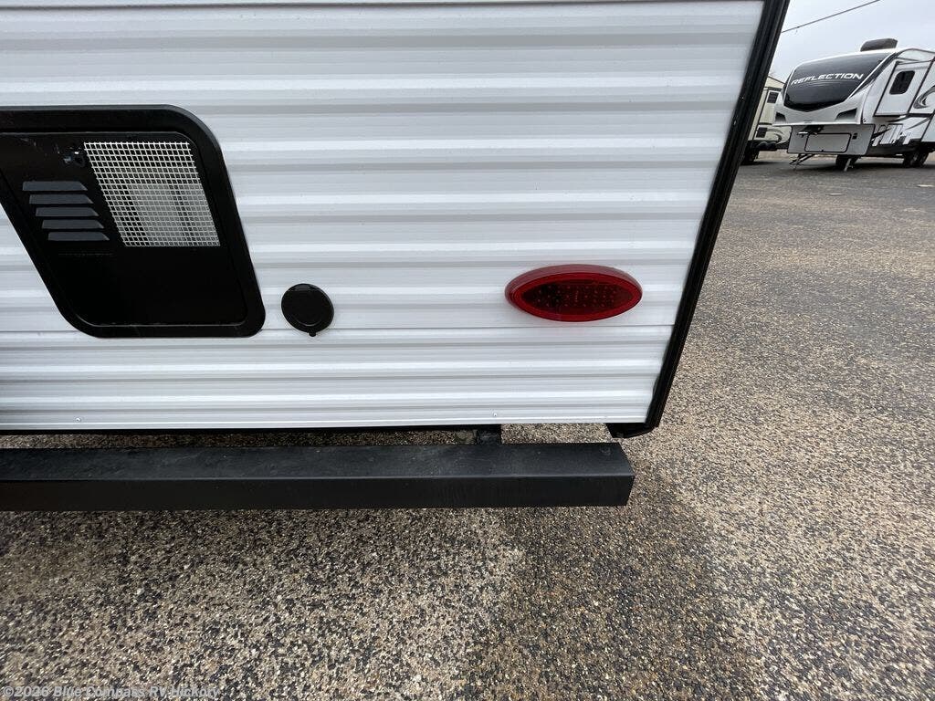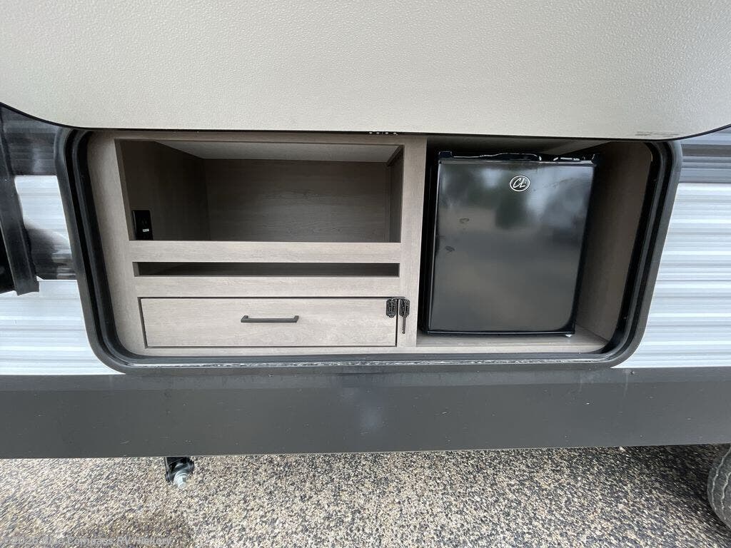 Camping with your larger family or when you want to take along a few extra friends is easy with this trailer. This unit sleeps nine with the double-size bunks in the rear corner, the 60" roll over sofa, and the queen bed in the front semi-private bedroom. The booth dinette can also be used to sleep a guest or two little ones at night once converted. Prepare your meals on the three-burner cooktop indoors, or out on the outside kitchen! You'll also find a handy exterior spray port and an outdoor refrigerator for cold drinks! It will be so easy to fill the dog's food bowl with the added pet dish under the refrigerator, and the full bath in this model means you don't have to use the camp's facilities. Having a 17' awning outside along with a large pass-through compartment allows you extended living outdoors and plenty of space for all of your gear!