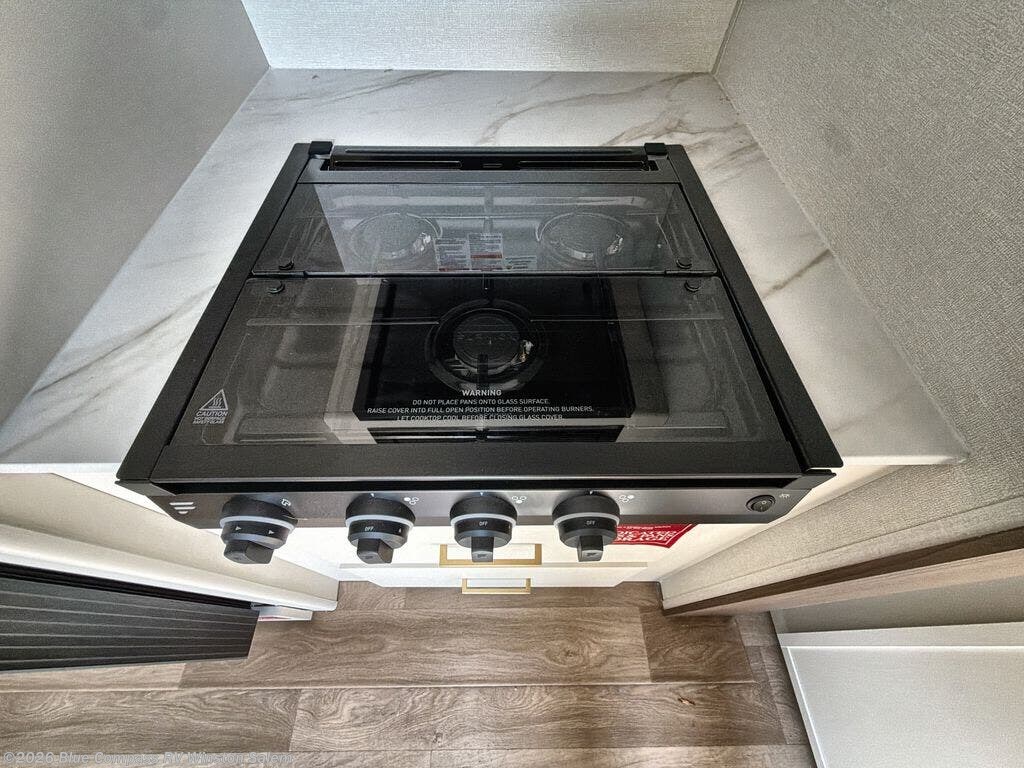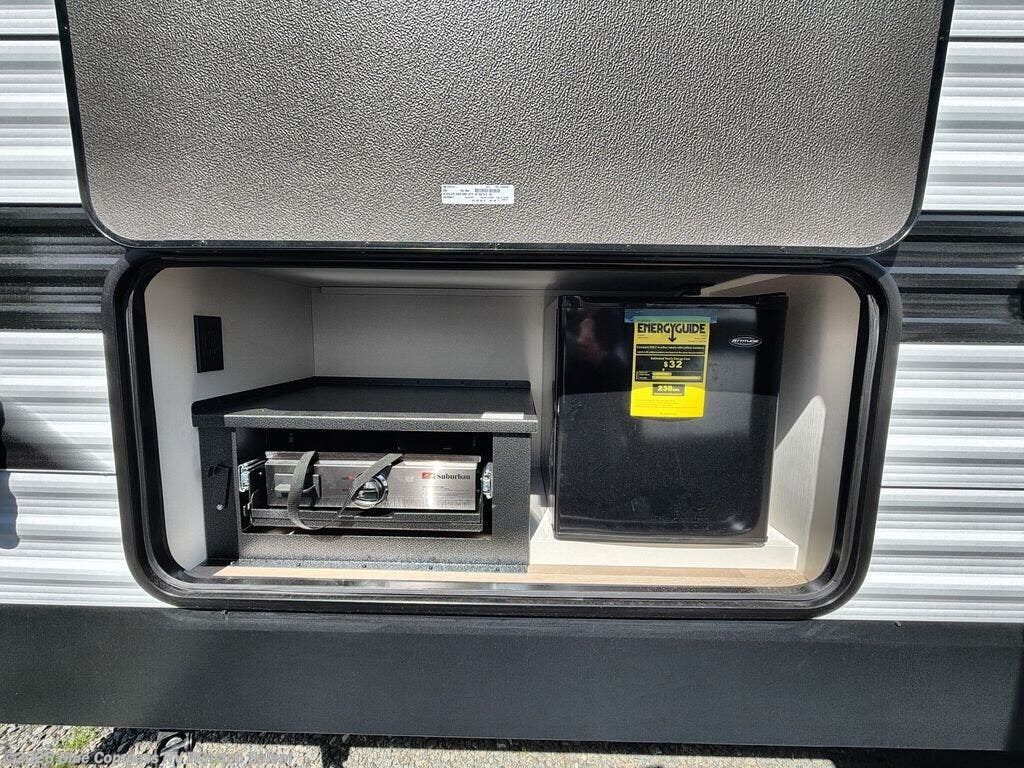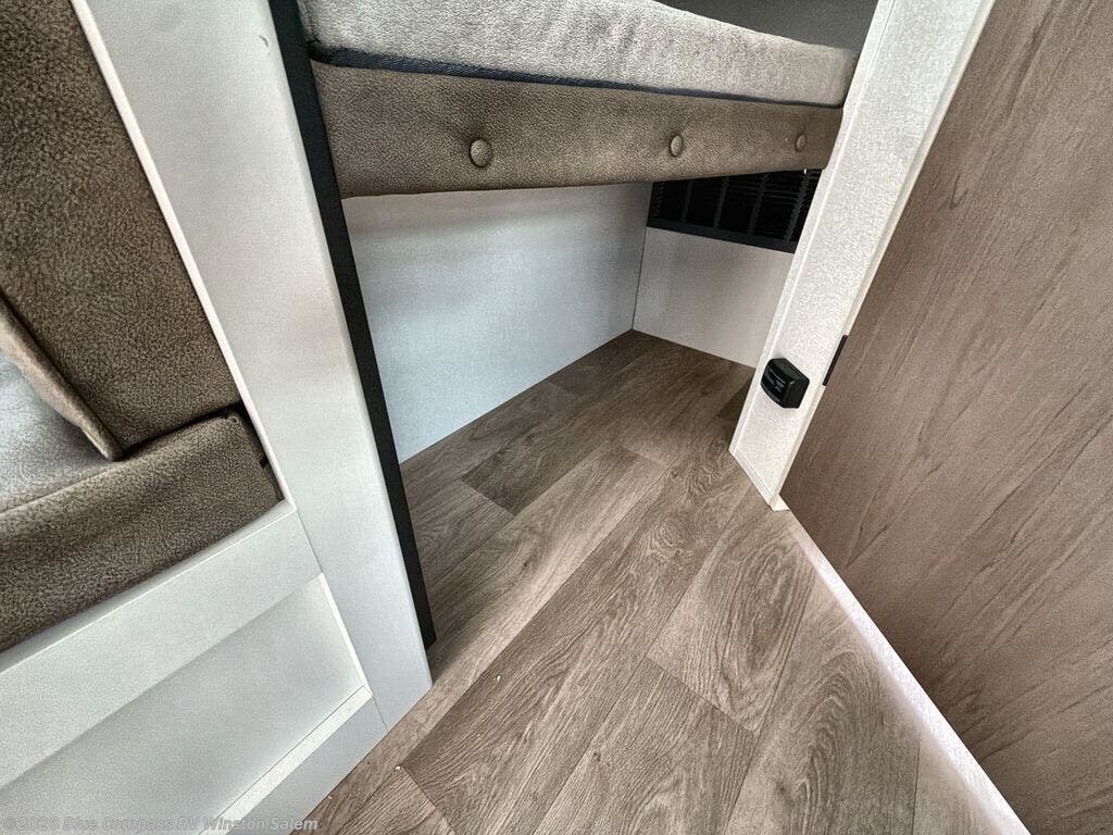 Camping with your larger family or when you want to take along a few extra friends is easy with this trailer. This unit sleeps nine with the double-size bunks in the rear corner, the 60" roll over sofa, and the queen bed in the front semi-private bedroom. The booth dinette can also be used to sleep a guest or two little ones at night once converted. Prepare your meals on the three-burner cooktop indoors, or out on the outside kitchen! You'll also find a handy exterior spray port and an outdoor refrigerator for cold drinks! It will be so easy to fill the dog's food bowl with the added pet dish under the refrigerator, and the full bath in this model means you don't have to use the camp's facilities. Having a 17' awning outside along with a large pass-through compartment allows you extended living outdoors and plenty of space for all of your gear!