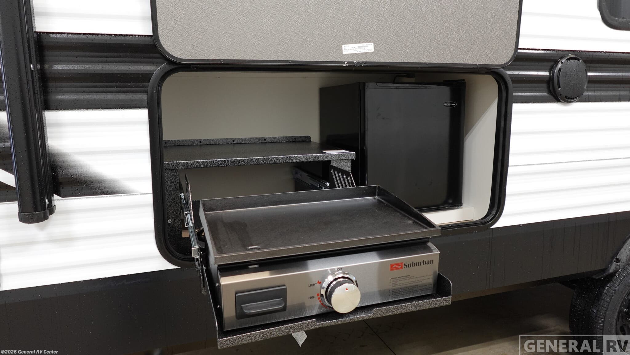 Grand Design Transcend Xplor travel trailer 26BHX highlights: Double-Size Bunk Beds with Curtains Booth Dinette Entry Counter with Shoe Storage Queen Bed 60" Roll Over Sofa Camping with your larger family or when you want to take along a few extra friends is easy with this trailer. This unit sleeps nine with the double-size bunks in the rear corner, the 60" roll over sofa, and the queen bed in the front semi-private bedroom. The booth dinette can also be used to sleep a guest or two little ones at night once converted. Prepare your meals on the three-burner cooktop indoors, or out on the two-burner cooktop at the outside kitchen! You'll also find a handy exterior spray port and an outdoor refrigerator for cold drinks! It will be so easy to fill the dog's food bowl with the added pet dish under the refrigerator, and the full bath in this model means you don't have to use the camp's facilities. Having a 17' awning outside along with a large unobstructed pass-through compartment allows you extended living outdoors and plenty of space for all of your gear! The customer-focused, quality-built Transcend Xplor travel trailers by Grand Design are your ticket to fun and adventure. You will appreciate the power tongue jack when it comes time to set up, as well as the all-in-one utility center and the detachable power cord with an LED light. These models include many outlets throughout, USB ports to charge your gadgets, and a JBL exterior speaker to listen to your favorite tunes. The interior of the Transcend Xplor will have you feeling right at home with upgraded residential furniture, residential countertops, residential cabinet doors, and the list goes on!