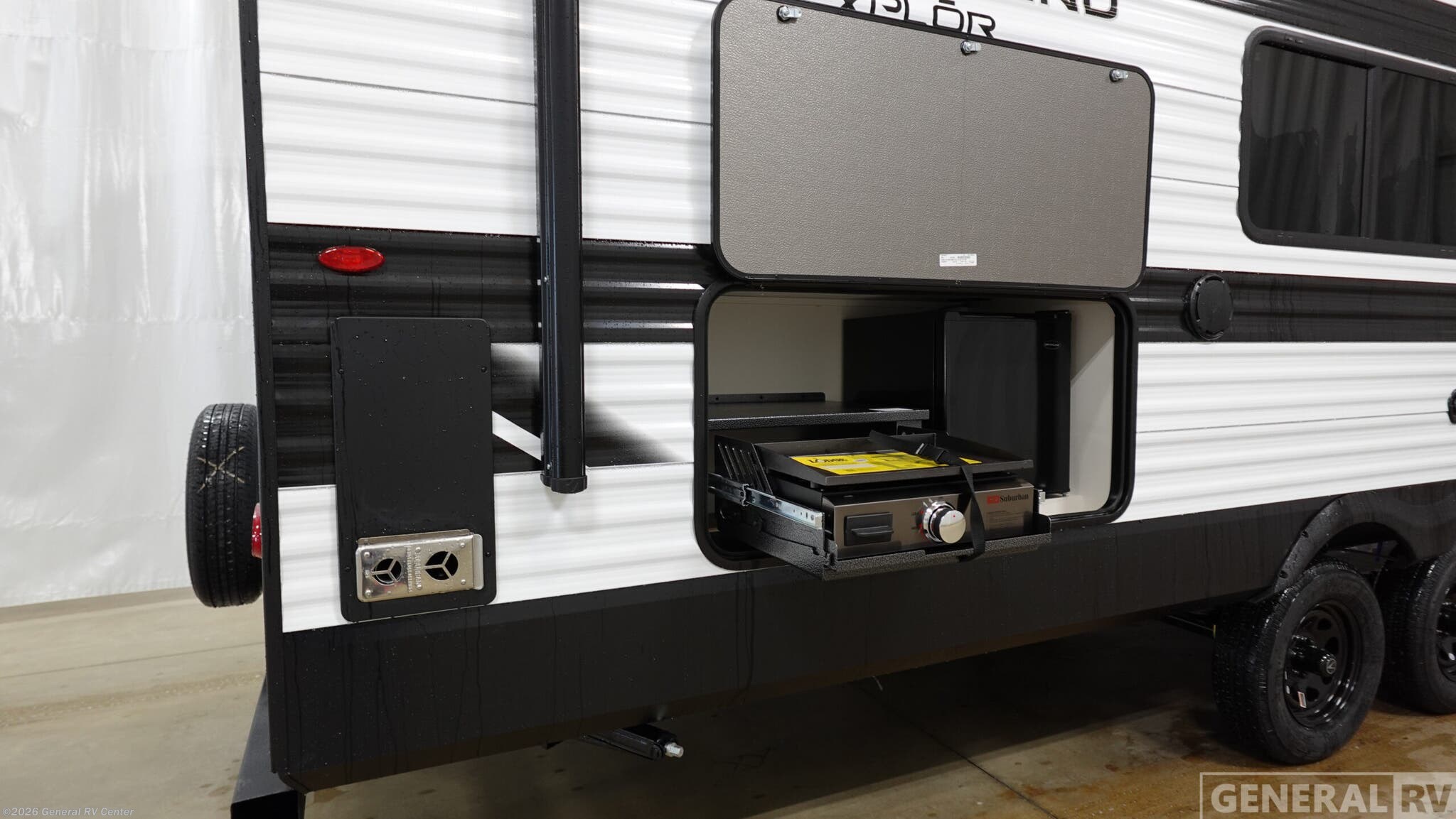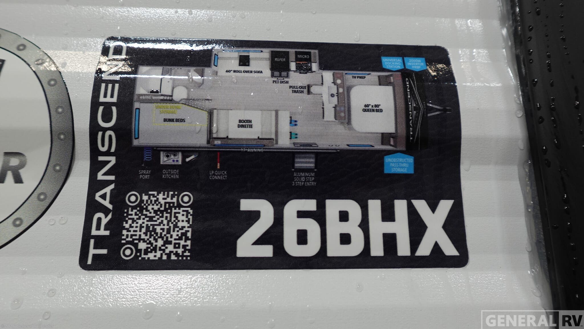 Grand Design Transcend Xplor travel trailer 26BHX highlights: Double-Size Bunk Beds with Curtains Booth Dinette Entry Counter with Shoe Storage Queen Bed 60" Roll Over Sofa Camping with your larger family or when you want to take along a few extra friends is easy with this trailer. This unit sleeps nine with the double-size bunks in the rear corner, the 60" roll over sofa, and the queen bed in the front semi-private bedroom. The booth dinette can also be used to sleep a guest or two little ones at night once converted. Prepare your meals on the three-burner cooktop indoors, or out on the two-burner cooktop at the outside kitchen! You'll also find a handy exterior spray port and an outdoor refrigerator for cold drinks! It will be so easy to fill the dog's food bowl with the added pet dish under the refrigerator, and the full bath in this model means you don't have to use the camp's facilities. Having a 17' awning outside along with a large unobstructed pass-through compartment allows you extended living outdoors and plenty of space for all of your gear! The customer-focused, quality-built Transcend Xplor travel trailers by Grand Design are your ticket to fun and adventure. You will appreciate the power tongue jack when it comes time to set up, as well as the all-in-one utility center and the detachable power cord with an LED light. These models include many outlets throughout, USB ports to charge your gadgets, and a JBL exterior speaker to listen to your favorite tunes. The interior of the Transcend Xplor will have you feeling right at home with upgraded residential furniture, residential countertops, residential cabinet doors, and the list goes on!