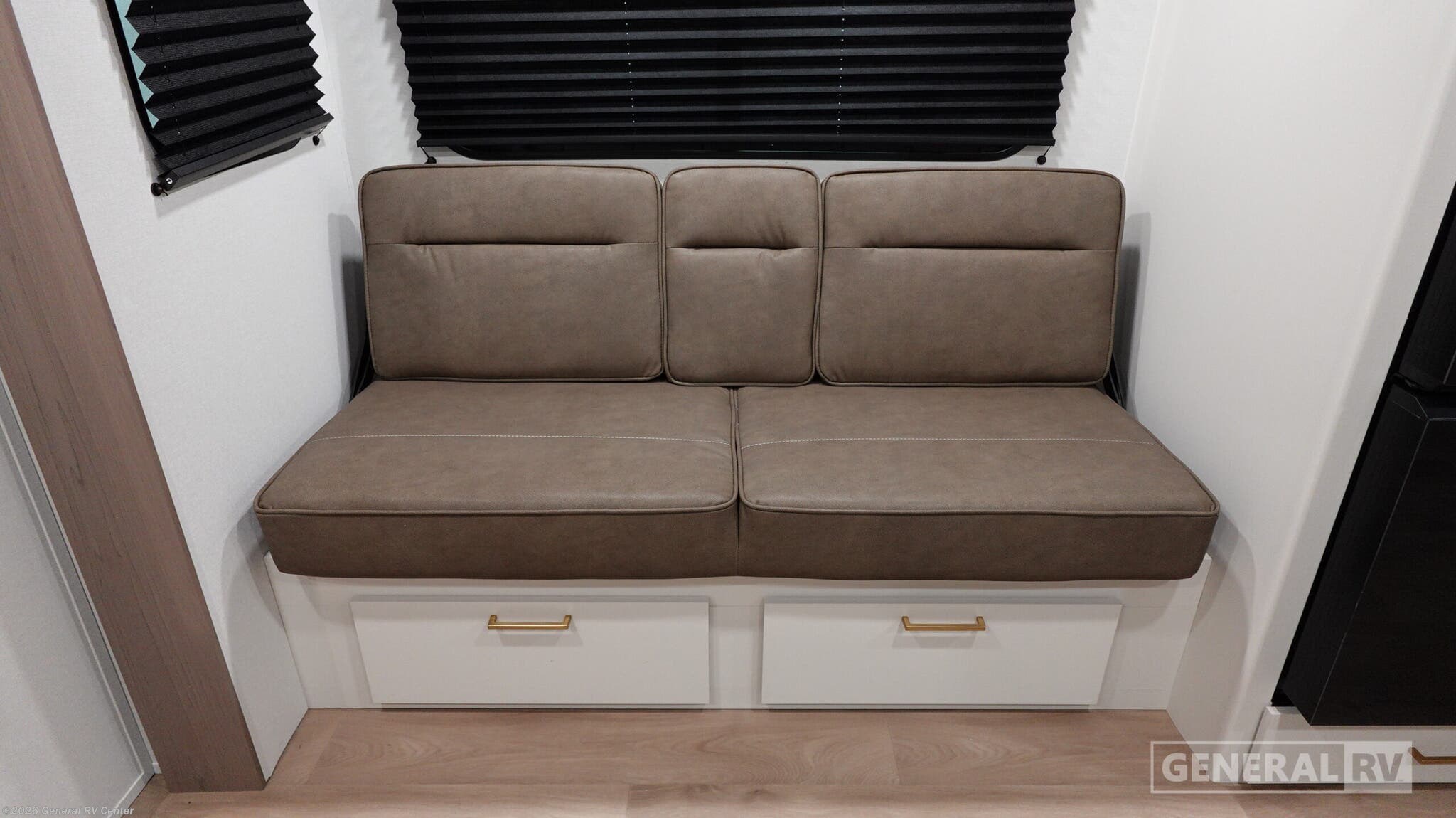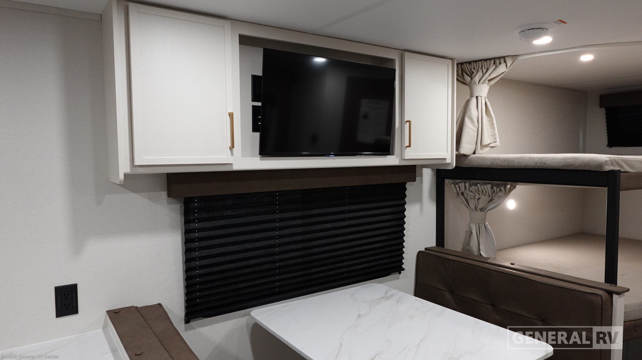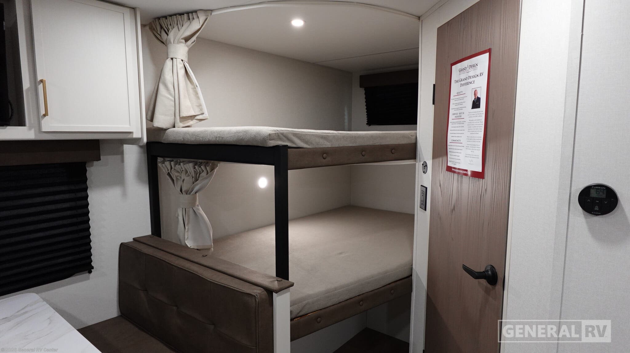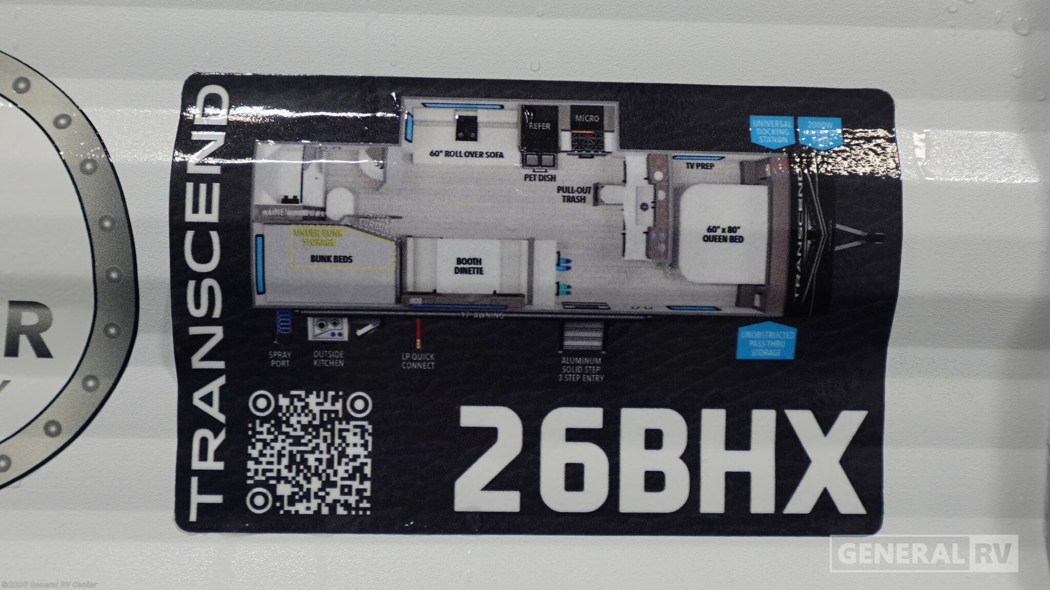 Grand Design Transcend Xplor travel trailer 26BHX highlights: Double-Size Bunk Beds with Curtains Booth Dinette Entry Counter with Shoe Storage Queen Bed 60" Roll Over Sofa Camping with your larger family or when you want to take along a few extra friends is easy with this trailer. This unit sleeps nine with the double-size bunks in the rear corner, the 60" roll over sofa, and the queen bed in the front semi-private bedroom. The booth dinette can also be used to sleep a guest or two little ones at night once converted. Prepare your meals on the three-burner cooktop indoors, or out on the two-burner cooktop at the outside kitchen! You'll also find a handy exterior spray port and an outdoor refrigerator for cold drinks! It will be so easy to fill the dog's food bowl with the added pet dish under the refrigerator, and the full bath in this model means you don't have to use the camp's facilities. Having a 17' awning outside along with a large unobstructed pass-through compartment allows you extended living outdoors and plenty of space for all of your gear! The customer-focused, quality-built Transcend Xplor travel trailers by Grand Design are your ticket to fun and adventure. You will appreciate the power tongue jack when it comes time to set up, as well as the all-in-one utility center and the detachable power cord with an LED light. These models include many outlets throughout, USB ports to charge your gadgets, and a JBL exterior speaker to listen to your favorite tunes. The interior of the Transcend Xplor will have you feeling right at home with upgraded residential furniture, residential countertops, residential cabinet doors, and the list goes on!