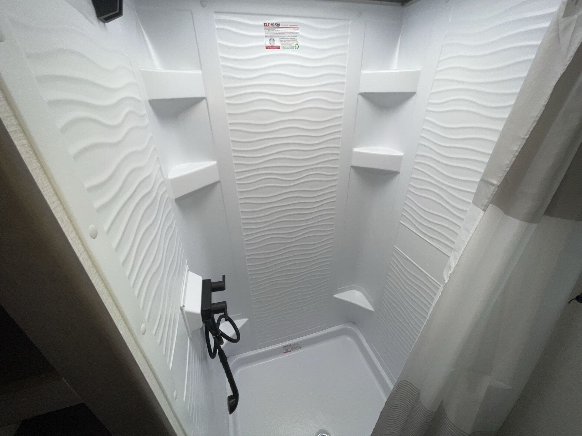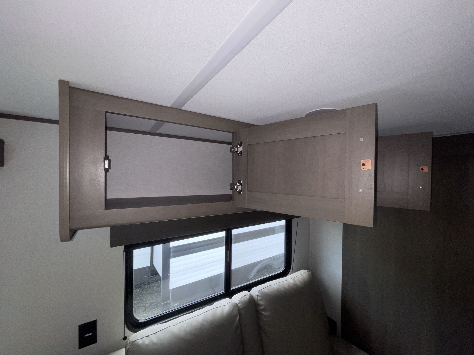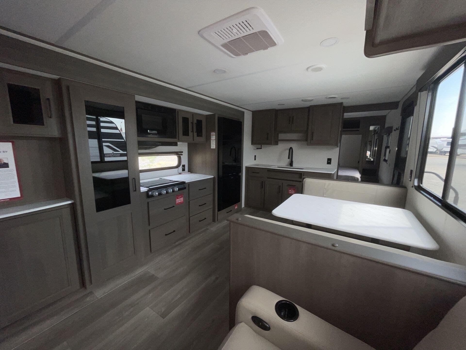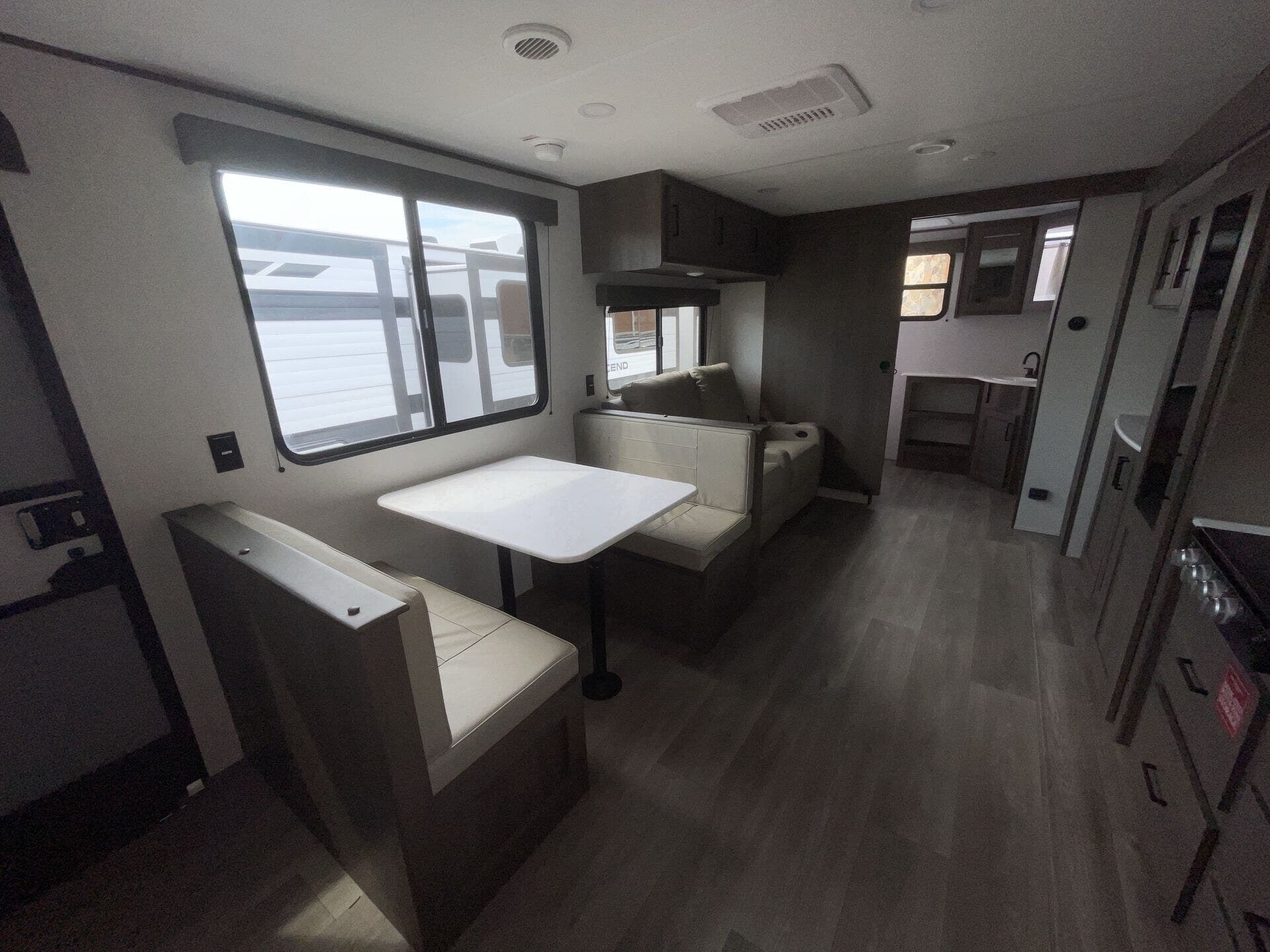 Inside, you'll find a smart floorplan featuring a versatile Murphy bed that folds down over a jackknife sofa, giving you both a living space during the day and a comfortable sleeping area at night. A booth dinette provides a cozy dining spot and converts into additional sleeping space if needed. The kitchen includes a two-burner cooktop, microwave, large refrigerator, and plenty of cabinetry for your camping essentials. The rear corner bathroom offers a full shower, foot-flush toilet, and vanity — all the conveniences of home in a well-organized layout.