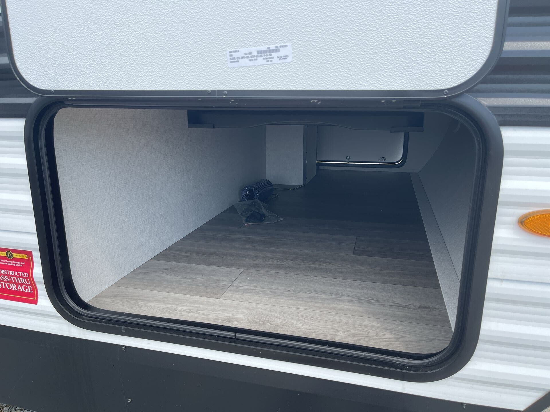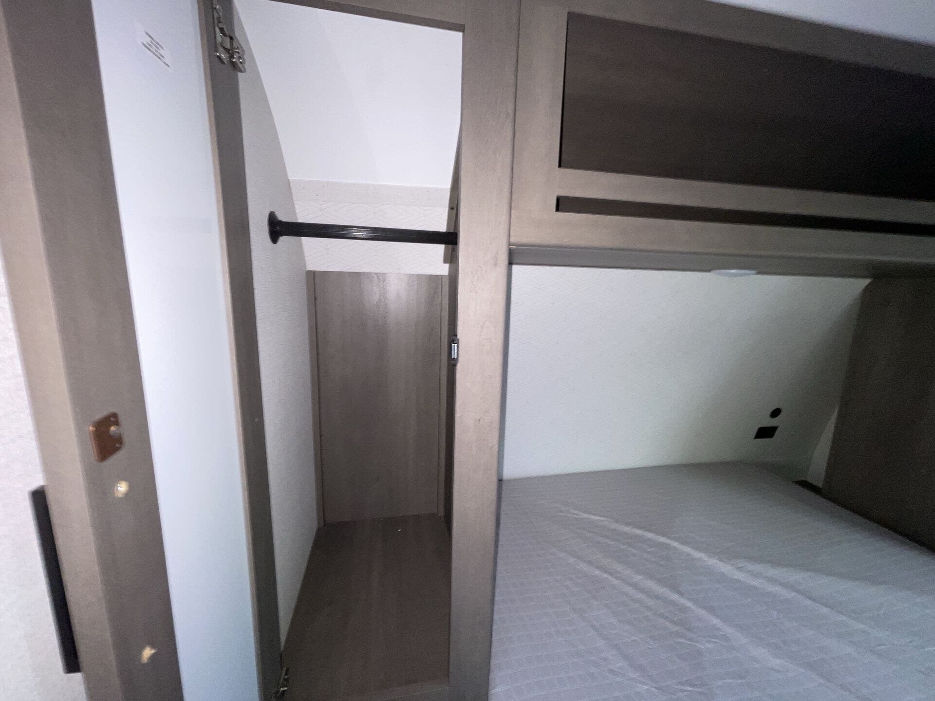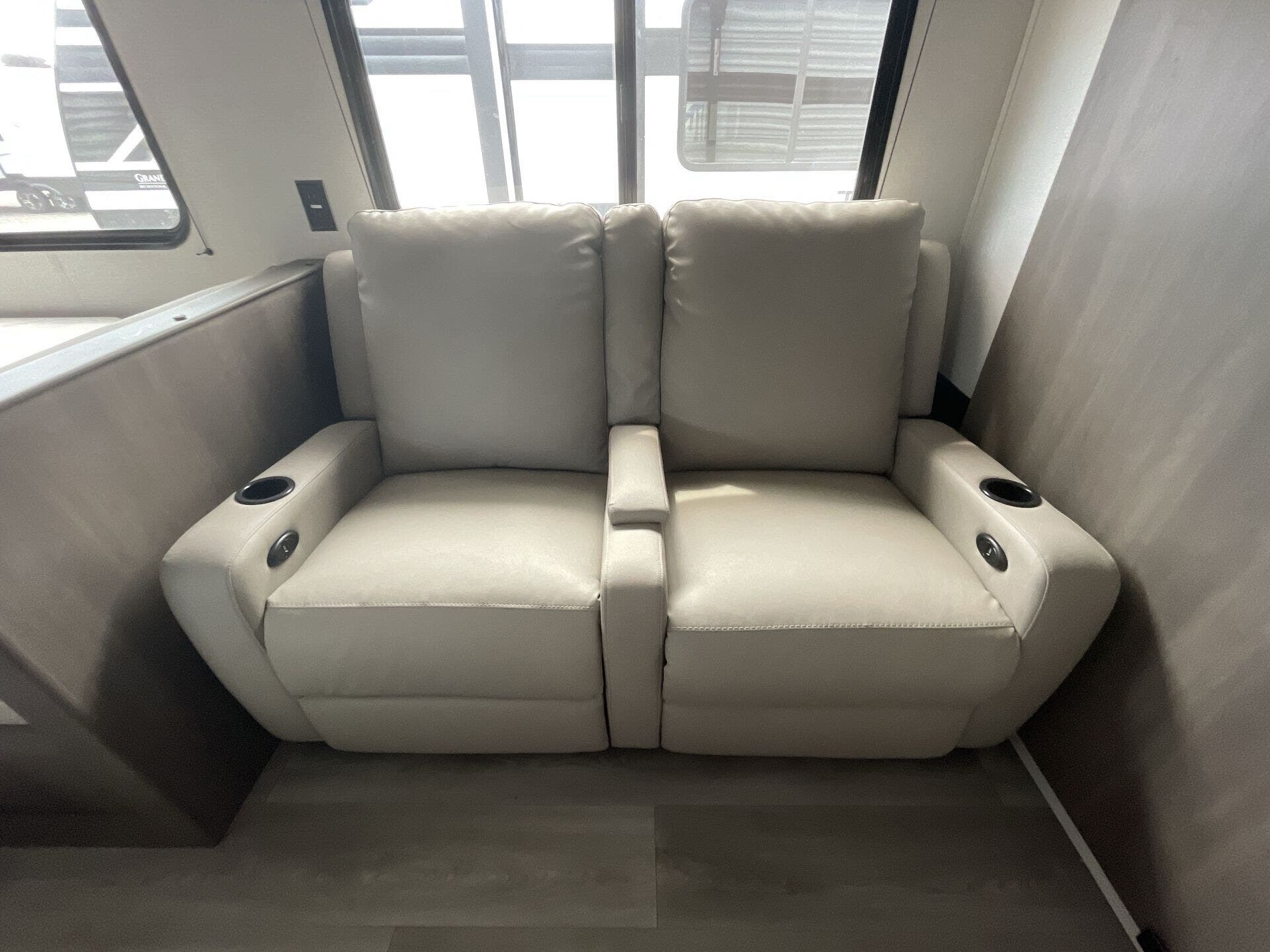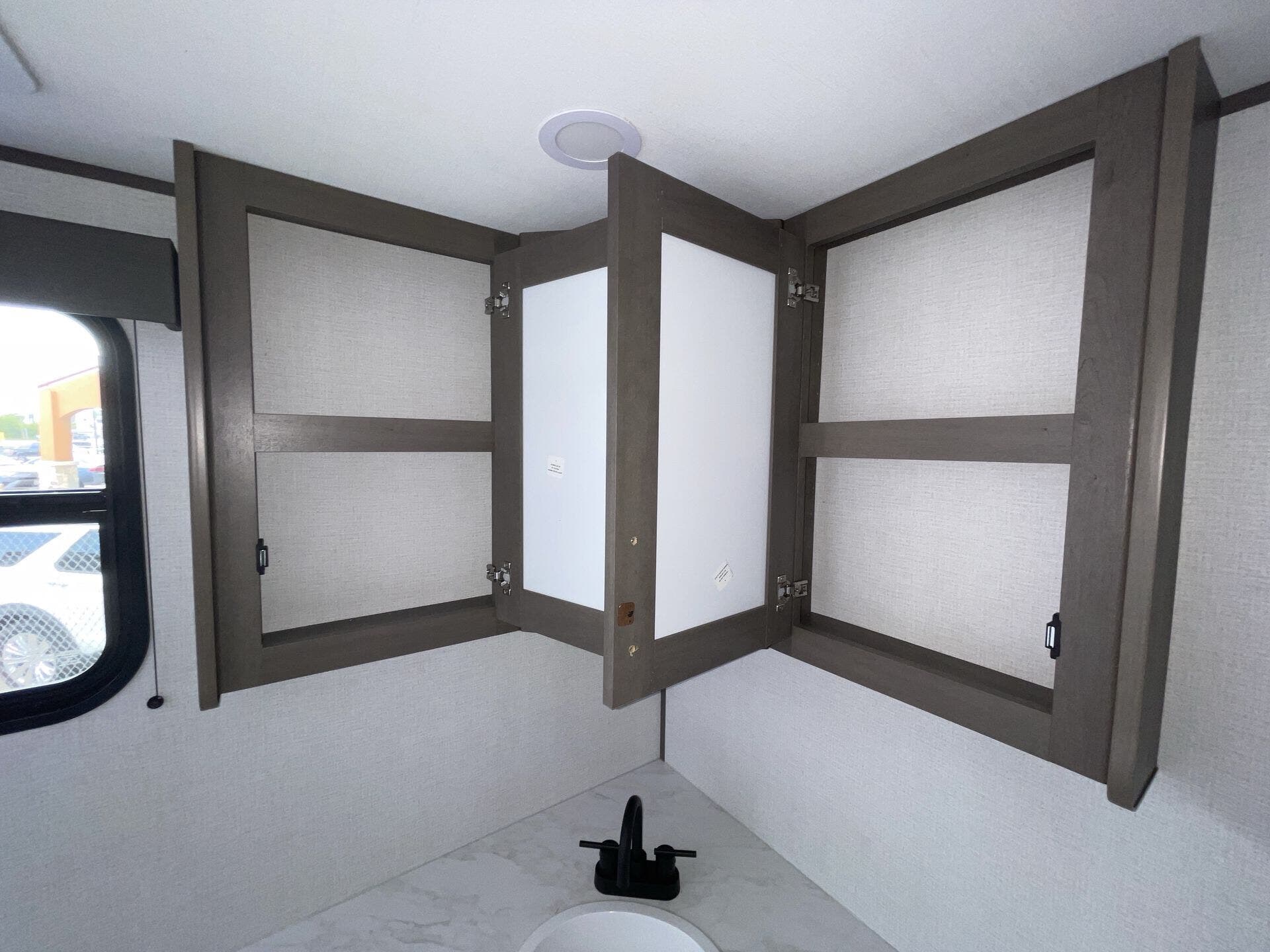 Inside, you'll find a smart floorplan featuring a versatile Murphy bed that folds down over a jackknife sofa, giving you both a living space during the day and a comfortable sleeping area at night. A booth dinette provides a cozy dining spot and converts into additional sleeping space if needed. The kitchen includes a two-burner cooktop, microwave, large refrigerator, and plenty of cabinetry for your camping essentials. The rear corner bathroom offers a full shower, foot-flush toilet, and vanity — all the conveniences of home in a well-organized layout.