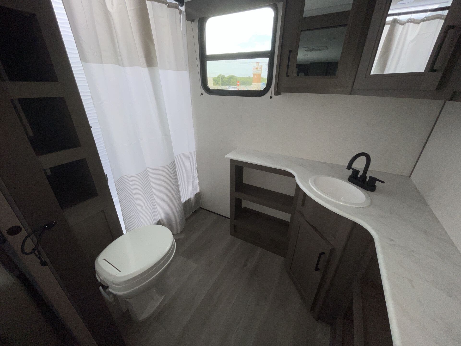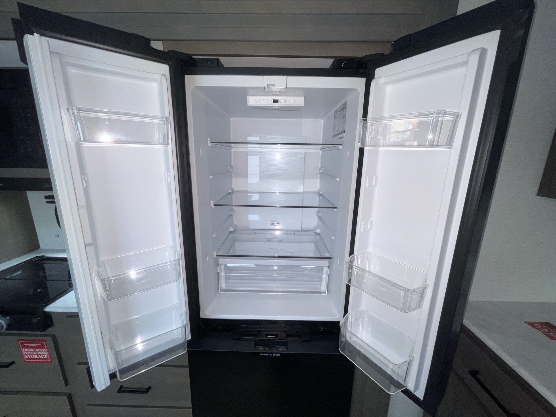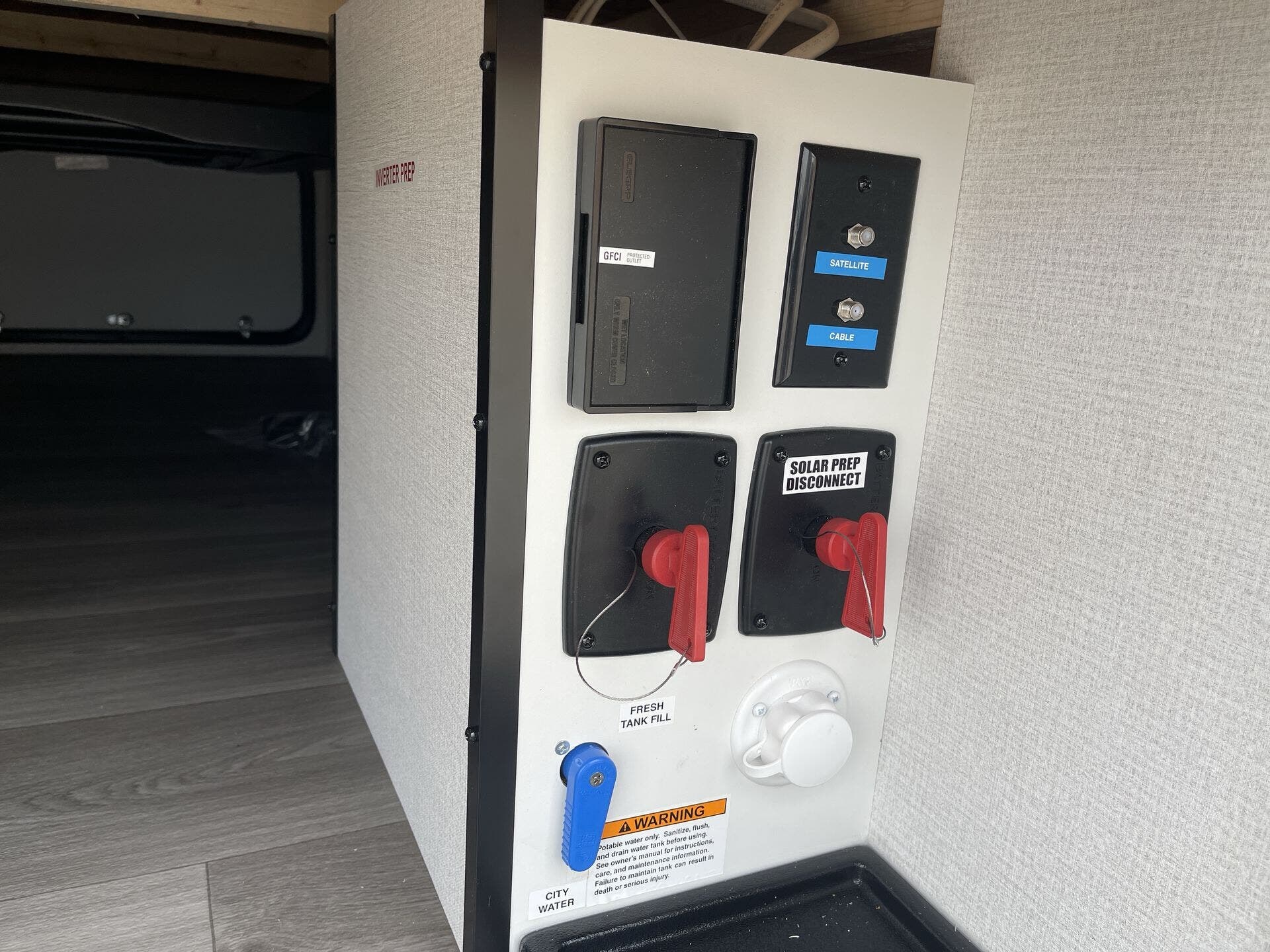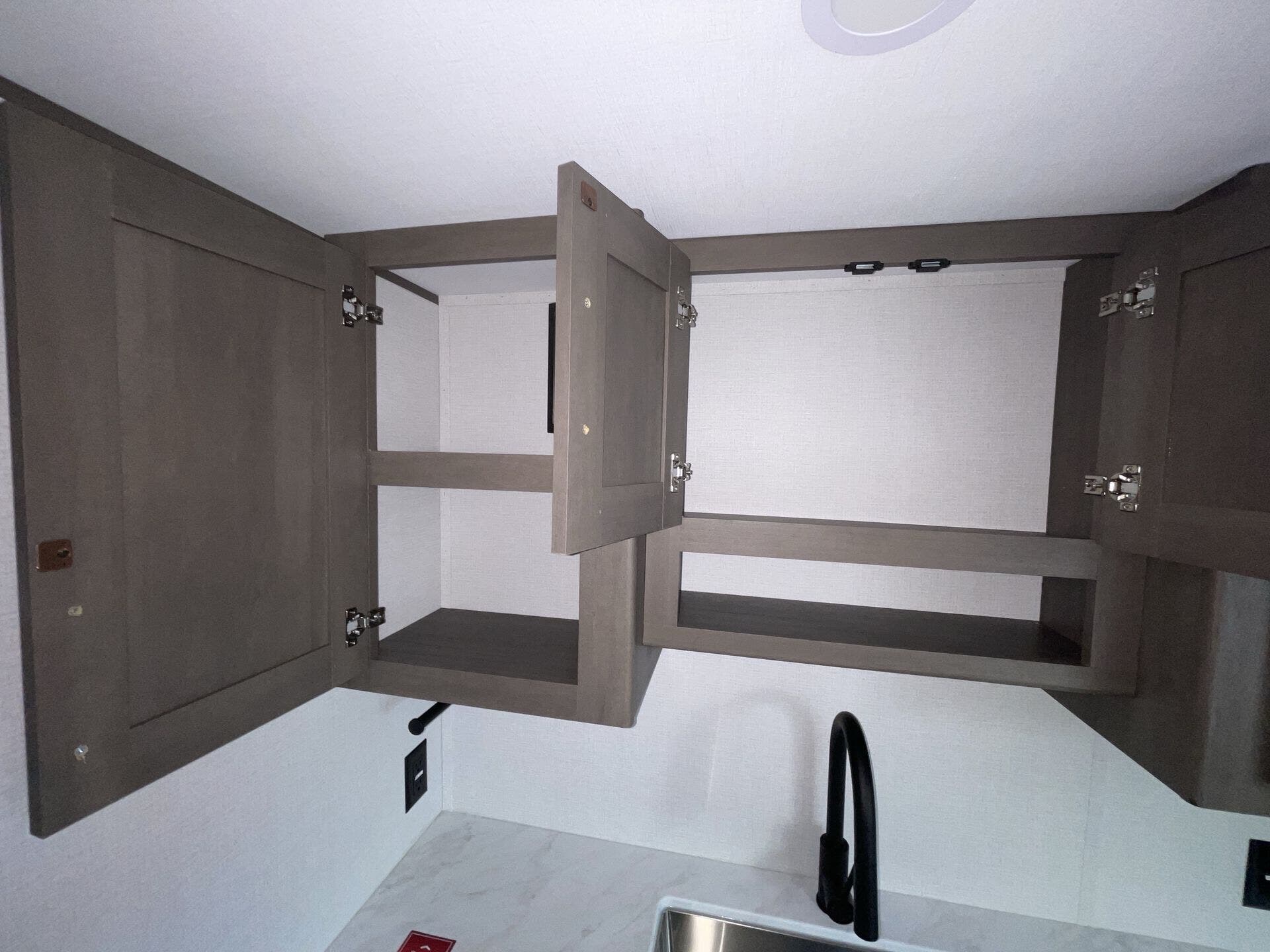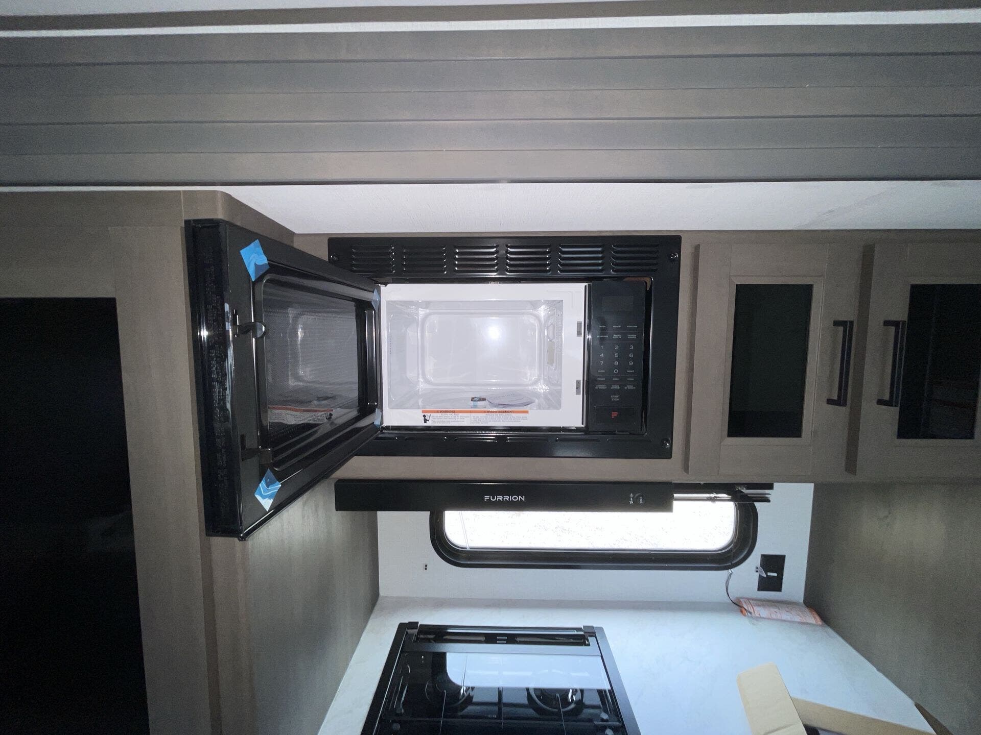 Inside, you'll find a smart floorplan featuring a versatile Murphy bed that folds down over a jackknife sofa, giving you both a living space during the day and a comfortable sleeping area at night. A booth dinette provides a cozy dining spot and converts into additional sleeping space if needed. The kitchen includes a two-burner cooktop, microwave, large refrigerator, and plenty of cabinetry for your camping essentials. The rear corner bathroom offers a full shower, foot-flush toilet, and vanity — all the conveniences of home in a well-organized layout.