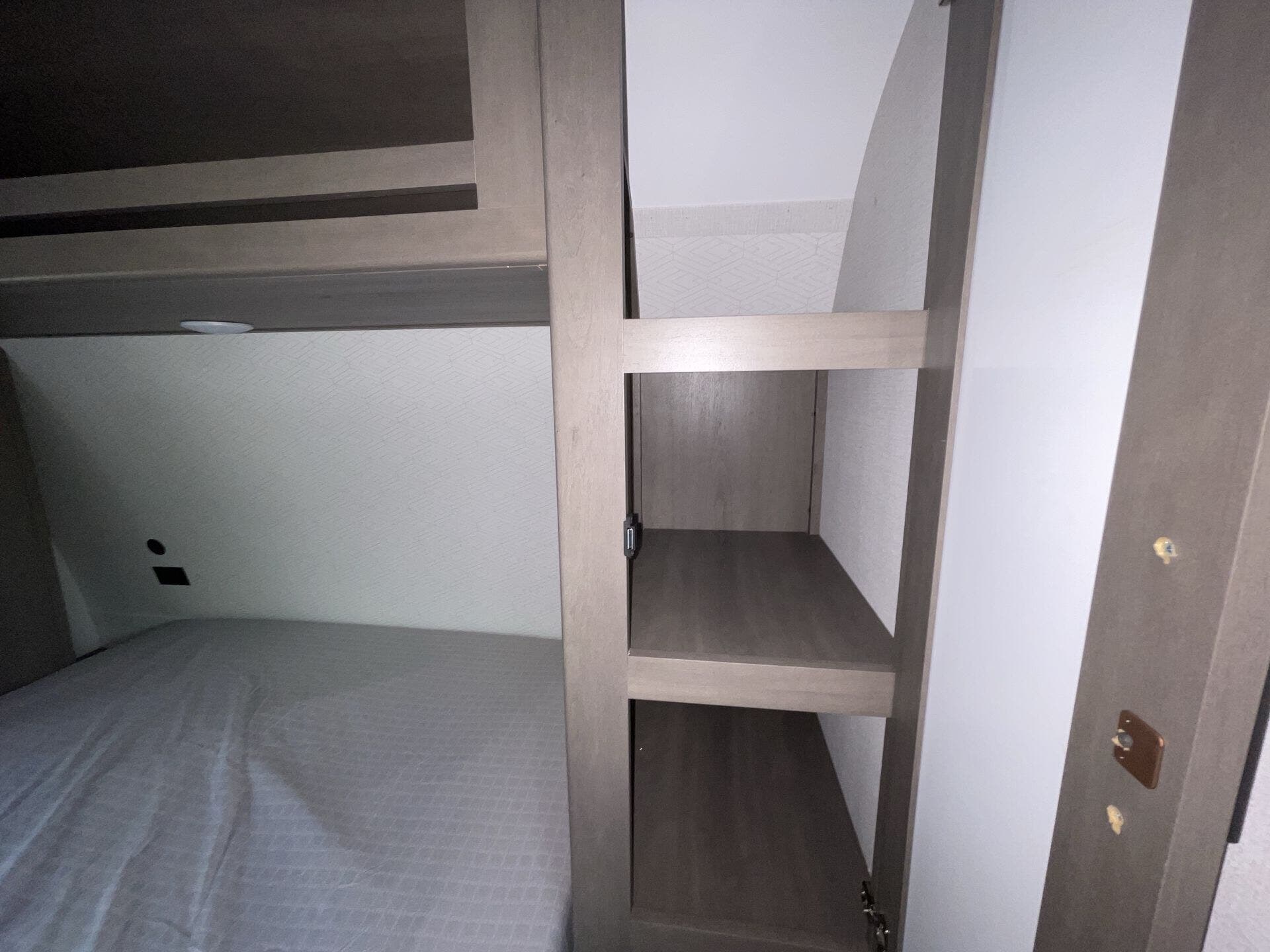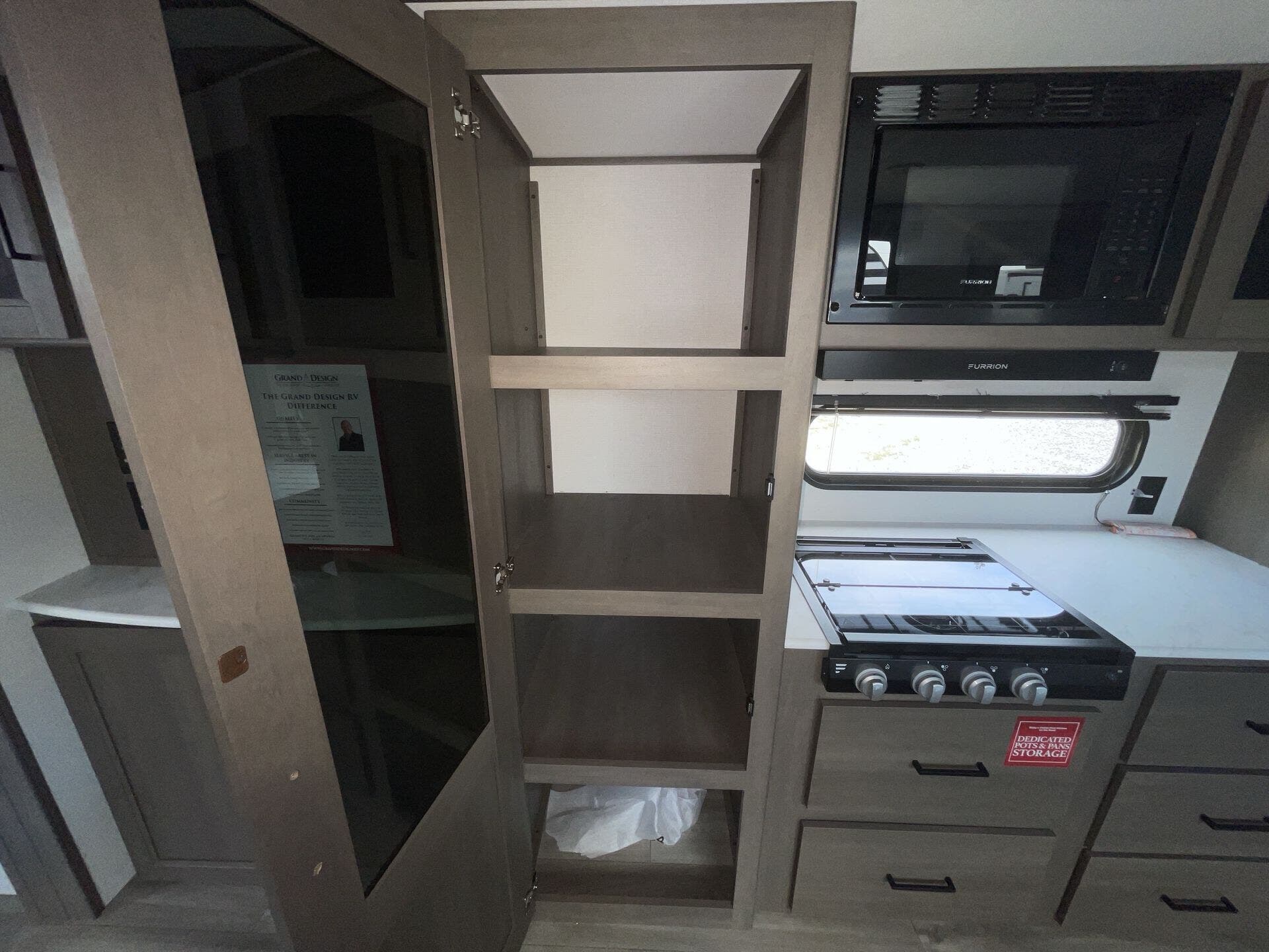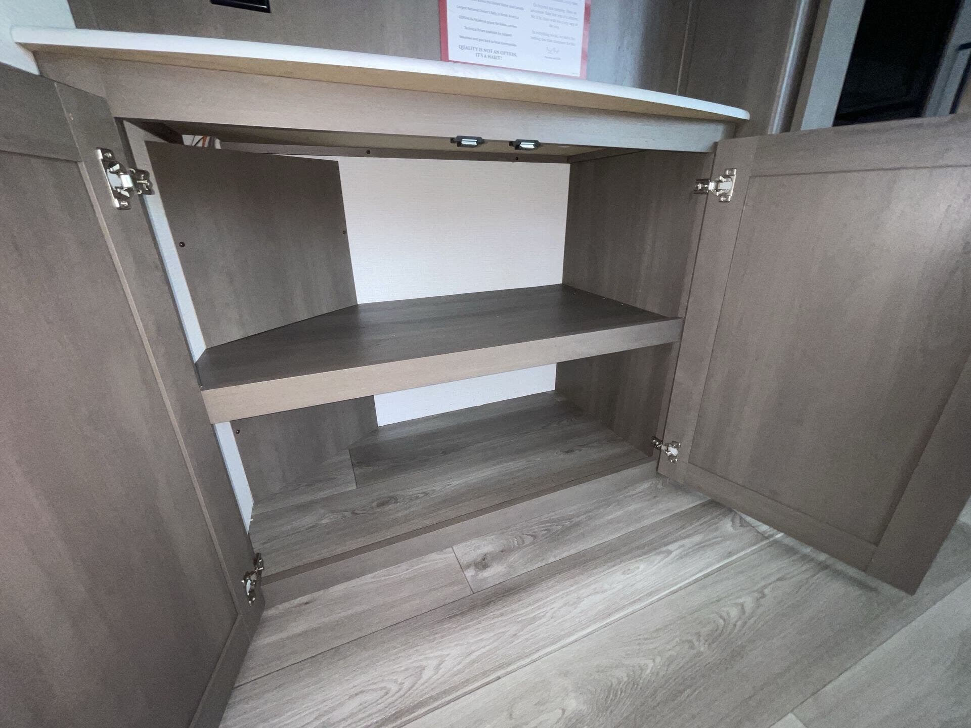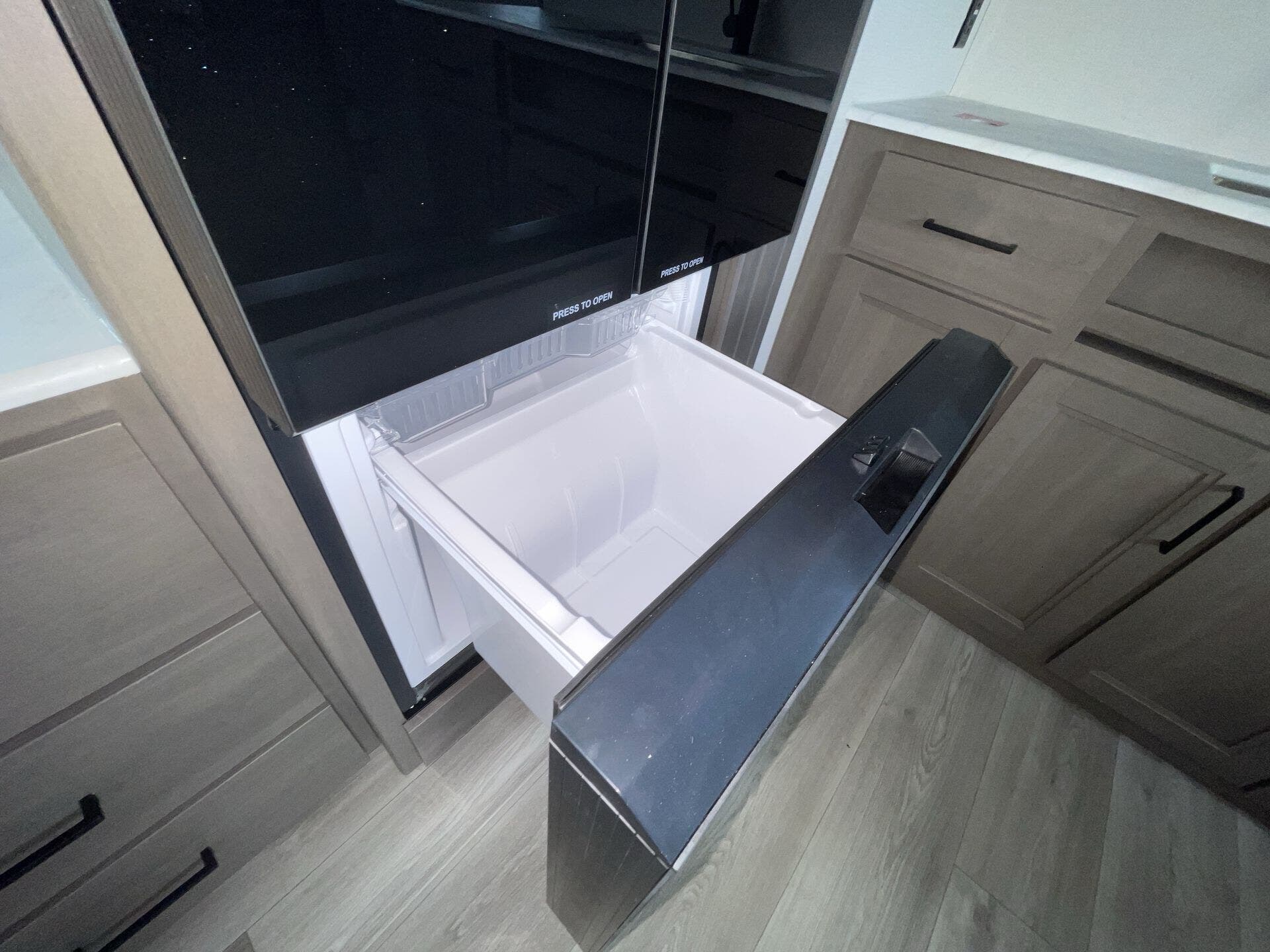 Inside, you'll find a smart floorplan featuring a versatile Murphy bed that folds down over a jackknife sofa, giving you both a living space during the day and a comfortable sleeping area at night. A booth dinette provides a cozy dining spot and converts into additional sleeping space if needed. The kitchen includes a two-burner cooktop, microwave, large refrigerator, and plenty of cabinetry for your camping essentials. The rear corner bathroom offers a full shower, foot-flush toilet, and vanity — all the conveniences of home in a well-organized layout.