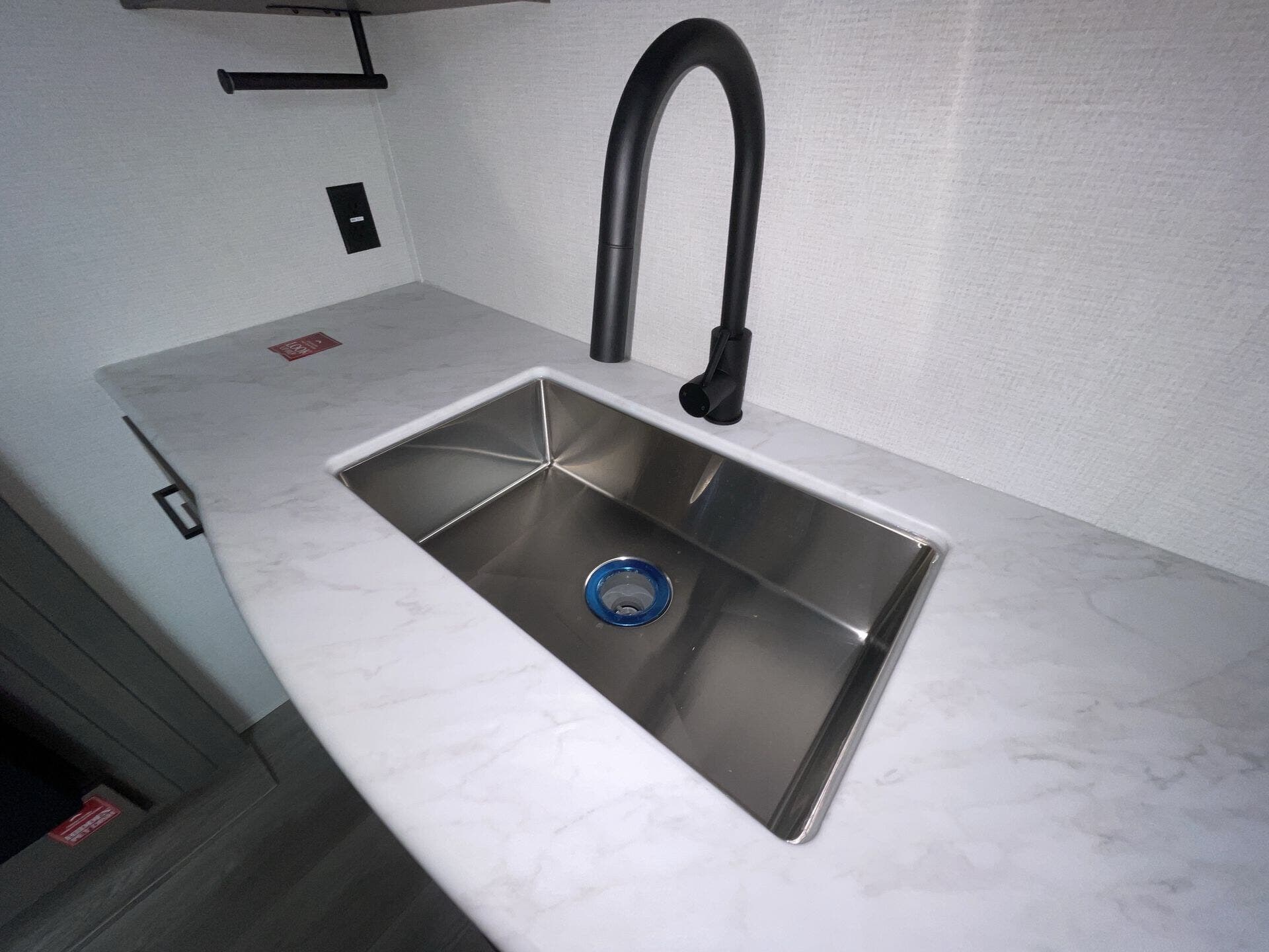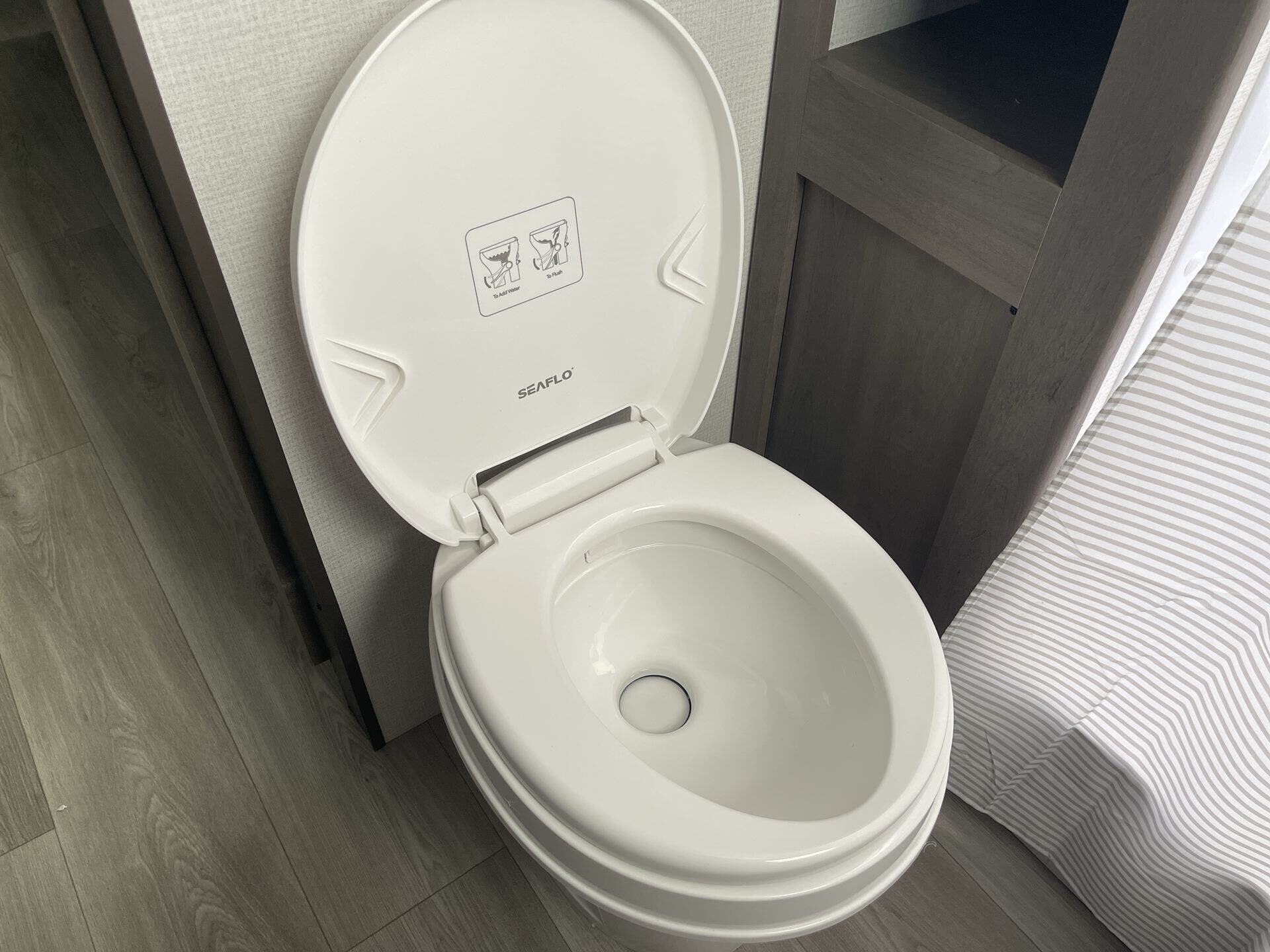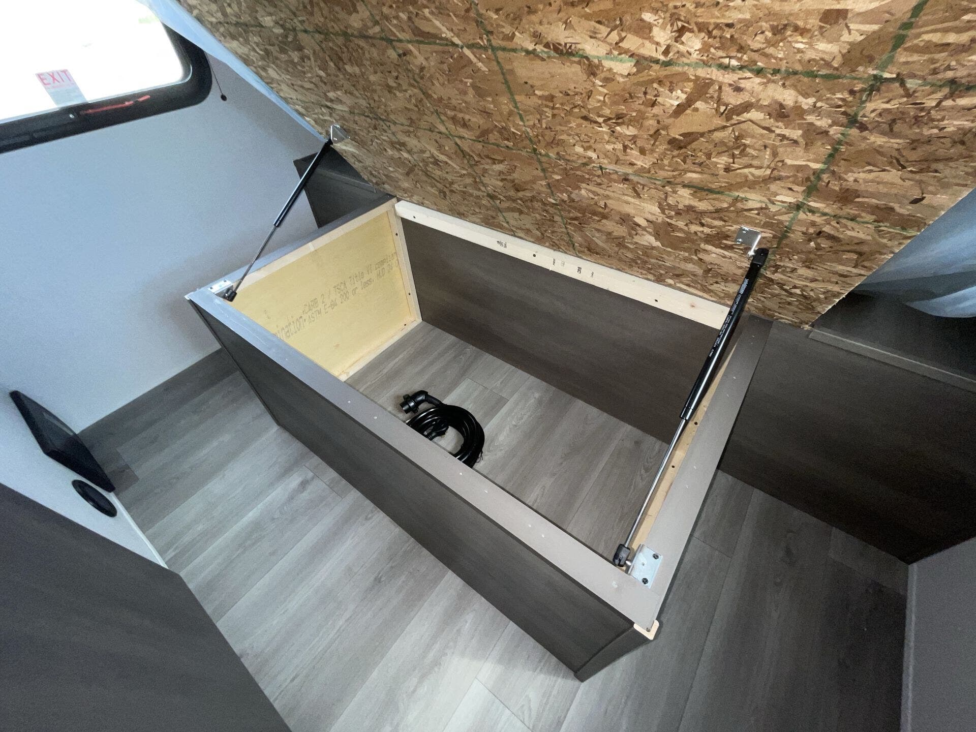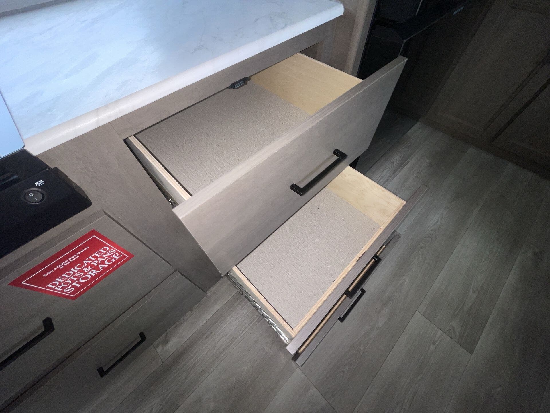 Inside, you'll find a smart floorplan featuring a versatile Murphy bed that folds down over a jackknife sofa, giving you both a living space during the day and a comfortable sleeping area at night. A booth dinette provides a cozy dining spot and converts into additional sleeping space if needed. The kitchen includes a two-burner cooktop, microwave, large refrigerator, and plenty of cabinetry for your camping essentials. The rear corner bathroom offers a full shower, foot-flush toilet, and vanity — all the conveniences of home in a well-organized layout.