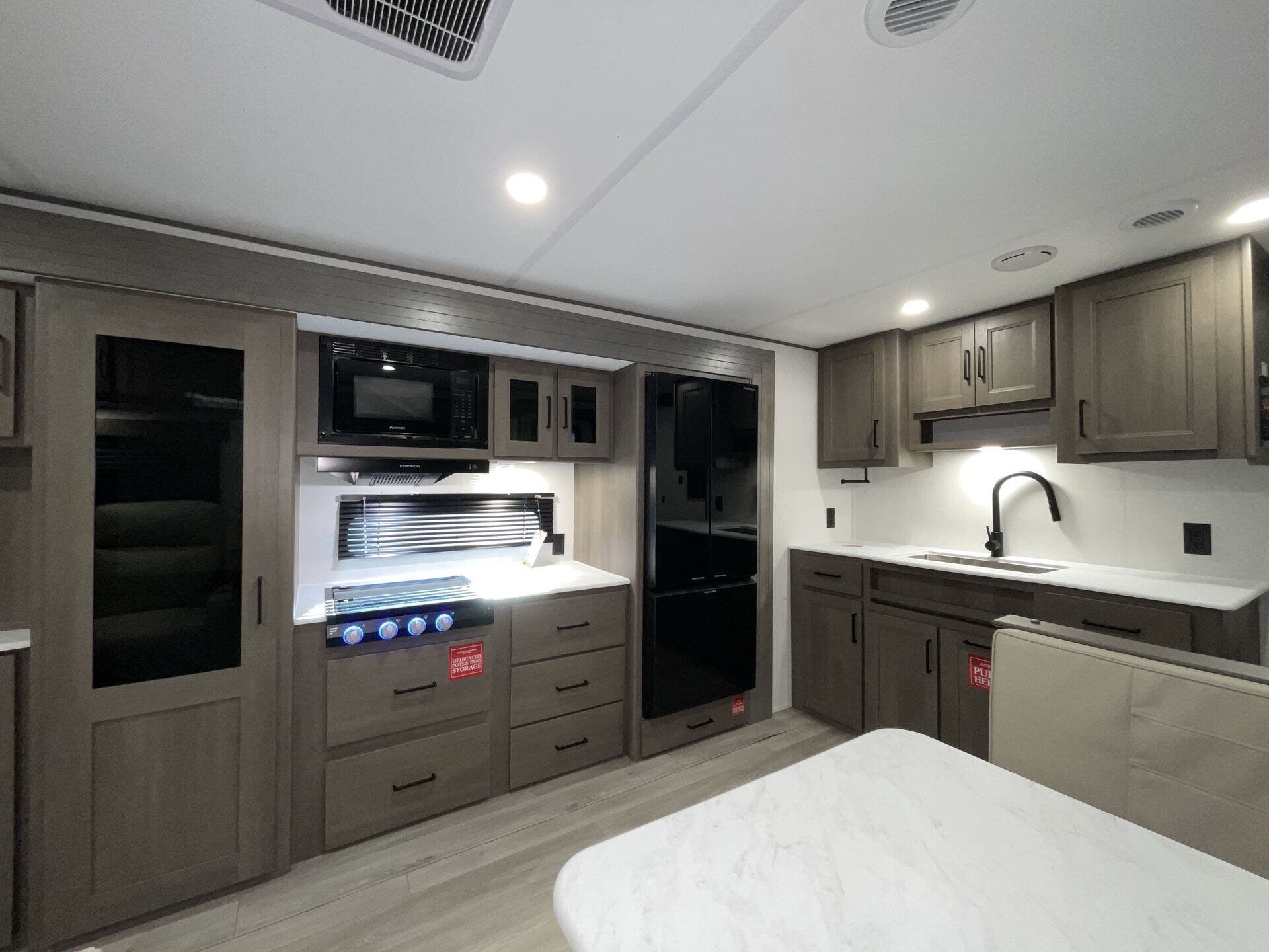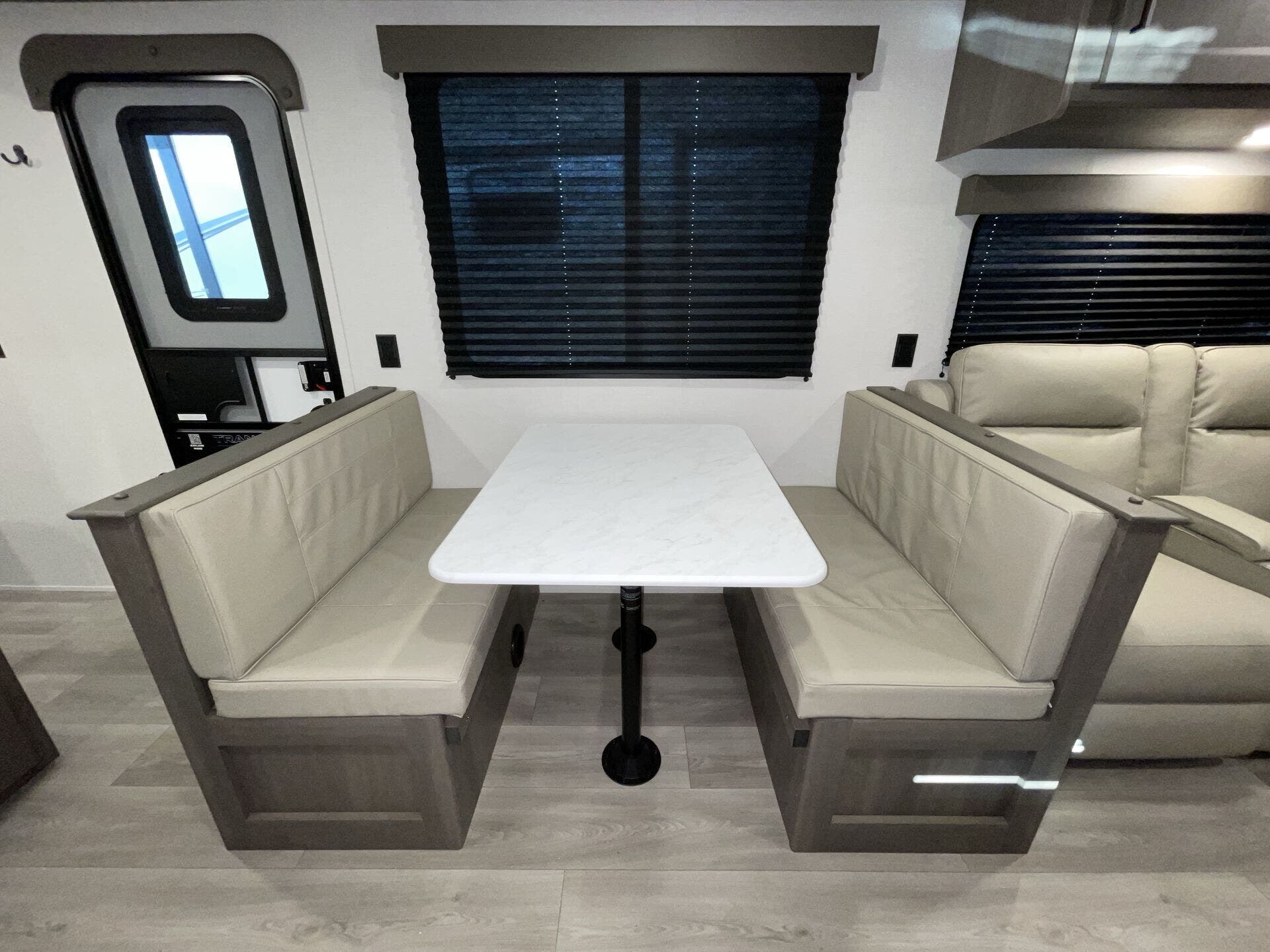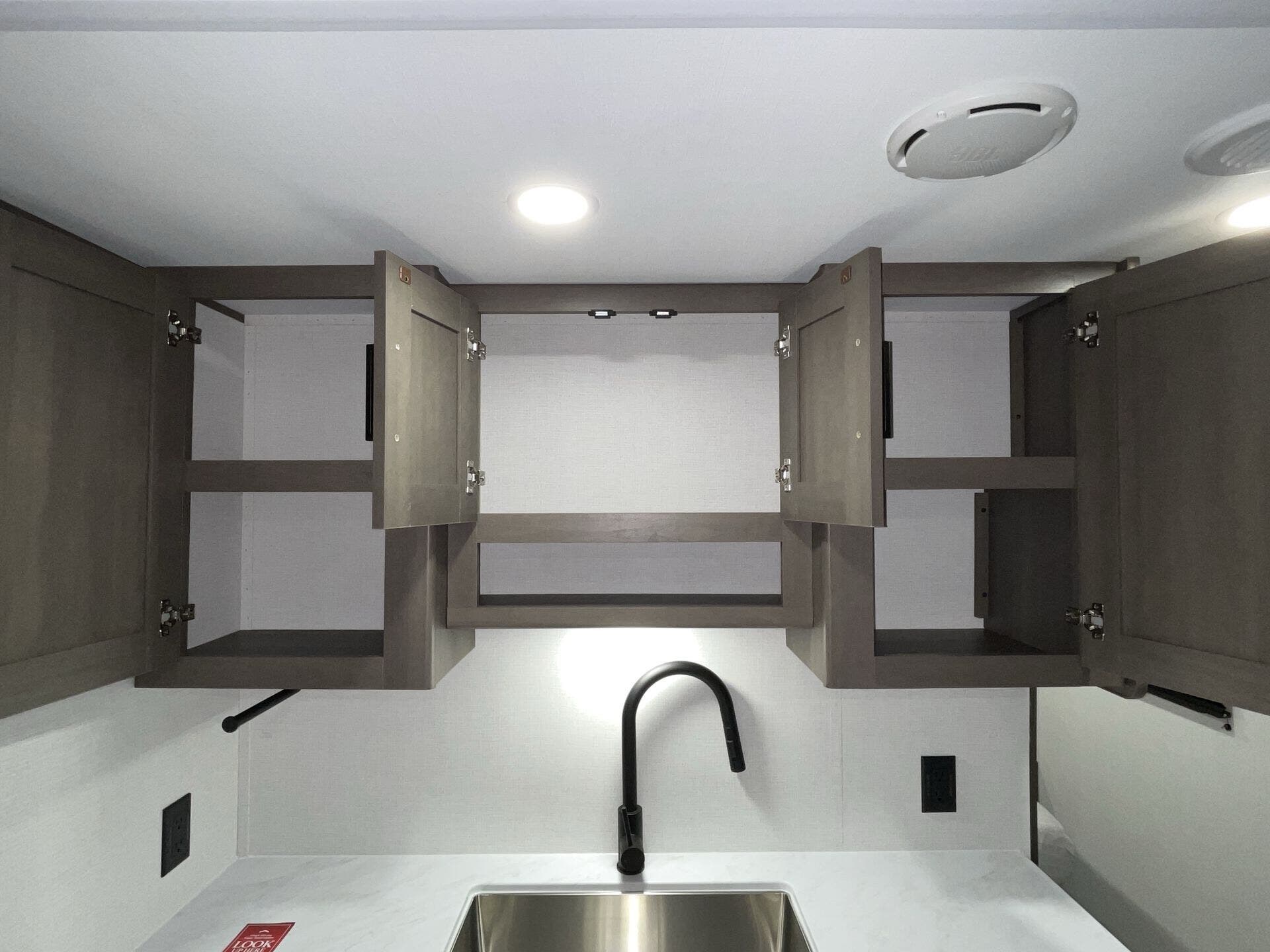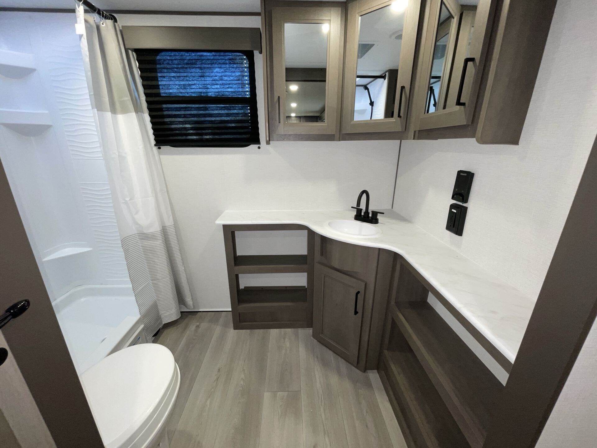Booth Dinette, Dinette Bed, Kitchen Sink, Medicine Cabinet, Overhead Cabinetry, Pet Friendly, Queen Bed, Roof Vents, Shower, Theater Seating, Toilet, Wardrobe(s)