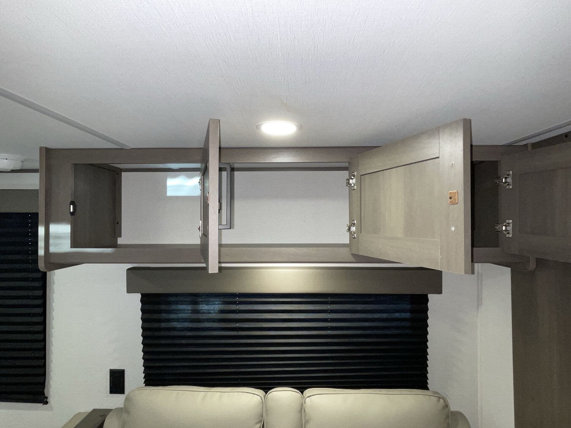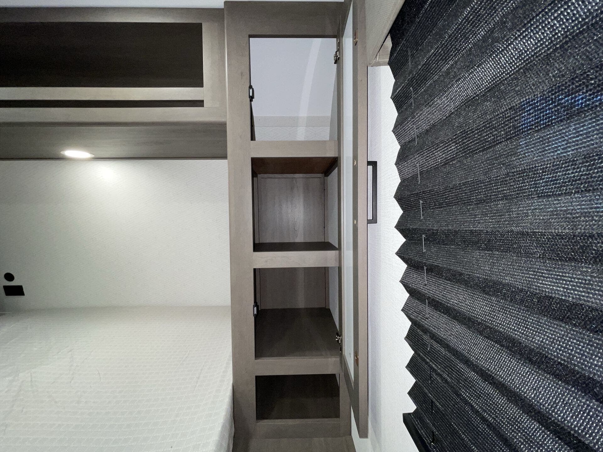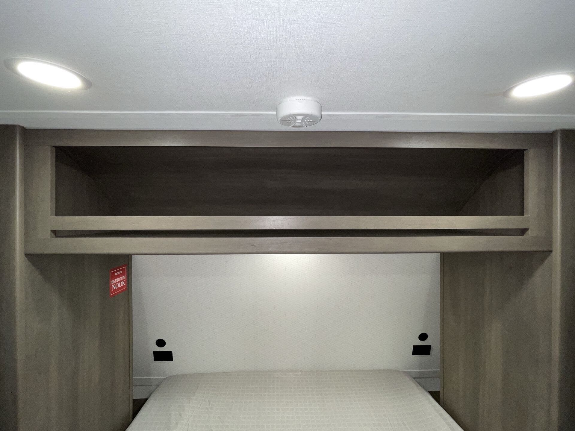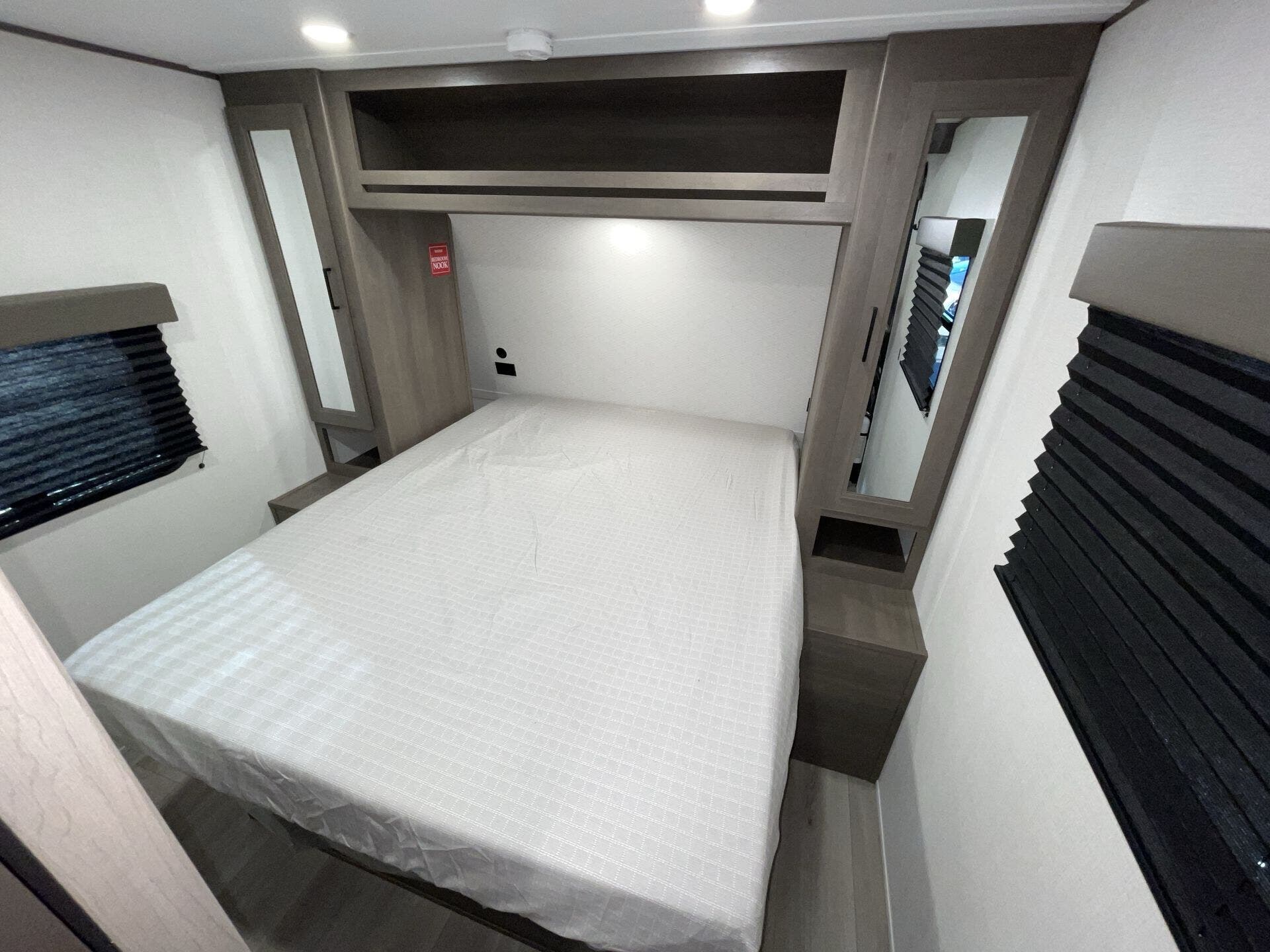 Private front bedroom with queen bed and overhead cabinetry