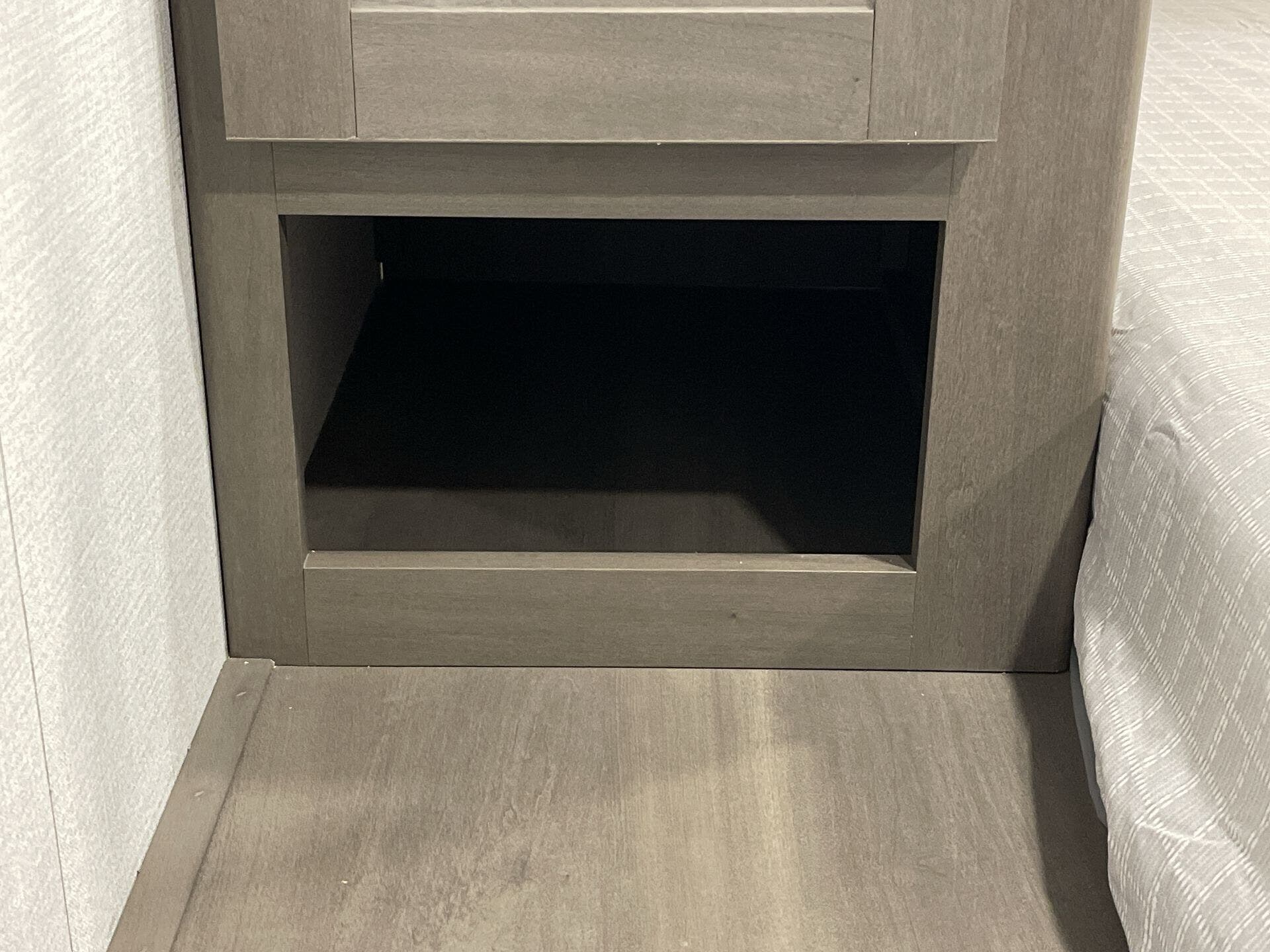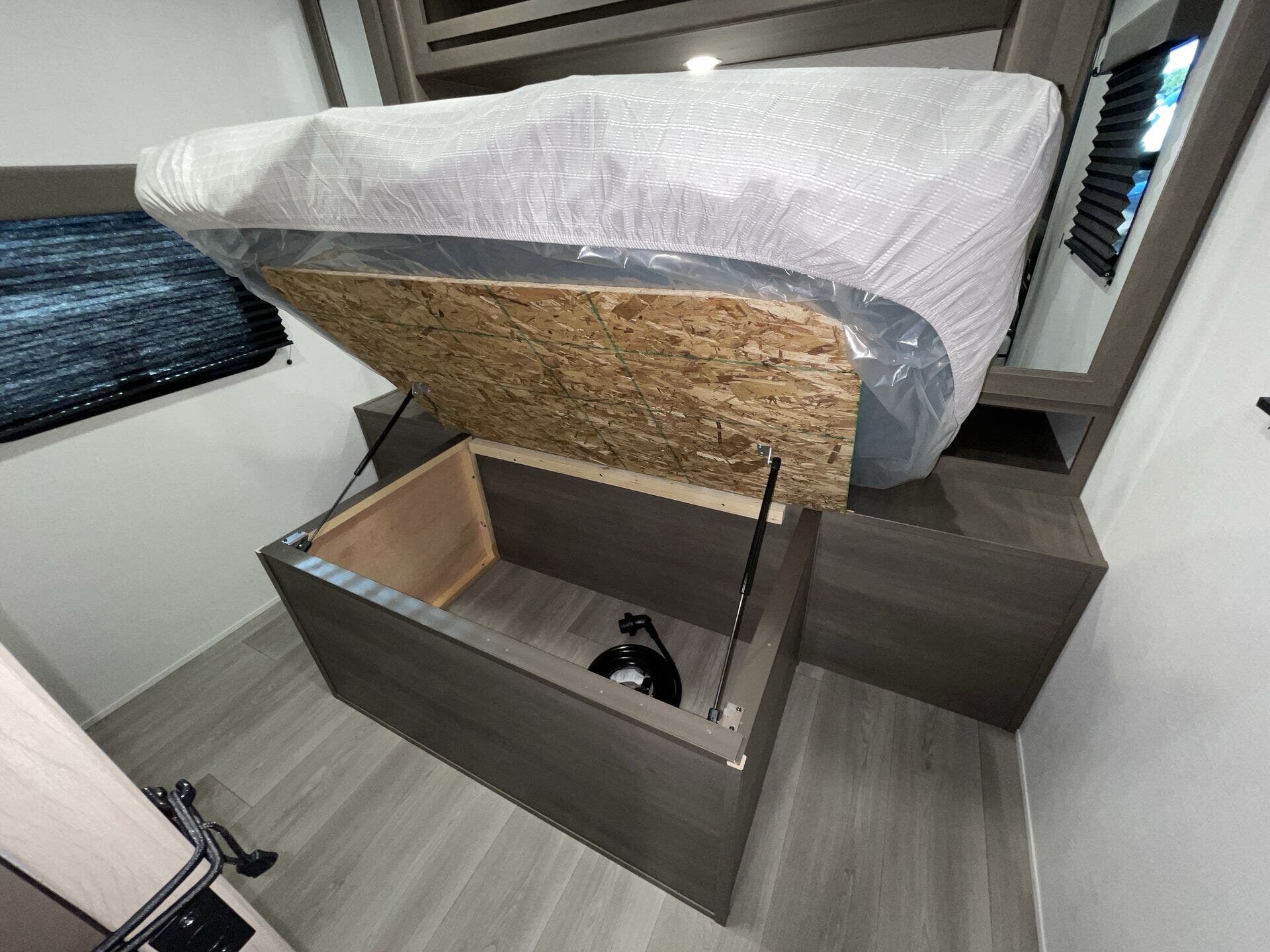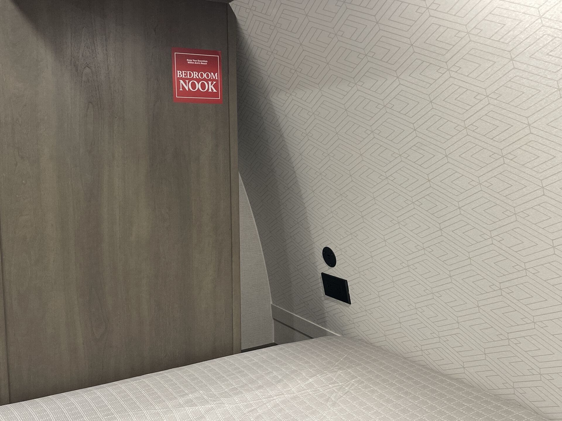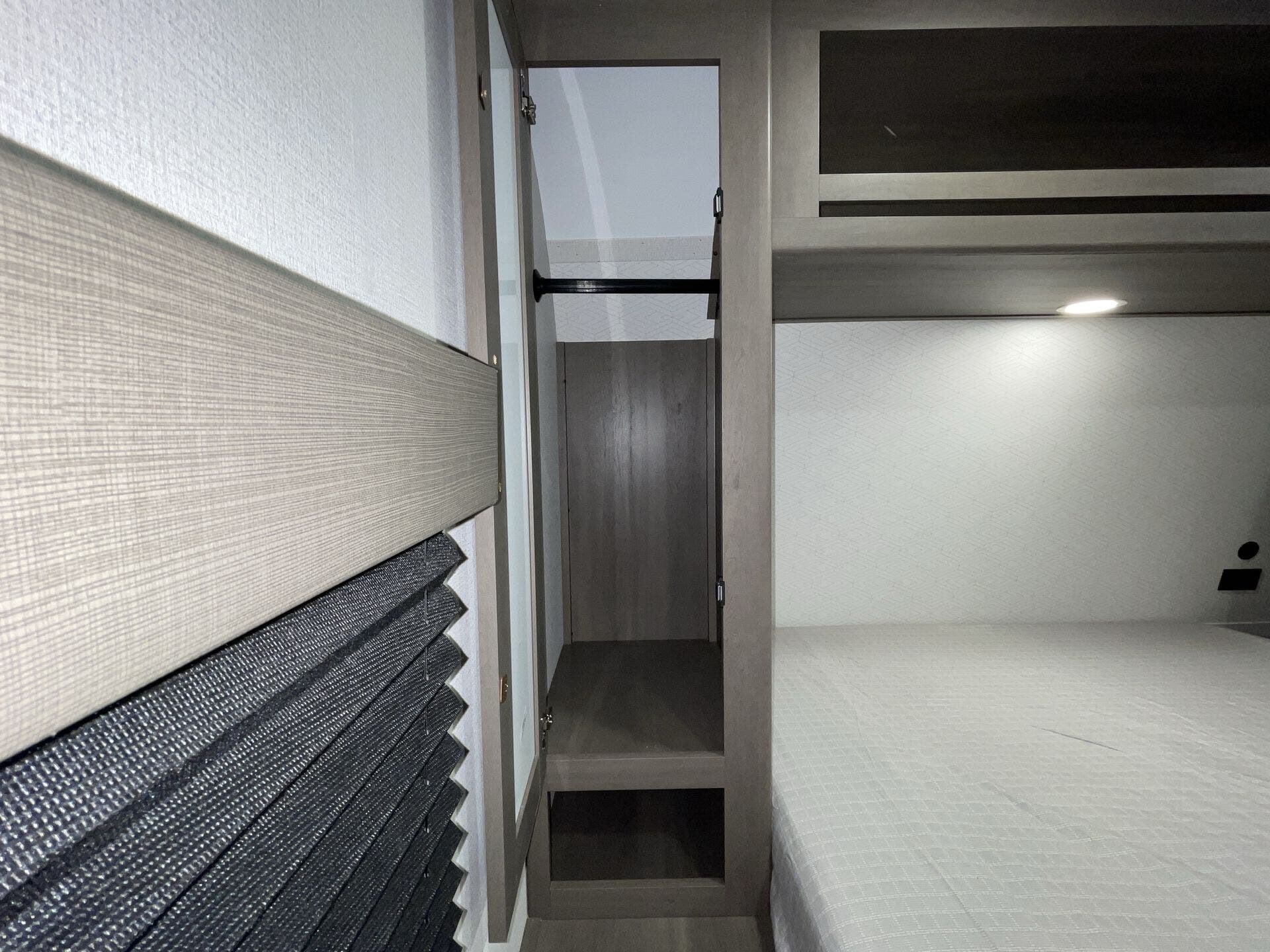 Private front bedroom with queen bed and overhead cabinetry