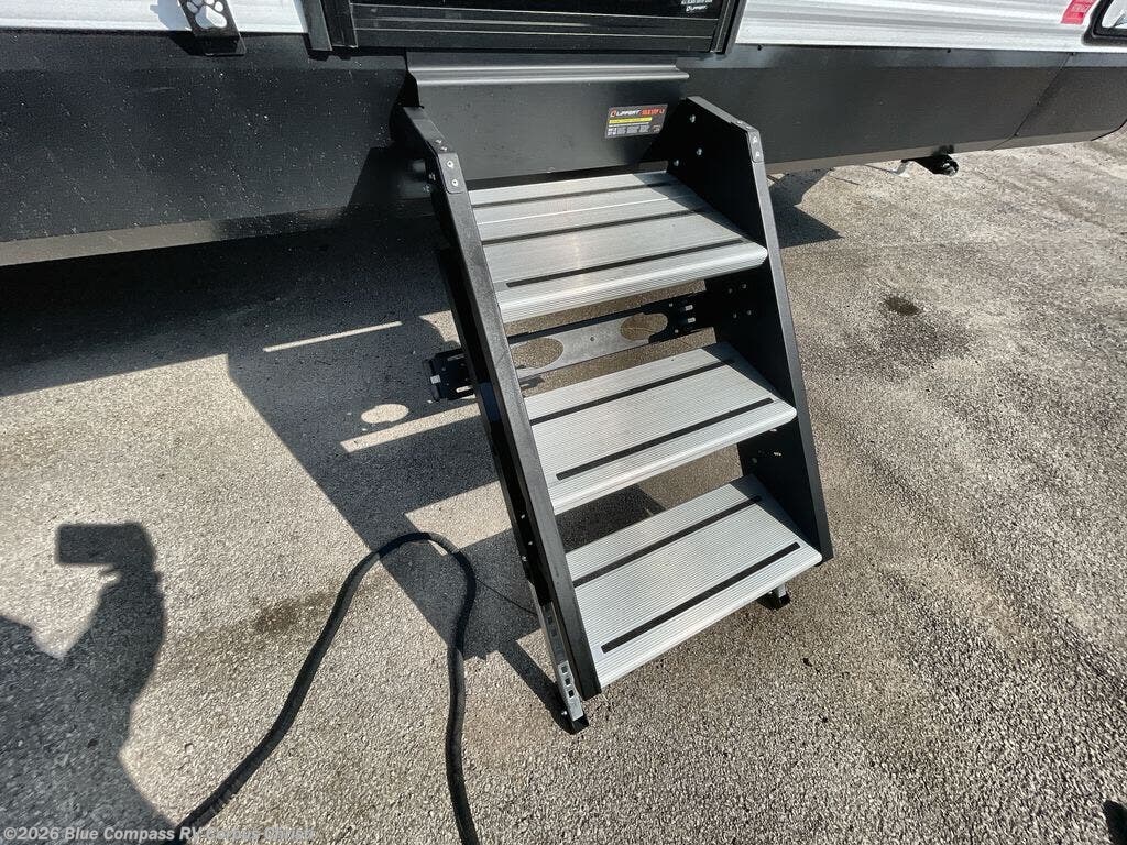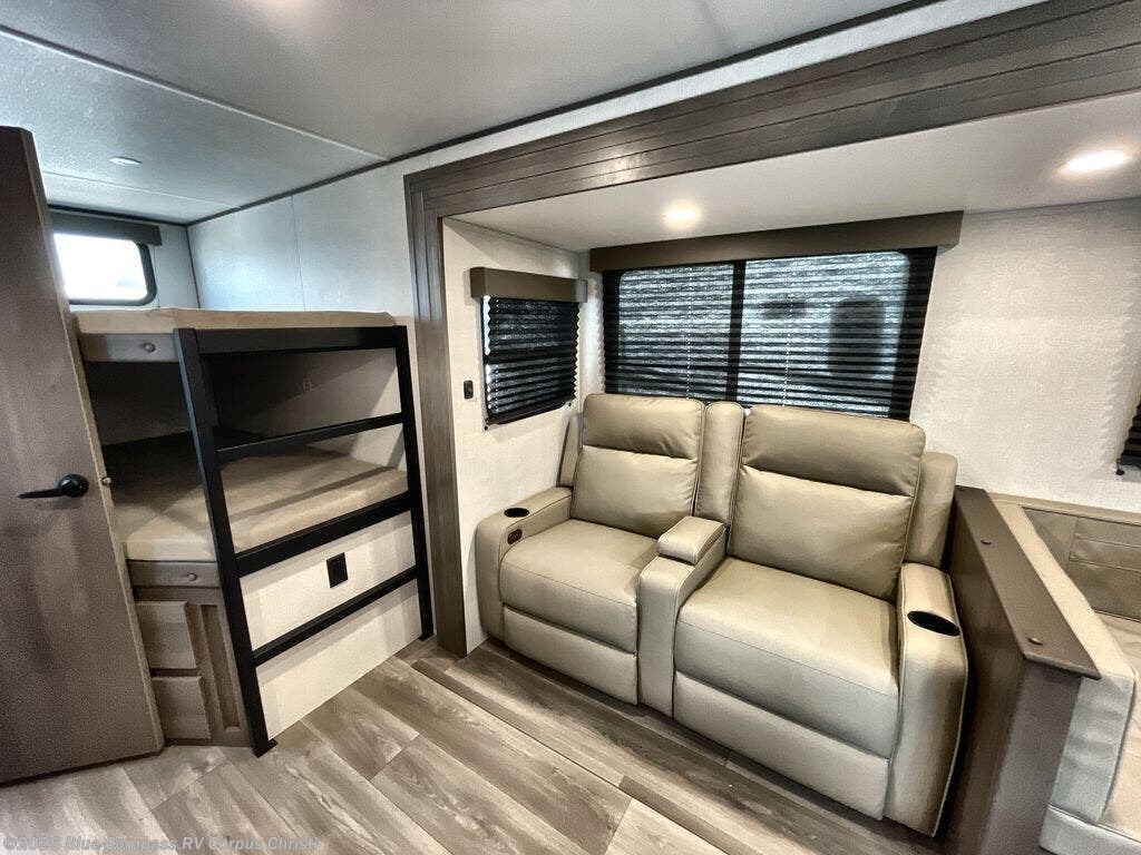 Get ready to take your travels to new heights with our incredible luxury travel trailer! The front bedroom has a queen bed, wardrobe, and overhead cabinets for all your favorite belongings, the perfect place to relax and recharge after a long day of adventure. The living room/kitchen combined area is equipped with a U-shaped dinette, three-burner cooktop, microwave, refrigerator, pantry, and 62” theater seating. Perfect for cooking up your favorite meals, entertaining friends and family, or simply relaxing and enjoying the comforts of home. The full bathroom is spacious and complete with a linen closet for added convenience. And with double-sized bunk beds featuring curtains and under-bunk storage, the kids will have their cozy retreat. But the adventure doesn't stop there! Outside, you'll find an exterior griddle with a 1.7 refrigerator, perfect for cooking up a storm in the great outdoors. And with a massive 19’ awning, you'll have plenty of shade and protection from the elements, plus, with two entry/exit doors and pass-through storage, you'll have easy access to the trailer and all your gear.