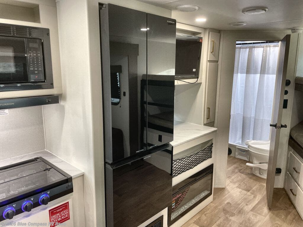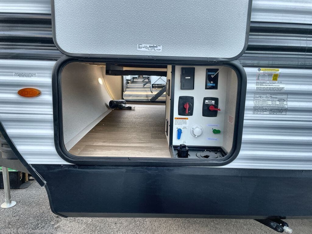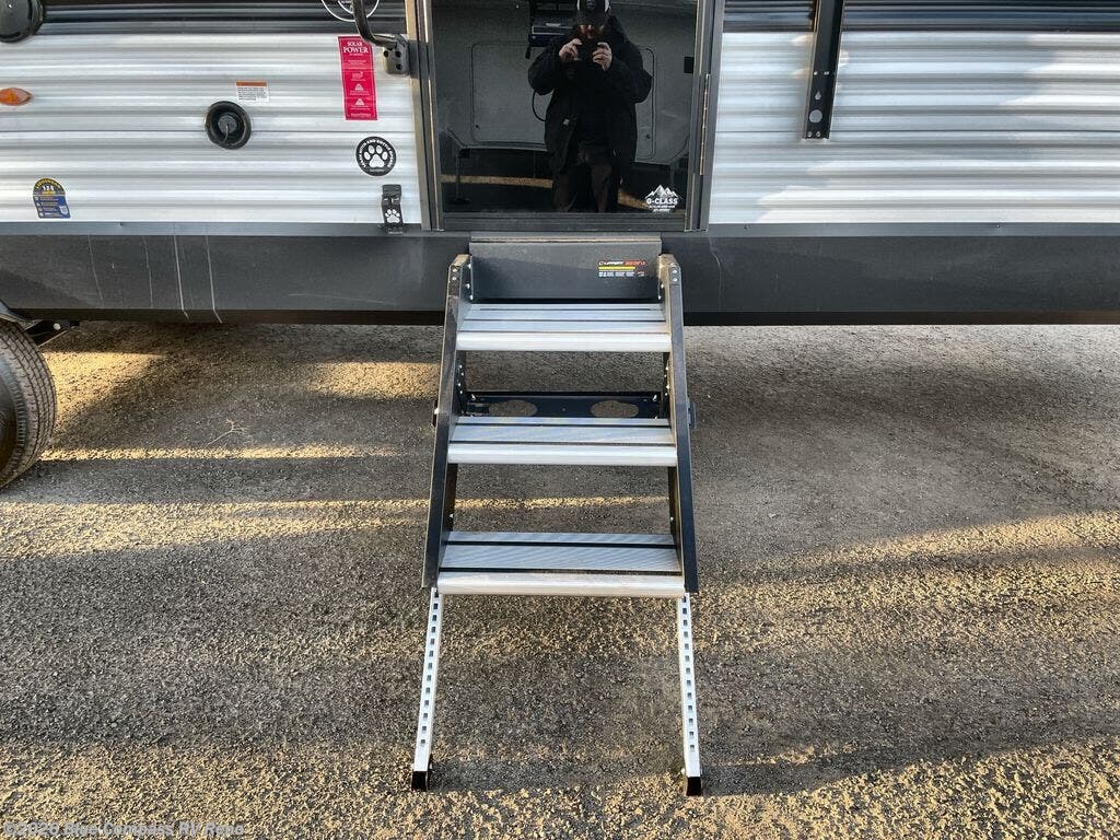Get ready to take your travels to new heights with our incredible luxury travel trailer! The front bedroom has a queen bed, wardrobe, and overhead cabinets for all your favorite belongings, the perfect place to relax and recharge after a long day of adventure. The living room/kitchen combined area is equipped with a U-shaped dinette, three-burner cooktop, microwave, refrigerator, and pantry. The full bathroom is spacious and complete with a linen closet for added convenience. And with double-sized bunk beds featuring curtains and under-bunk storage, the kids will have their cozy retreat. But the adventure doesn't stop there! Outside, you'll find an exterior griddle with a 1.7 refrigerator, perfect for cooking up a storm in the great outdoors. And with a massive 19’ awning, you'll have plenty of shade and protection from the elements, plus, with two entry/exit doors and pass-through storage, you'll have easy access to the trailer and all your gear.