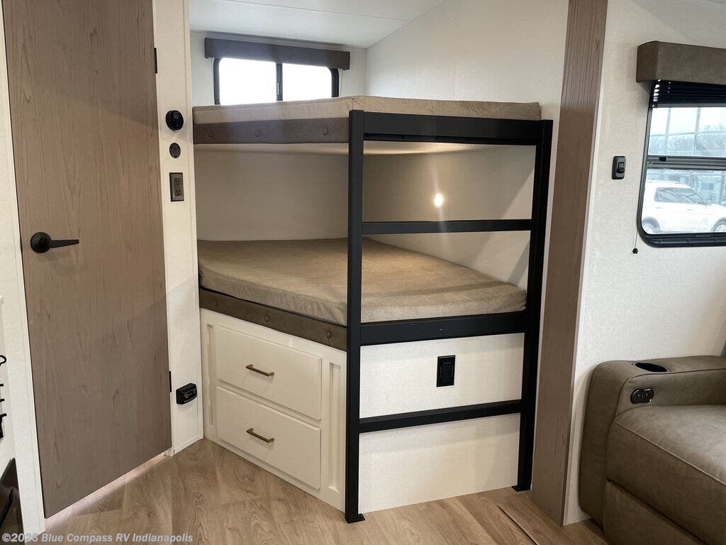 Get ready to take your travels to new heights with our incredible luxury travel trailer! The front bedroom has a queen bed, wardrobe, and overhead cabinets for all your favorite belongings, the perfect place to relax and recharge after a long day of adventure. The living room/kitchen combined area is equipped with a U-shaped dinette, three-burner cooktop, microwave, refrigerator, and pantry. The full bathroom is spacious and complete with a linen closet for added convenience. And with double-sized bunk beds featuring curtains and under-bunk storage, the kids will have their cozy retreat. But the adventure doesn't stop there! Outside, you'll find an exterior griddle with a 1.7 refrigerator, perfect for cooking up a storm in the great outdoors. And with a massive 19’ awning, you'll have plenty of shade and protection from the elements, plus, with two entry/exit doors and pass-through storage, you'll have easy access to the trailer and all your gear.