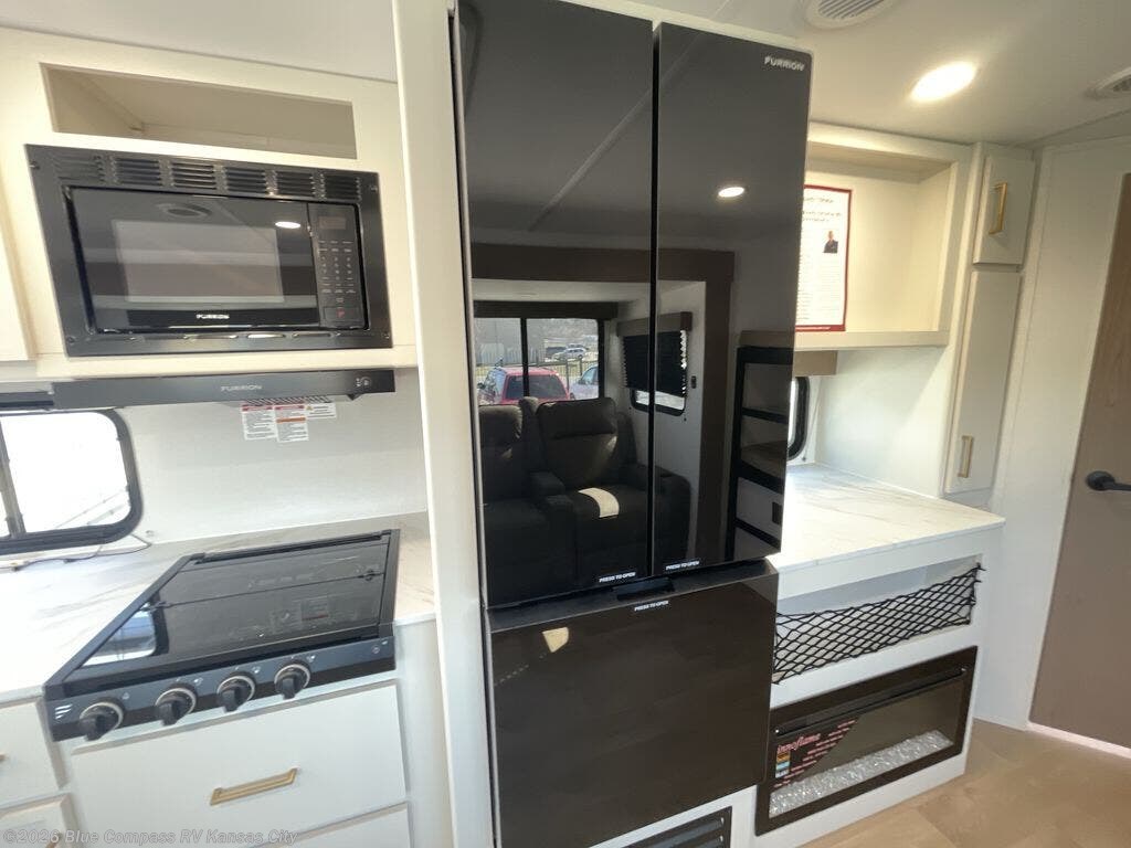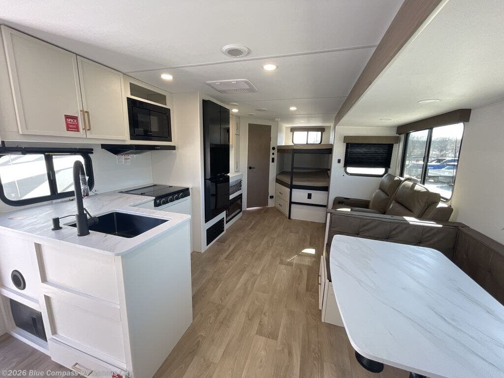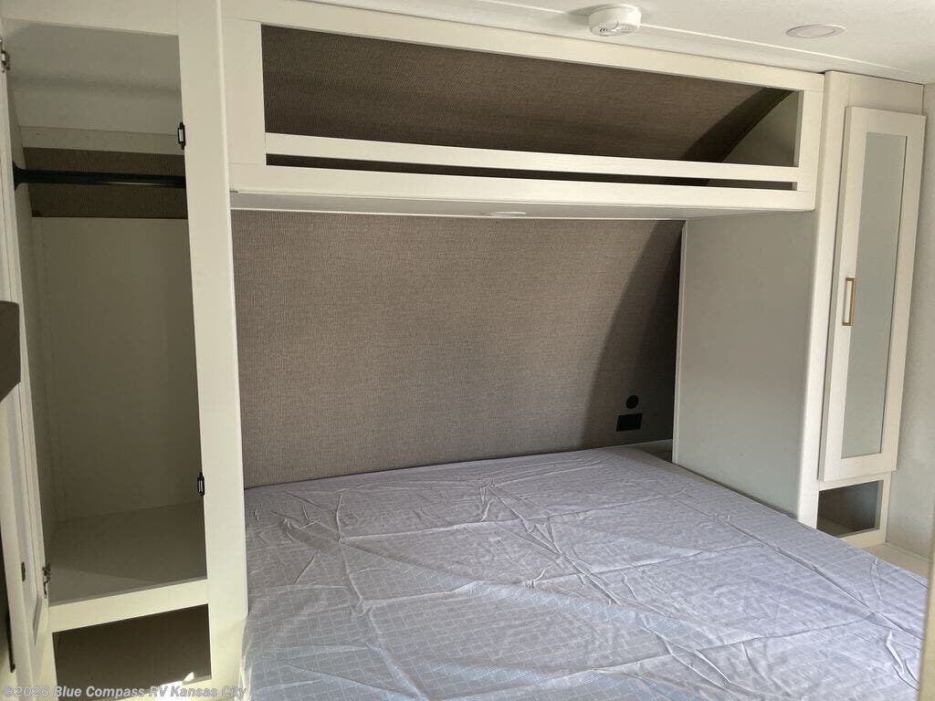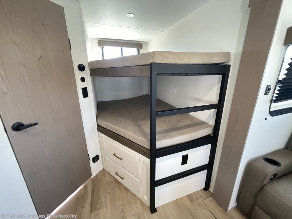 Get ready to take your travels to new heights with our incredible luxury travel trailer! The front bedroom has a queen bed, wardrobe, and overhead cabinets for all your favorite belongings, the perfect place to relax and recharge after a long day of adventure. The living room/kitchen combined area is equipped with a U-shaped dinette, three-burner cooktop, microwave, refrigerator, and pantry. The full bathroom is spacious and complete with a linen closet for added convenience. And with double-sized bunk beds featuring curtains and under-bunk storage, the kids will have their cozy retreat. But the adventure doesn't stop there! Outside, you'll find an exterior griddle with a 1.7 refrigerator, perfect for cooking up a storm in the great outdoors. And with a massive 19’ awning, you'll have plenty of shade and protection from the elements, plus, with two entry/exit doors and pass-through storage, you'll have easy access to the trailer and all your gear.
