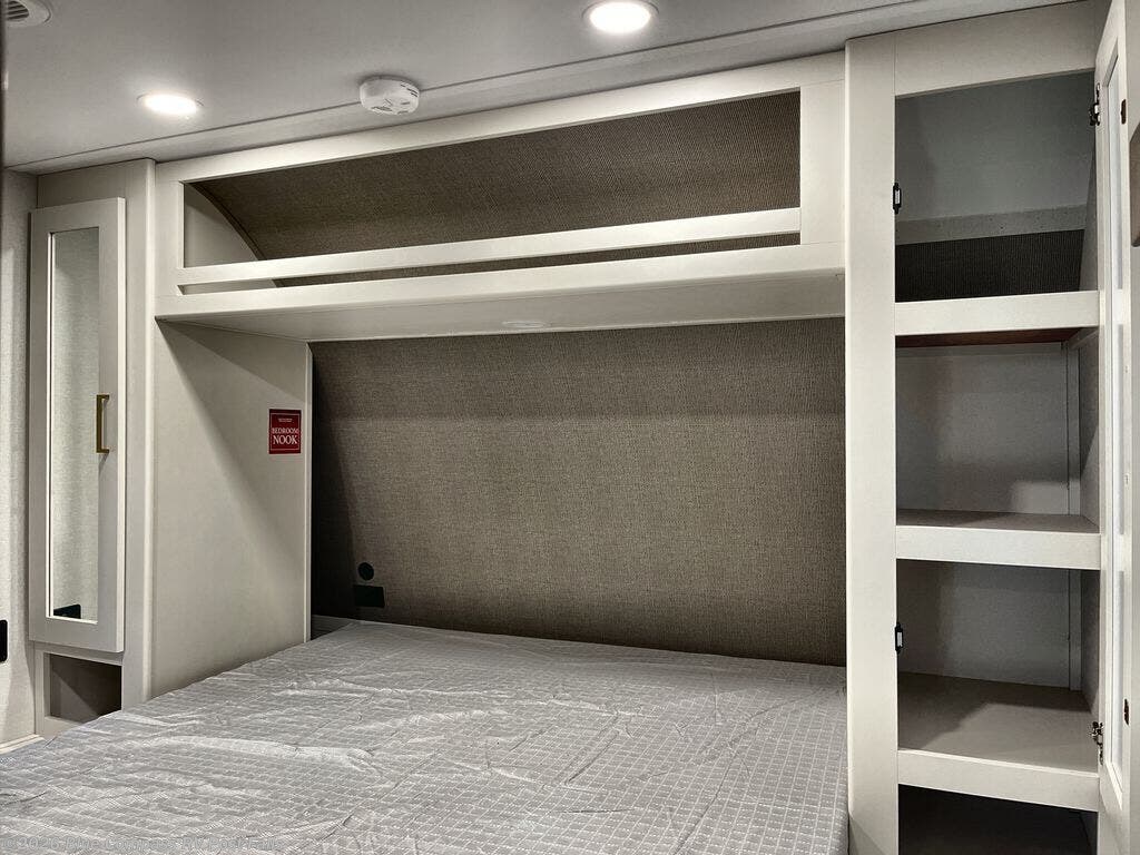 Get ready to take your travels to new heights with our incredible luxury travel trailer! The front bedroom has a queen bed, wardrobe, and overhead cabinets for all your favorite belongings, the perfect place to relax and recharge after a long day of adventure. The living room/kitchen combined area is equipped with a U-shaped dinette, three-burner cooktop, microwave, refrigerator, and pantry. The full bathroom is spacious and complete with a linen closet for added convenience. And with double-sized bunk beds featuring curtains and under-bunk storage, the kids will have their cozy retreat. But the adventure doesn't stop there! Outside, you'll find an exterior griddle with a 1.7 refrigerator, perfect for cooking up a storm in the great outdoors. And with a massive 19’ awning, you'll have plenty of shade and protection from the elements, plus, with two entry/exit doors and pass-through storage, you'll have easy access to the trailer and all your gear.