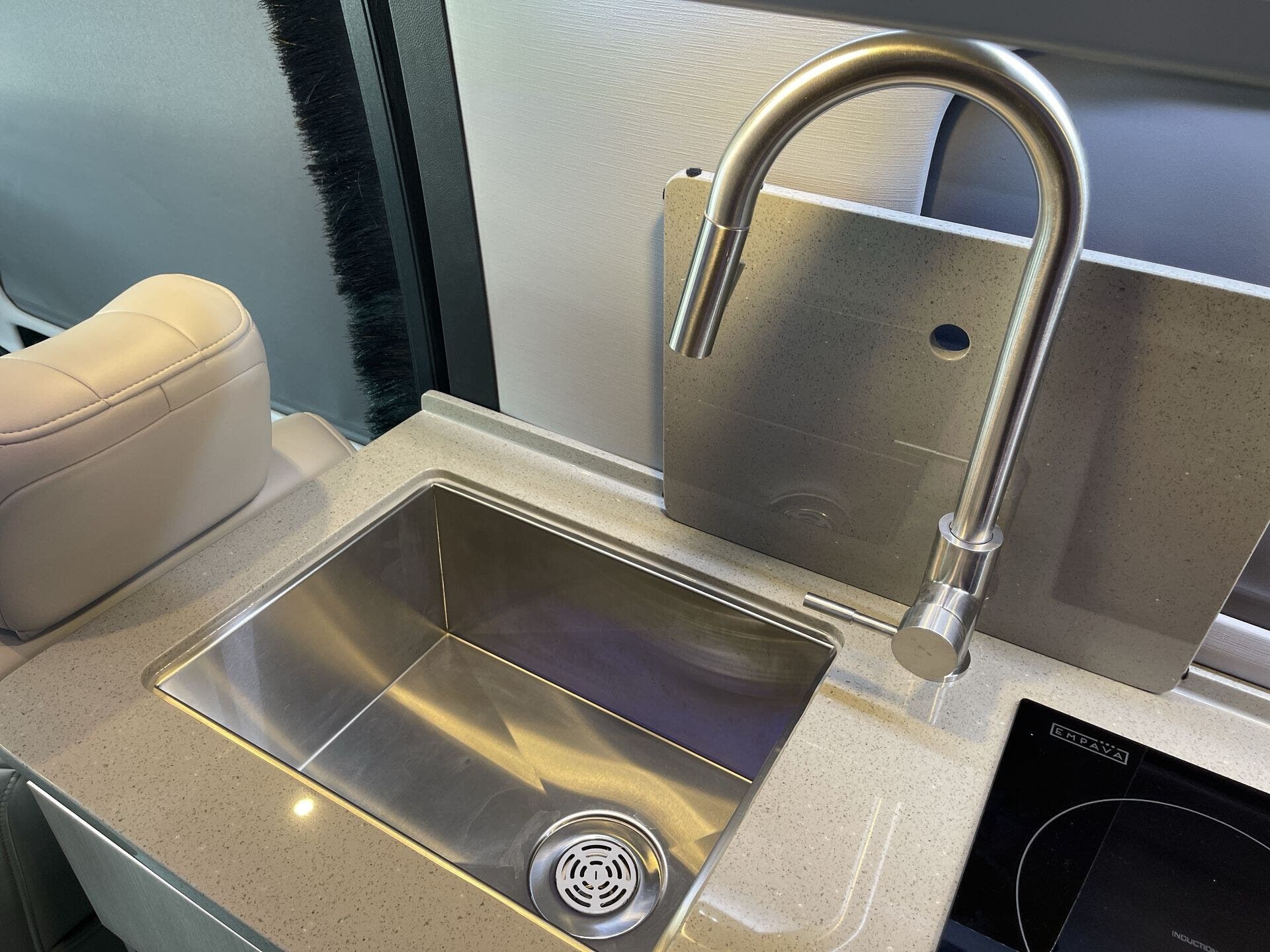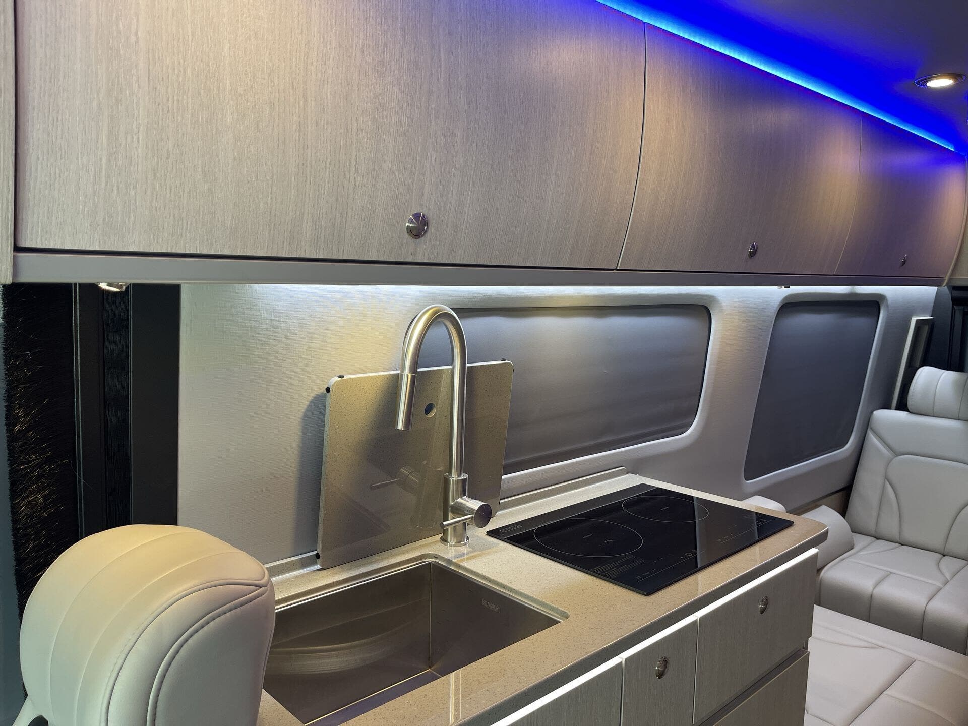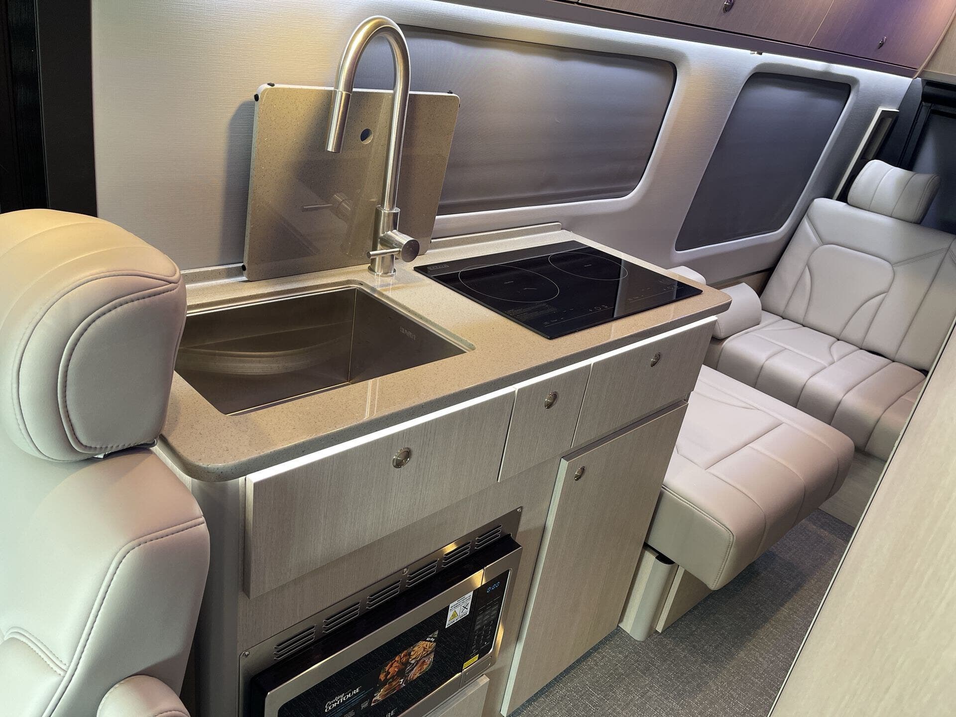 The kitchen is equipped with a two-burner induction cooktop, refrigerator/freezer combo, and quartz countertops. A spacious wet bath includes a window, sink, and porcelain toilet with macerator, ensuring all the comforts of home are available on the road.
