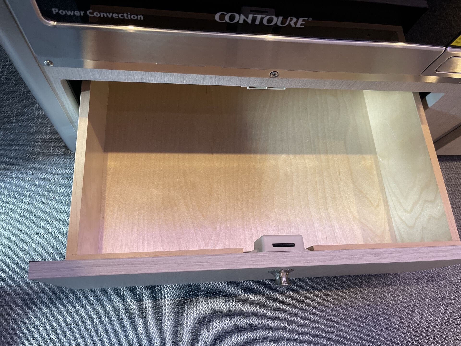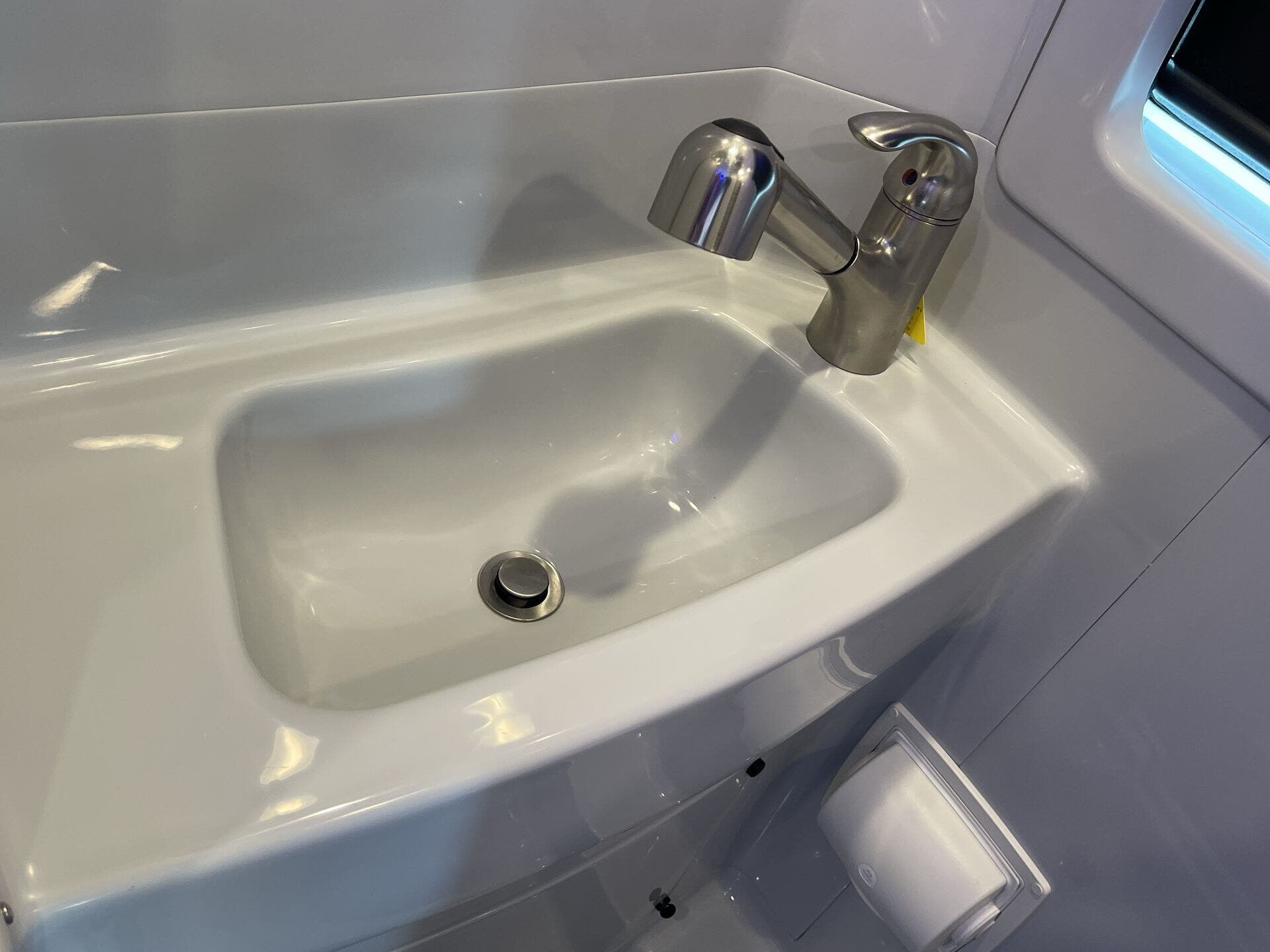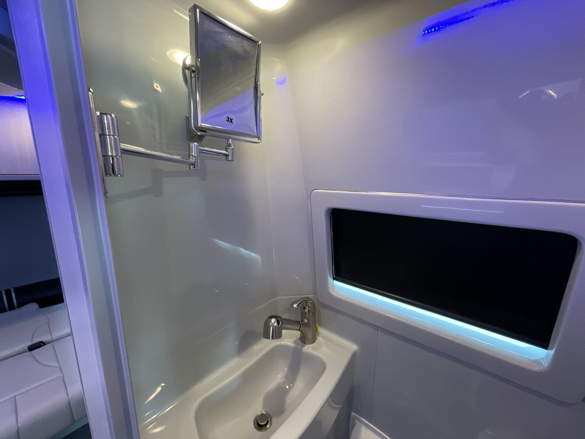 The kitchen is equipped with a two-burner induction cooktop, refrigerator/freezer combo, and quartz countertops. A spacious wet bath includes a window, sink, and porcelain toilet with macerator, ensuring all the comforts of home are available on the road.
