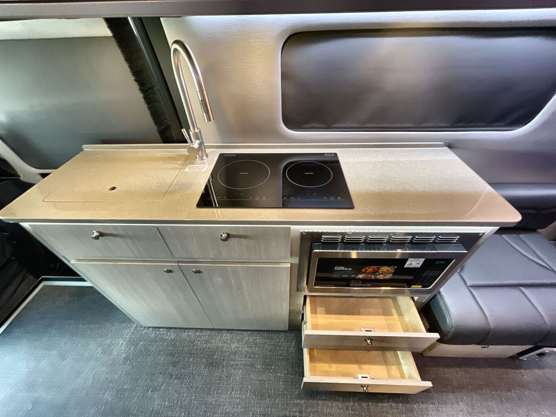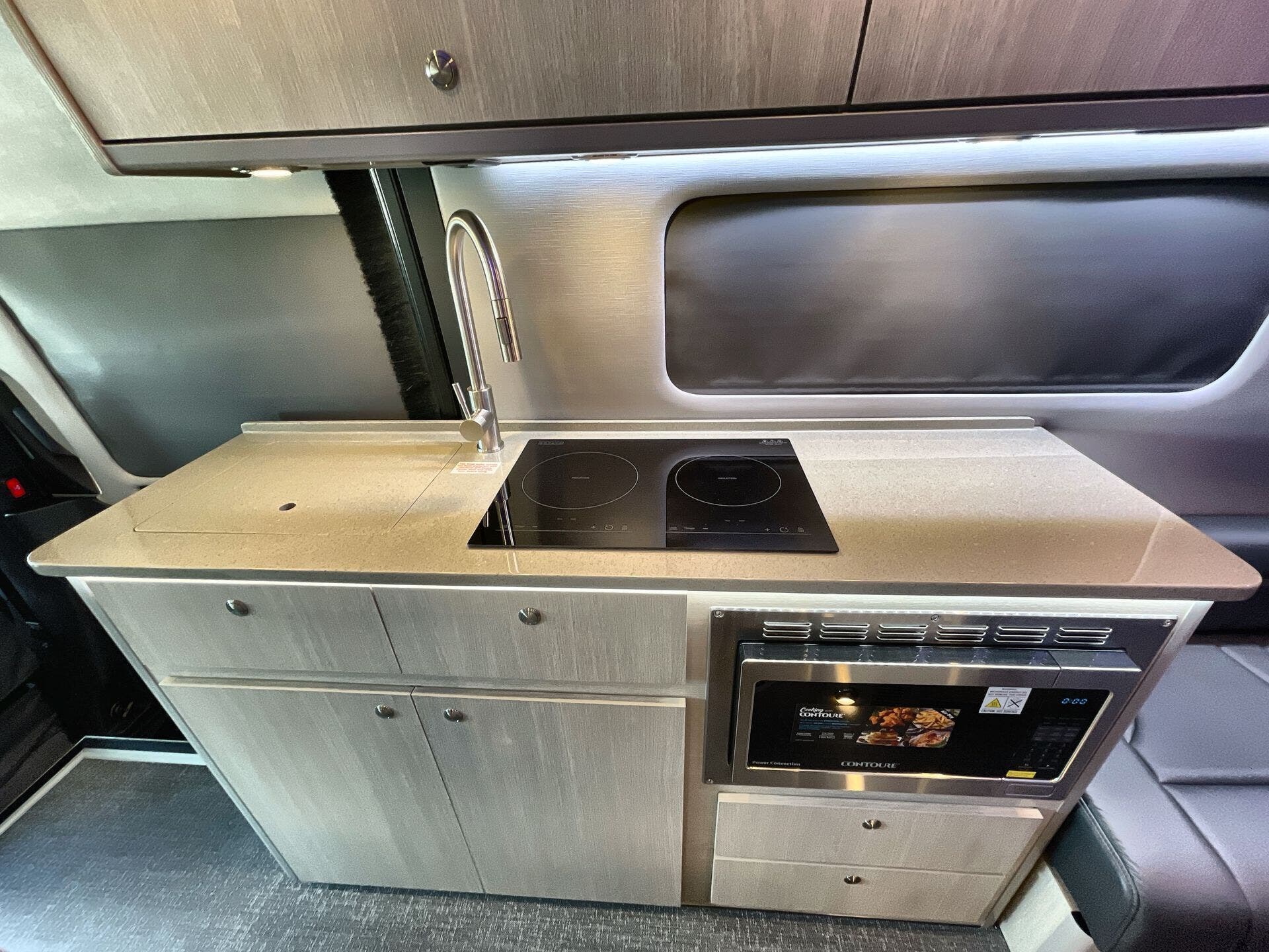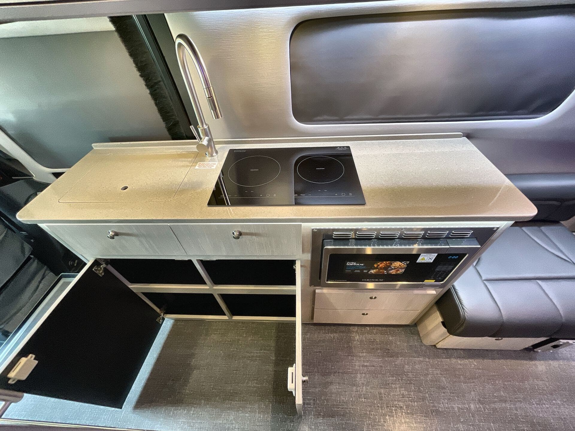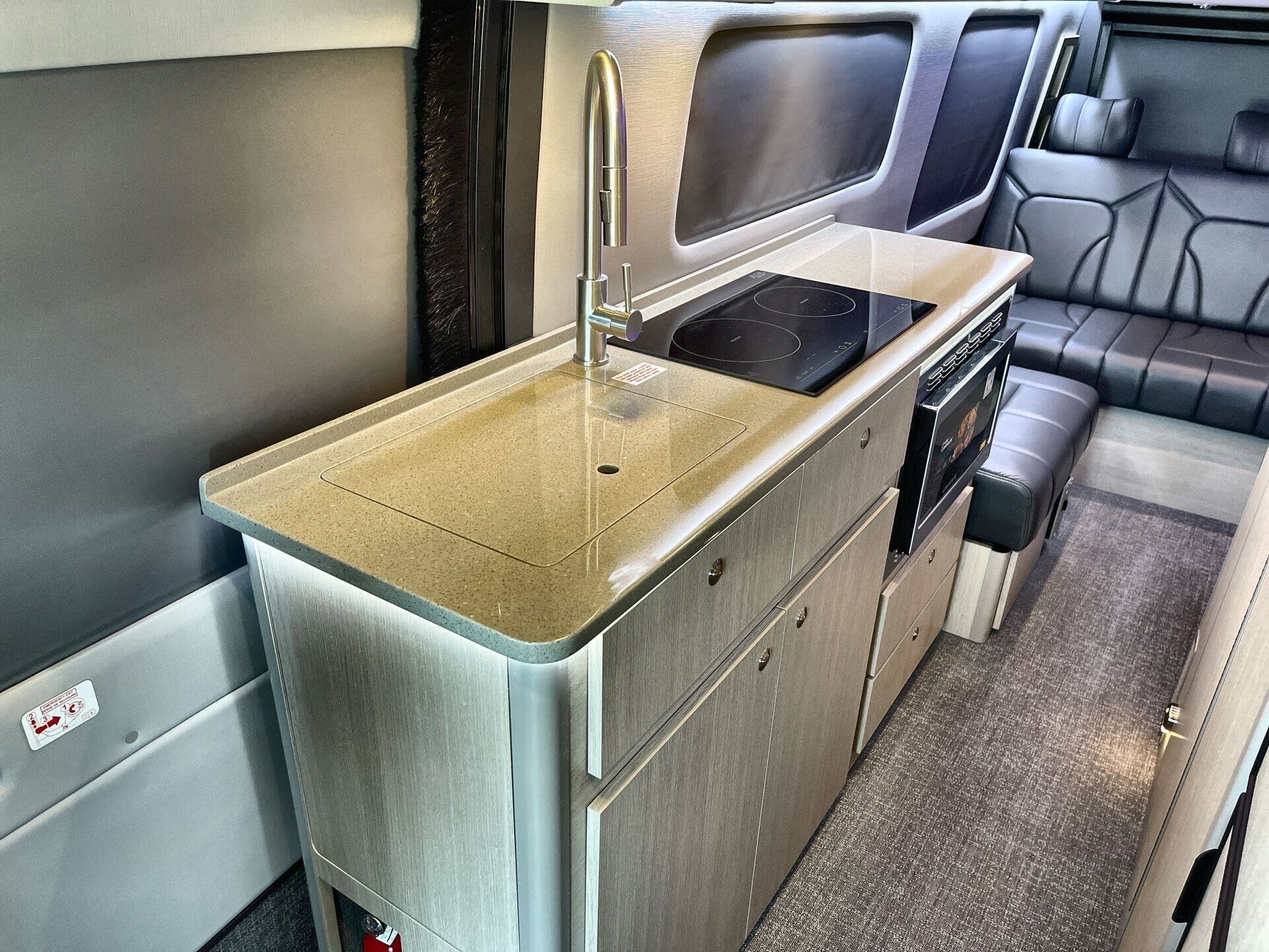The AWD TOUR-ION floorplan integrates smart living spaces with a mid bath and mid kitchen, plus a rear bedroom and rear entertainment configuration. Inside, you’ll find a thoughtfully engineered kitchen setup with a microwave, refrigerator, and stove top burner, complemented by overhead cabinetry and a dedicated kitchen sink. The combination of compact yet efficient spaces supports comfortable daily living on the road, while the rear bedroom offers a private retreat after a day of exploration.