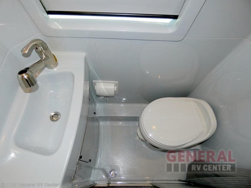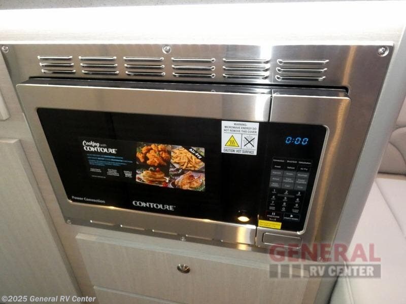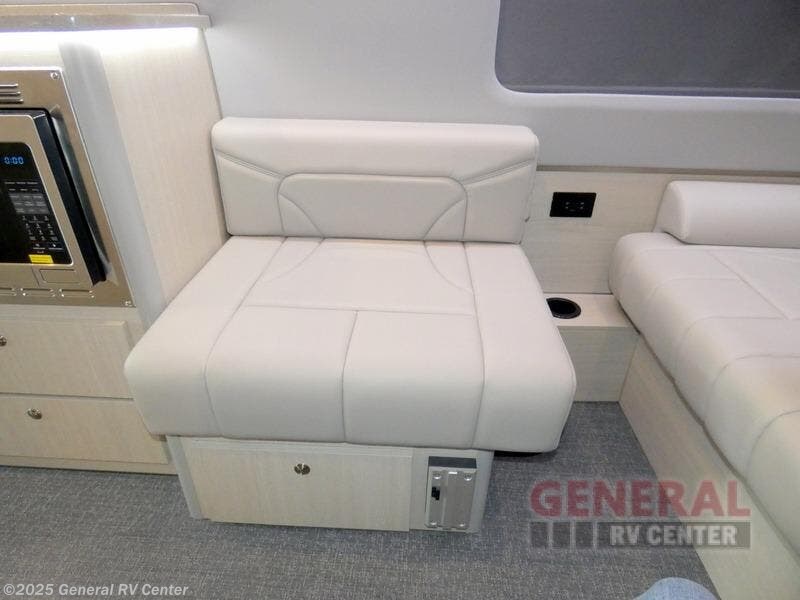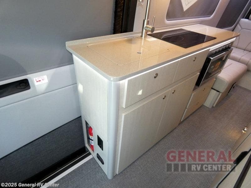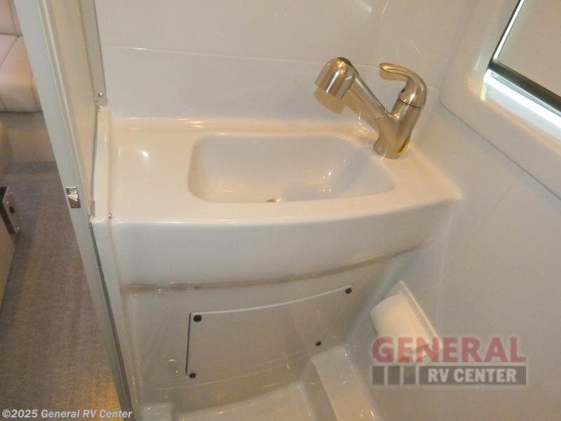 Luxury, functionality and sleeping for two is found in this versatile coach. There are seatbelts for seven for day trips with friends and a power sofa bed for couple's weekends. You will love the two captain's chairs that turn towards the rear for more seating once at your destination, and storage for your clothing is next to the wet bath. The private enclosed wet bath also includes a window and privacy shade. The cook can make meals using the galley kitchen with a farmhouse style sink, combo microwave/convection/air fryer and a two burner propane cooktop.
