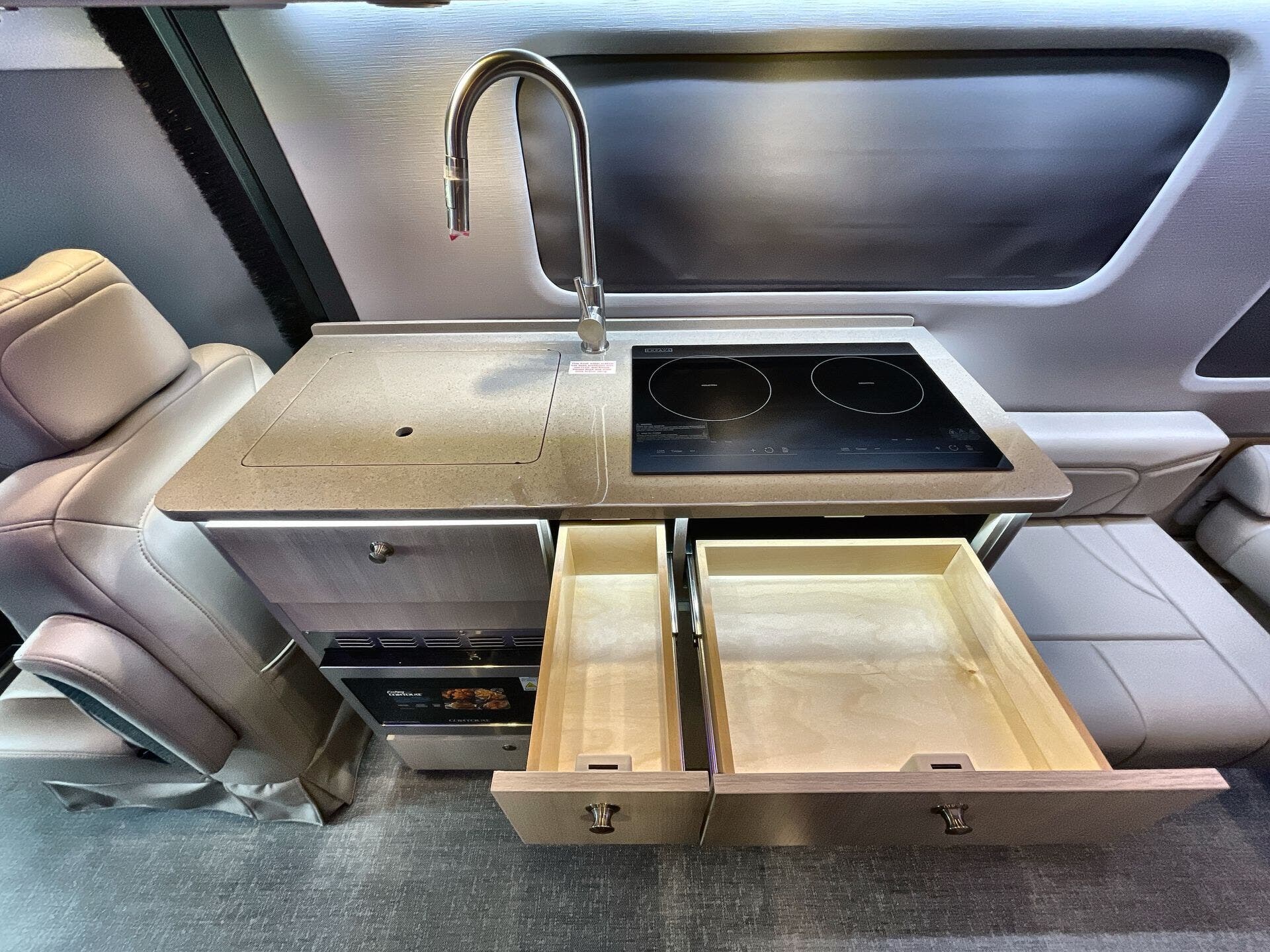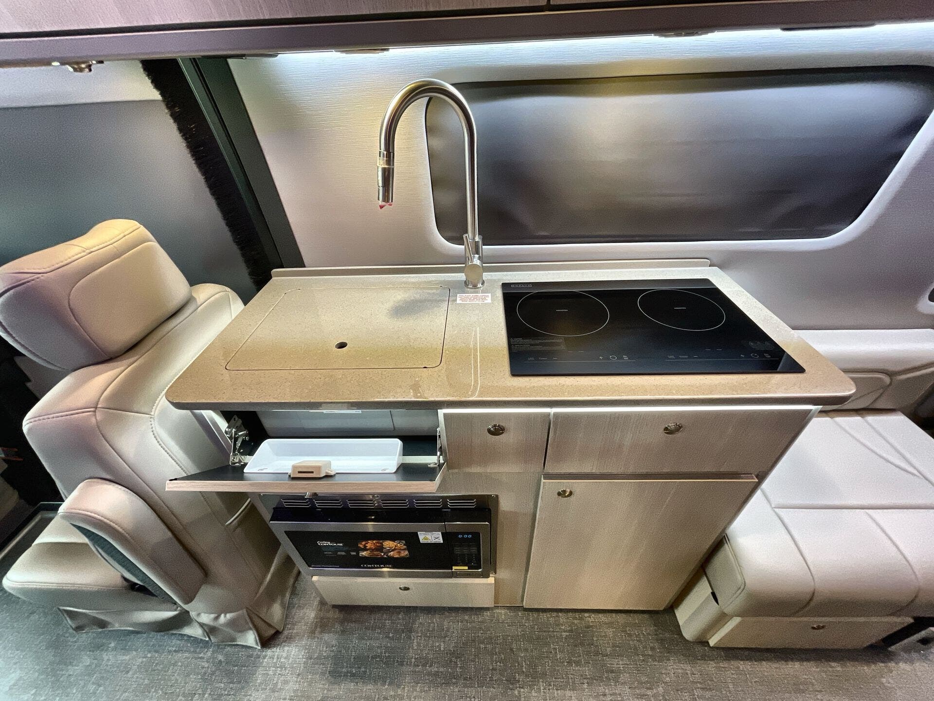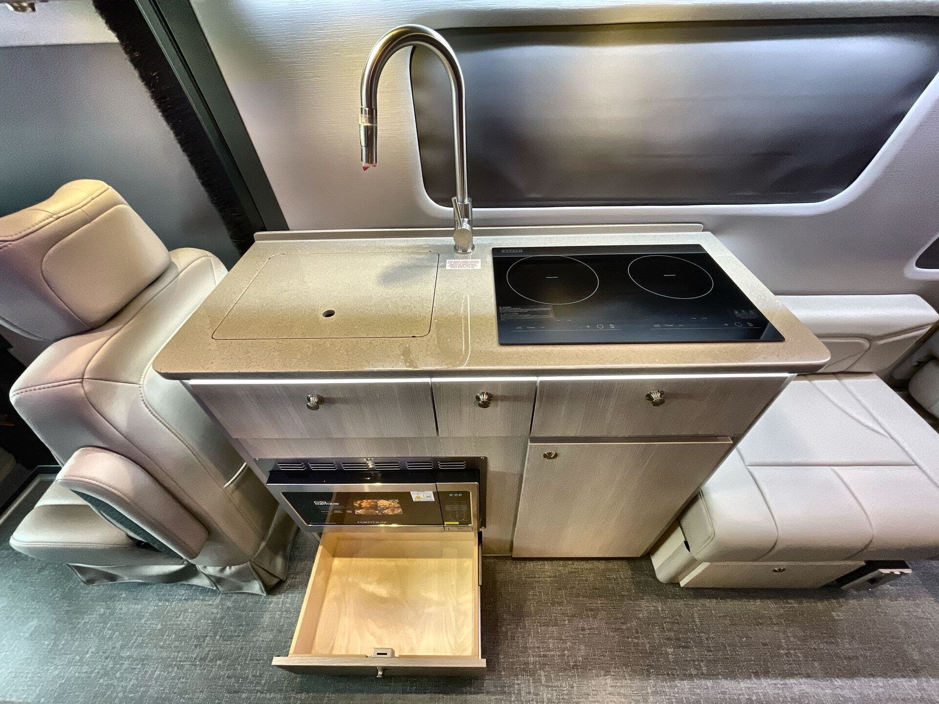 The Strada comes equipped for everyday living and extended trips with a thoughtfully designed galley and essential safety systems. Inside you’ll find a Microwave, Refrigerator, Stove Top Burner, Kitchen Sink, and Overhead Cabinetry that maximize storage and convenience. Climate control is provided by an efficient Air Conditioning system for comfort in all seasons. Safety is prioritized with a CO Detector, Fire Extinguisher, and Smoke Detector, while the electrical system is supported by reliable Batteries and onboard entertainment with a TV. An Awning adds outdoor living space, and the compact layout keeps everything within easy reach for cooking, cleaning, and relaxing on the go.