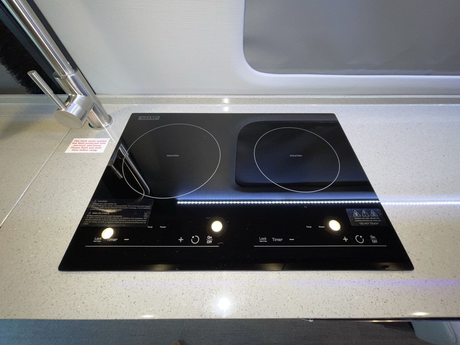 The TOUR-ION floorplan focuses on efficient, livable space across three zones: Front Living Area, Mid Kitchen, and Rear Bedroom. The front lounge area centers around a sofa bed with an removable table and overhead cabinetry, providing flexible seating, dining, and lounging. The mid kitchen is equipped with a stove top burner, microwave, refrigerator, kitchen sink, and ample cabinetry to store essentials. Large windows and roof vents flood the living area with light and airflow, while day/night shades offer privacy at the touch of a button. A private rear bedroom delivers a comfortable retreat after a day on the road.