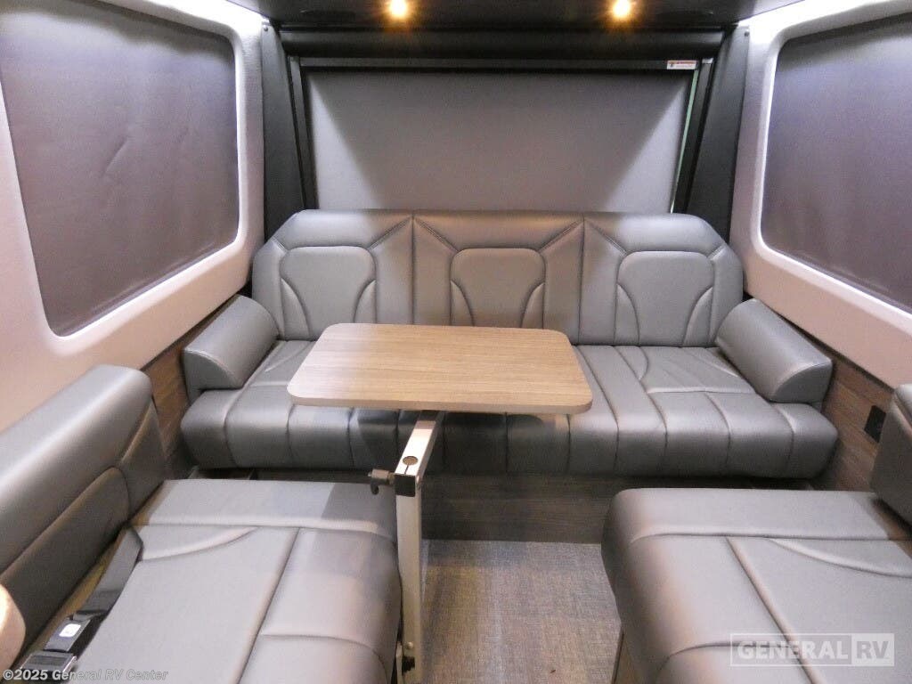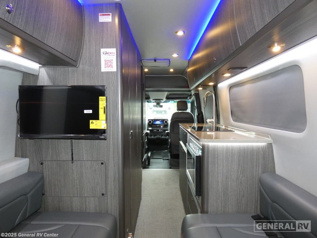 Grech RV Terreno-ion AWD Class B diesel motorhome Tour highlights: Two Captain's Chairs Seats Up To Seven Wardrobe Sleeps Two Power Sofa Bed Enclosed Wet Bath When you want to travel to games, events or for vacations, this coach allows you to in comfort, luxury and with the sophistication you desire! There are two captain's chairs in the cab that swivel towards the rear for more seating once stopped. You will find sleeping space for two on the rear power sofa bed, plus a table with a mount system to dine at with seating for five in the back. Everyone can watch the 24" LED TV with Apple TV, and enjoy the premium sound system, the USB and 110V charging ports for your electronics, plus the galley kitchen amenities. There is a farmhouse style sink with a faucet and pull-out sprayer, plus the combo microwave/convection/Air Fryer and the induction cooktop allow the chef to make warm meals for everyone. The enclosed private wet bath provides a window and privacy shade, a molded sink with a vanity mirror, a handheld showerhead, a ceramic toilet with foot flush and a retractable clothes line to dry your towels and swimsuits. With each Terreno-ion AWD Class B diesel motorhome by Grech RV, you can travel in complete luxury. The Grech Power system with a Lithionics 51V battery system will make going off-grid easier than ever. This system also features a Garmin SERV+ house control system, a Victron Blue Power 3,000W smart inverter, a roof-mounted solar panel system, and more features to keep you powered up! You will also appreciate the all-wheel drive and the air suspension for the smoothest ride out there. A Timberline System provides continuous flow of hot water, which is fueled by the Sprinter fuel, and there is a 15,000 BTU Gree-Eco-Cool A/C with a heat pump to keep you cool during the summer. Head inside to enjoy the LED ambient accent lighting, vinyl woven flooring, solid surface kitchen countertop, and many more comforts.