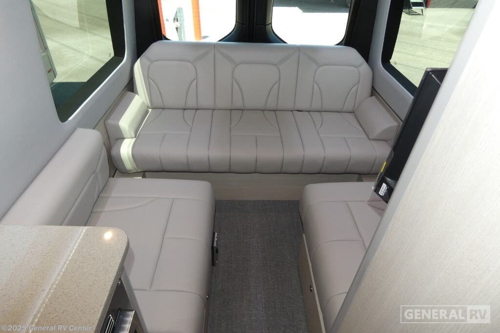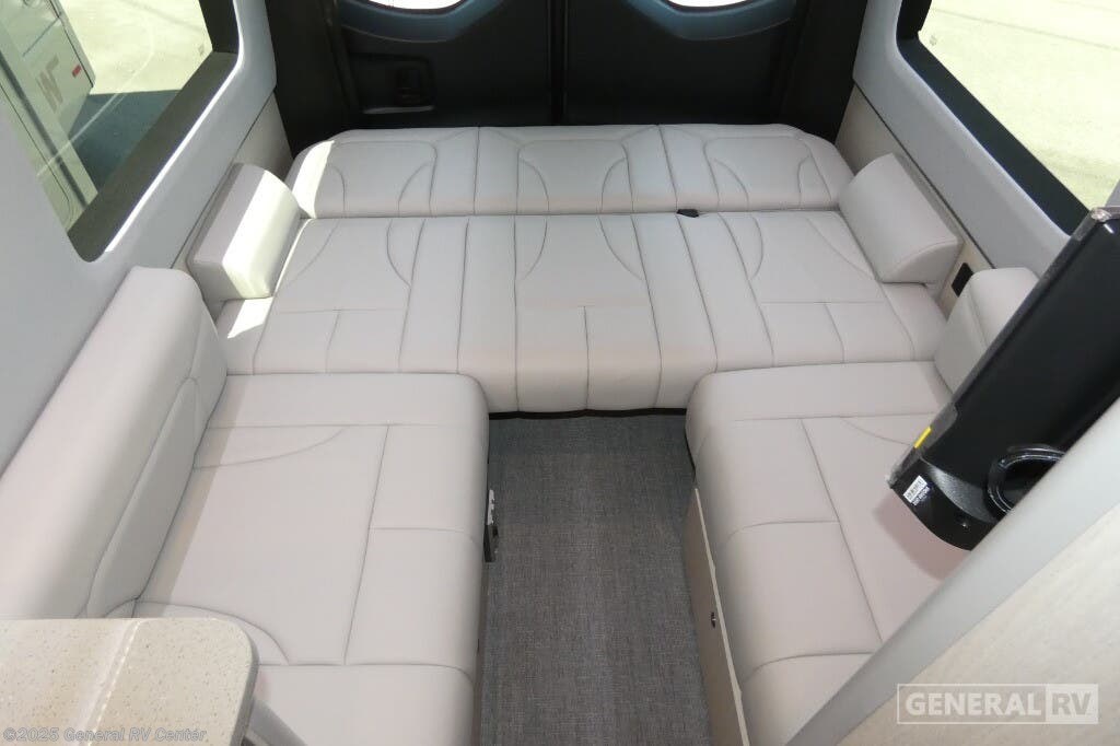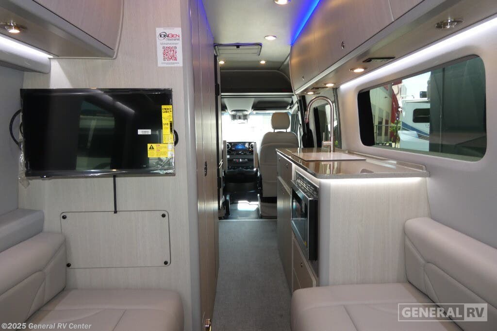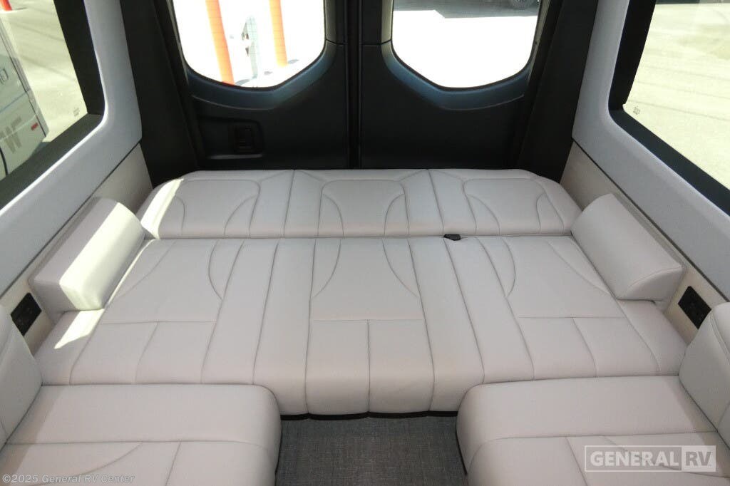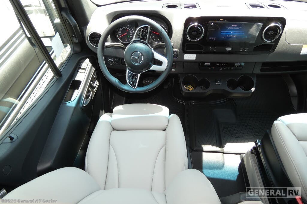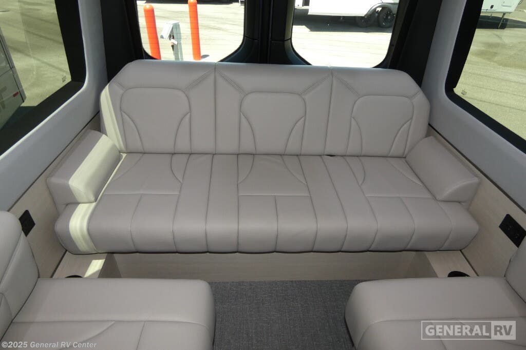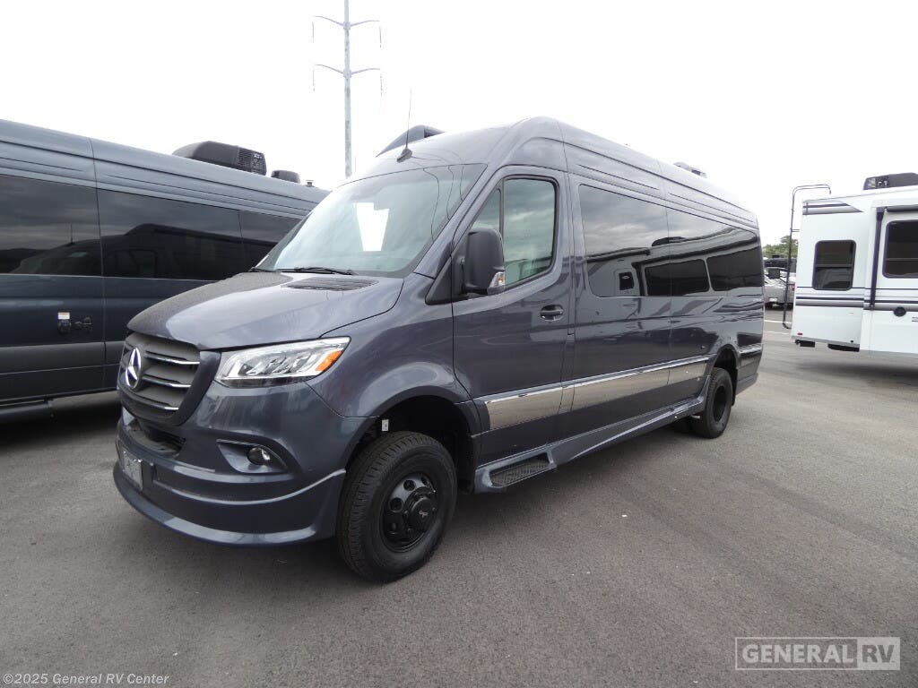 Grech RV Terreno-ion AWD Class B diesel motorhome Tour highlights: Two Captain's Chairs Seats Up To Seven Wardrobe Sleeps Two Power Sofa Bed Enclosed Wet Bath When you want to travel to games, events or for vacations, this coach allows you to in comfort, luxury and with the sophistication you desire! There are two captain's chairs in the cab that swivel towards the rear for more seating once stopped. You will find sleeping space for two on the rear power sofa bed, plus a table with a mount system to dine at with seating for five in the back. Everyone can watch the 24" LED TV with Apple TV, and enjoy the premium sound system, the USB and 110V charging ports for your electronics, plus the galley kitchen amenities. There is a farmhouse style sink with a faucet and pull-out sprayer, plus the combo microwave/convection/Air Fryer and the induction cooktop allow the chef to make warm meals for everyone. The enclosed private wet bath provides a window and privacy shade, a molded sink with a vanity mirror, a handheld showerhead, a ceramic toilet with foot flush and a retractable clothes line to dry your towels and swimsuits. With each Terreno-ion AWD Class B diesel motorhome by Grech RV, you can travel in complete luxury. The Grech Power system with a Lithionics 51V battery system will make going off-grid easier than ever. This system also features a Garmin SERV+ house control system, a Victron Blue Power 3,000W smart inverter, a roof-mounted solar panel system, and more features to keep you powered up! You will also appreciate the all-wheel drive and the air suspension for the smoothest ride out there. A Timberline System provides continuous flow of hot water, which is fueled by the Sprinter fuel, and there is a 15,000 BTU Gree-Eco-Cool A/C with a heat pump to keep you cool during the summer. Head inside to enjoy the LED ambient accent lighting, vinyl woven flooring, solid surface kitchen countertop, and many more comforts.
