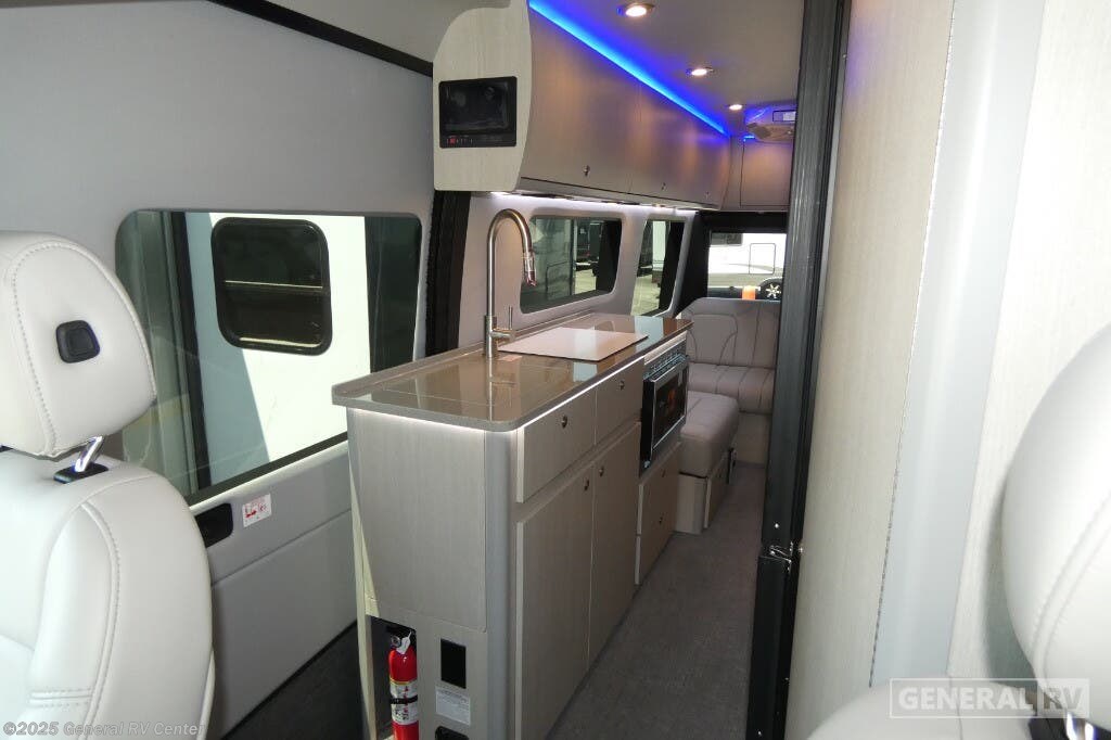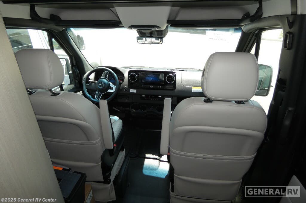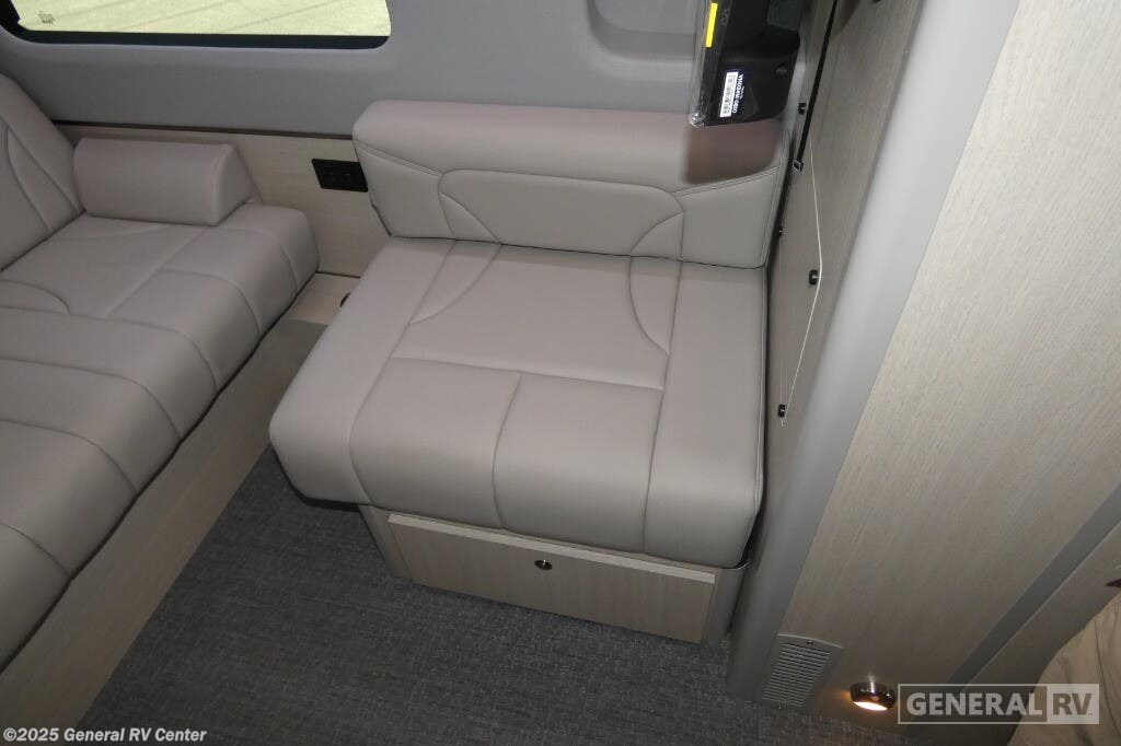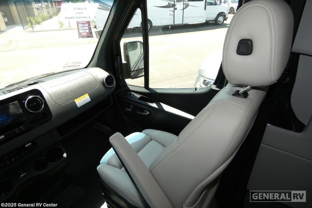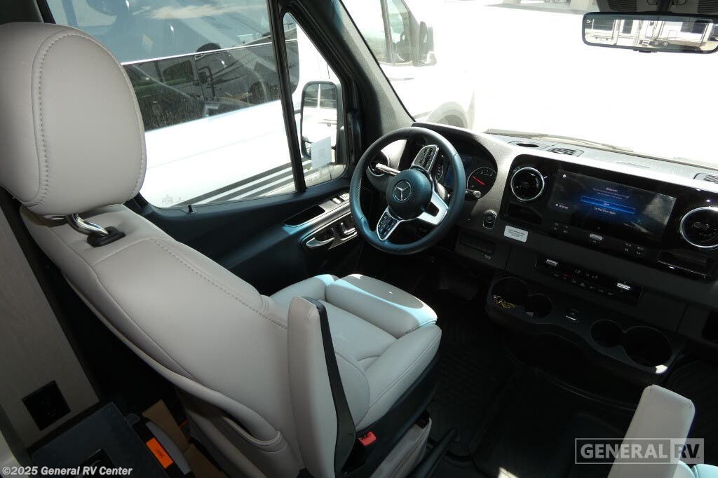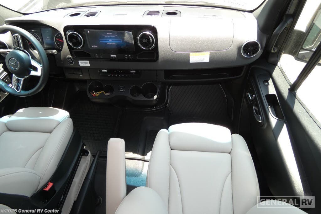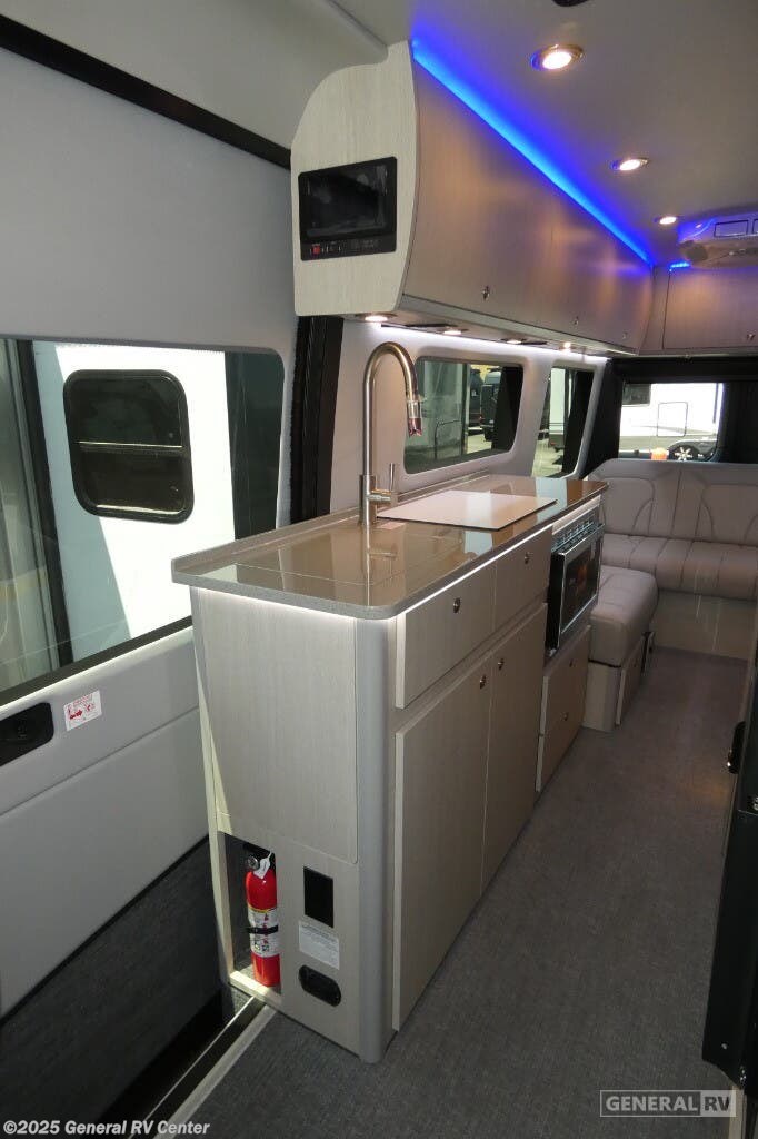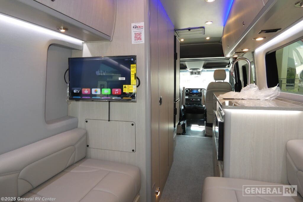 Grech RV Terreno-ion AWD Class B diesel motorhome Tour highlights: Two Captain's Chairs Seats Up To Seven Wardrobe Sleeps Two Power Sofa Bed Enclosed Wet Bath When you want to travel to games, events or for vacations, this coach allows you to in comfort, luxury and with the sophistication you desire! There are two captain's chairs in the cab that swivel towards the rear for more seating once stopped. You will find sleeping space for two on the rear power sofa bed, plus a table with a mount system to dine at with seating for five in the back. Everyone can watch the 24" LED TV with Apple TV, and enjoy the premium sound system, the USB and 110V charging ports for your electronics, plus the galley kitchen amenities. There is a farmhouse style sink with a faucet and pull-out sprayer, plus the combo microwave/convection/Air Fryer and the induction cooktop allow the chef to make warm meals for everyone. The enclosed private wet bath provides a window and privacy shade, a molded sink with a vanity mirror, a handheld showerhead, a ceramic toilet with foot flush and a retractable clothes line to dry your towels and swimsuits. With each Terreno-ion AWD Class B diesel motorhome by Grech RV, you can travel in complete luxury. The Grech Power system with a Lithionics 51V battery system will make going off-grid easier than ever. This system also features a Garmin SERV+ house control system, a Victron Blue Power 3,000W smart inverter, a roof-mounted solar panel system, and more features to keep you powered up! You will also appreciate the all-wheel drive and the air suspension for the smoothest ride out there. A Timberline System provides continuous flow of hot water, which is fueled by the Sprinter fuel, and there is a 15,000 BTU Gree-Eco-Cool A/C with a heat pump to keep you cool during the summer. Head inside to enjoy the LED ambient accent lighting, vinyl woven flooring, solid surface kitchen countertop, and many more comforts.