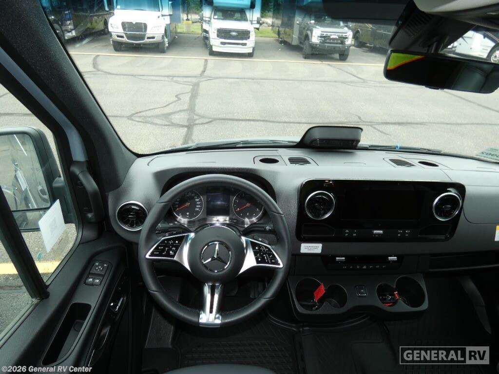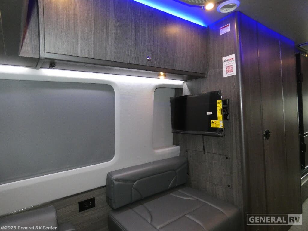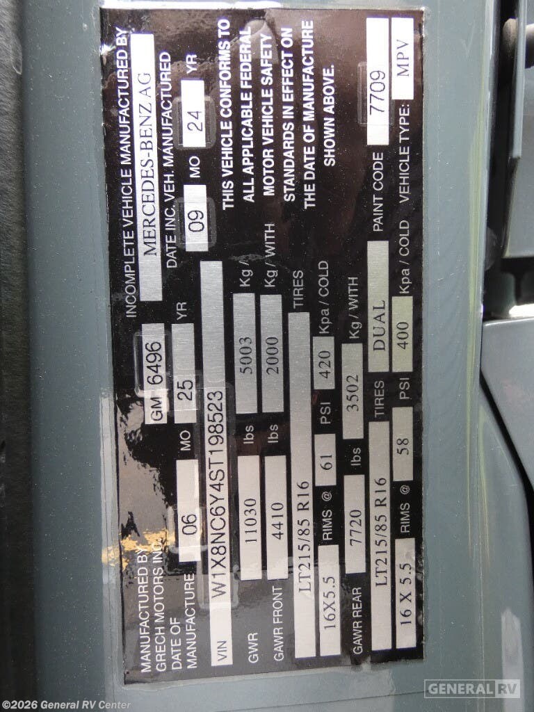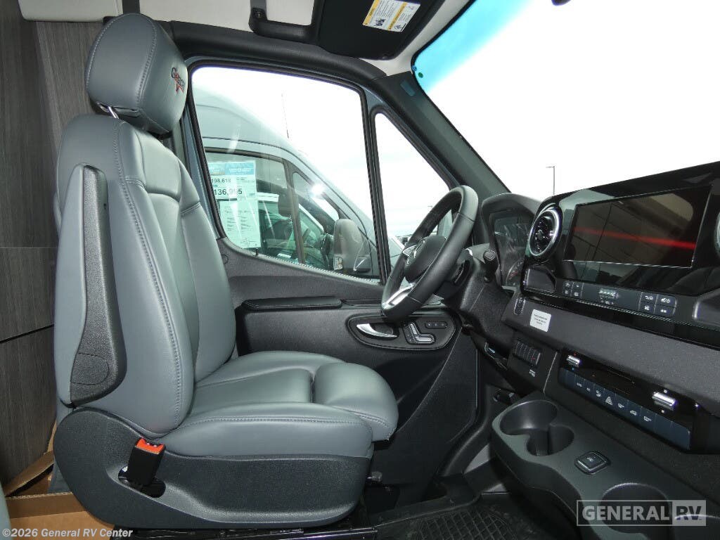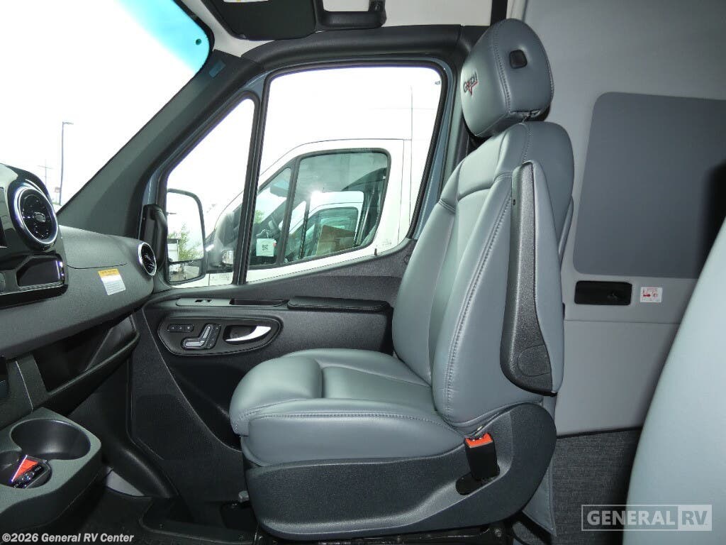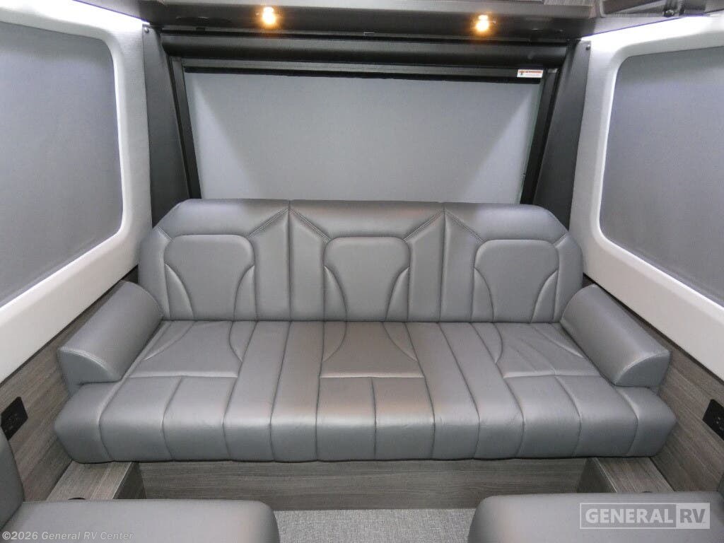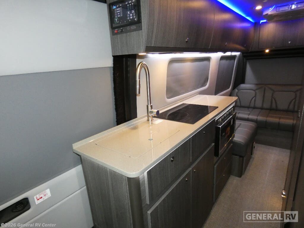 Grech RV Terreno-ion AWD Class B diesel motorhome Tour highlights: Two Captain's Chairs Seats Up To Seven Wardrobe Sleeps Two Power Sofa Bed Enclosed Wet Bath When you want to travel to games, events or for vacations, this coach allows you to in comfort, luxury and with the sophistication you desire! There are two captain's chairs in the cab that swivel towards the rear for more seating once stopped. You will find sleeping space for two on the rear power sofa bed, plus a table with a mount system to dine at with seating for five in the back. Everyone can watch the 24" LED TV with Apple TV, and enjoy the premium sound system, the USB and 110V charging ports for your electronics, plus the galley kitchen amenities. There is a farmhouse style sink with a faucet and pull-out sprayer, plus the combo microwave/convection/Air Fryer and the induction cooktop allow the chef to make warm meals for everyone. The enclosed private wet bath provides a window and privacy shade, a molded sink with a vanity mirror, a handheld showerhead, a ceramic toilet with foot flush and a retractable clothes line to dry your towels and swimsuits. With each Terreno-ion AWD Class B diesel motorhome by Grech RV, you can travel in complete luxury. The Grech Power system with a Lithionics 51V battery system will make going off-grid easier than ever. This system also features a Garmin SERV+ house control system, a Victron Blue Power 3,000W smart inverter, a roof-mounted solar panel system, and more features to keep you powered up! You will also appreciate the all-wheel drive and the air suspension for the smoothest ride out there. A Timberline System provides continuous flow of hot water, which is fueled by the Sprinter fuel, and there is a 15,000 BTU Gree-Eco-Cool A/C with a heat pump to keep you cool during the summer. Head inside to enjoy the LED ambient accent lighting, vinyl woven flooring, solid surface kitchen countertop, and many more comforts.