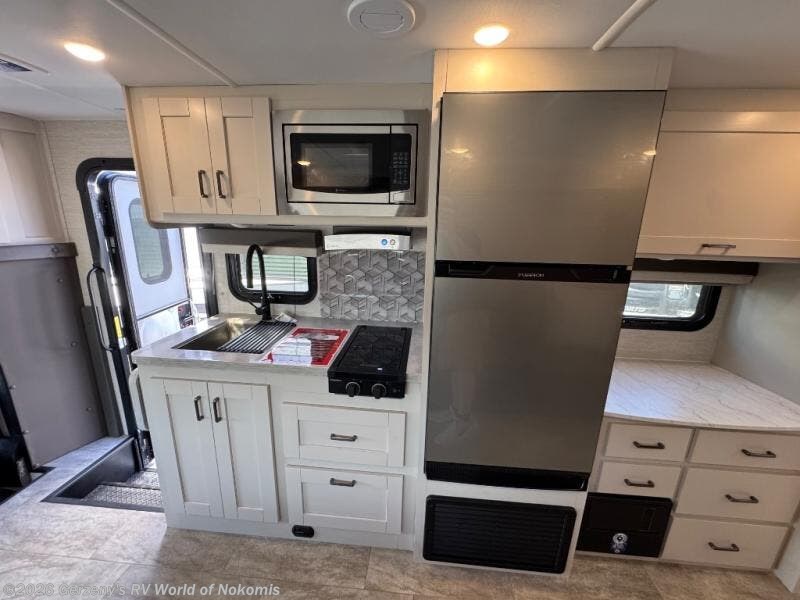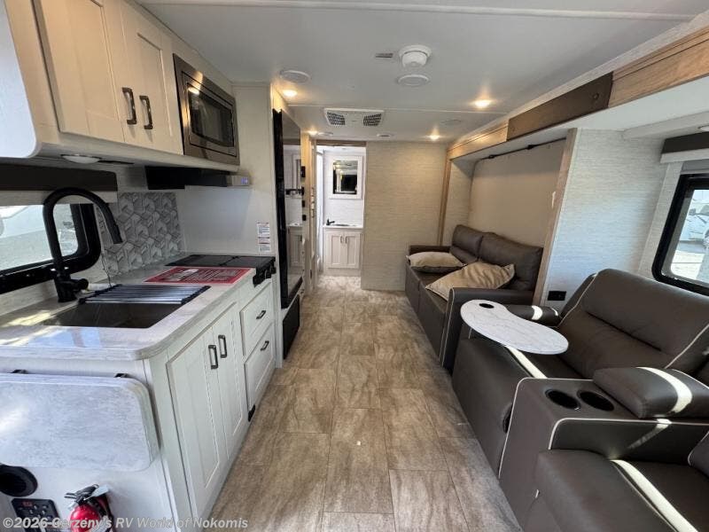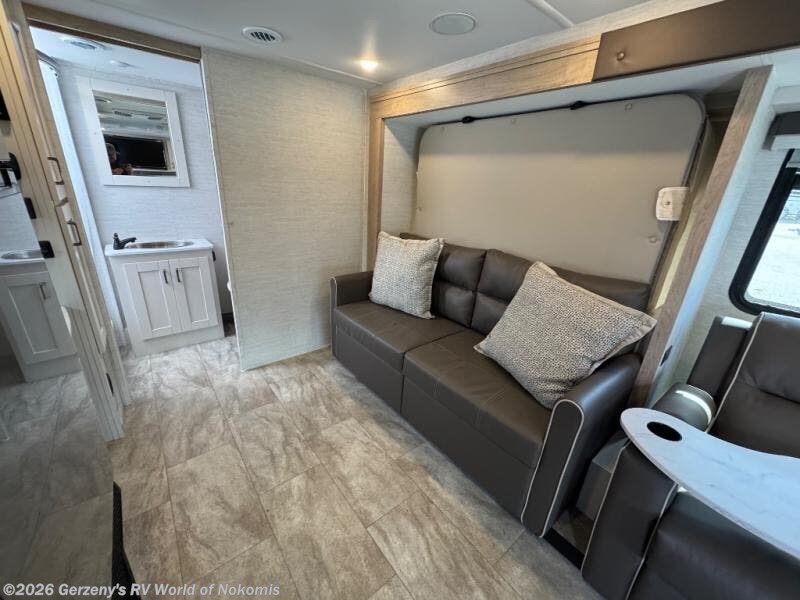 This versatile coach is ready for adventure when you are! You will love the full-wall slide that holds the booth dinette and 60" x 74" Murphy bed. Once the bed is folded up, you will enjoy the 60" electric sofa with arms. A full rear bath includes a spacious shower, toilet, vanity, plus a wardrobe and linen closet for clean towels. In the morning, you can make breakfast on the three burner range or in the microwave oven, and there is an 8 cu. ft. 12V double door refrigerator and a pantry for food storage.