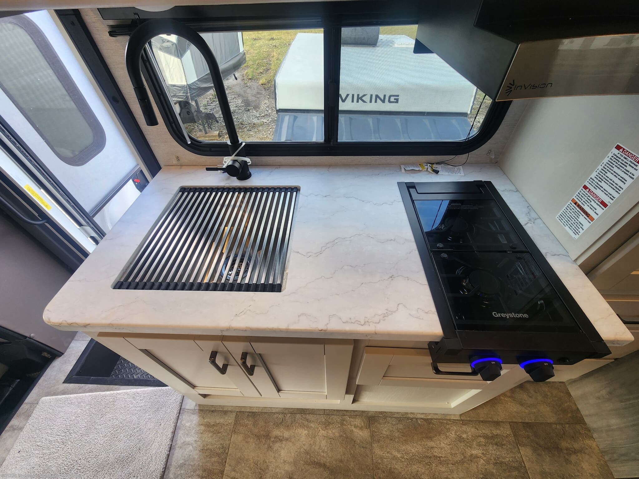Meal prep is a breeze with a complete kitchen lineup that includes a convection microwave, microwave, oven, stove top burner, and a refrigerator for convenient storage. For airflow and temperature comfort, enjoy air conditioning (1 unit) plus a Fantastic Fan to keep the cabin feeling fresh.